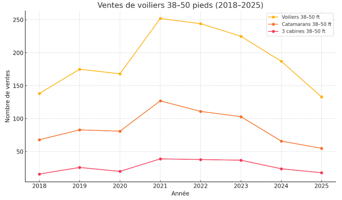 Le marché annuel mondial des catamarans 38–50 pieds de moins de 10 ans est estimé à environ 300 unités vendues, avec une part croissante de versions propriétaire 3 cabines.