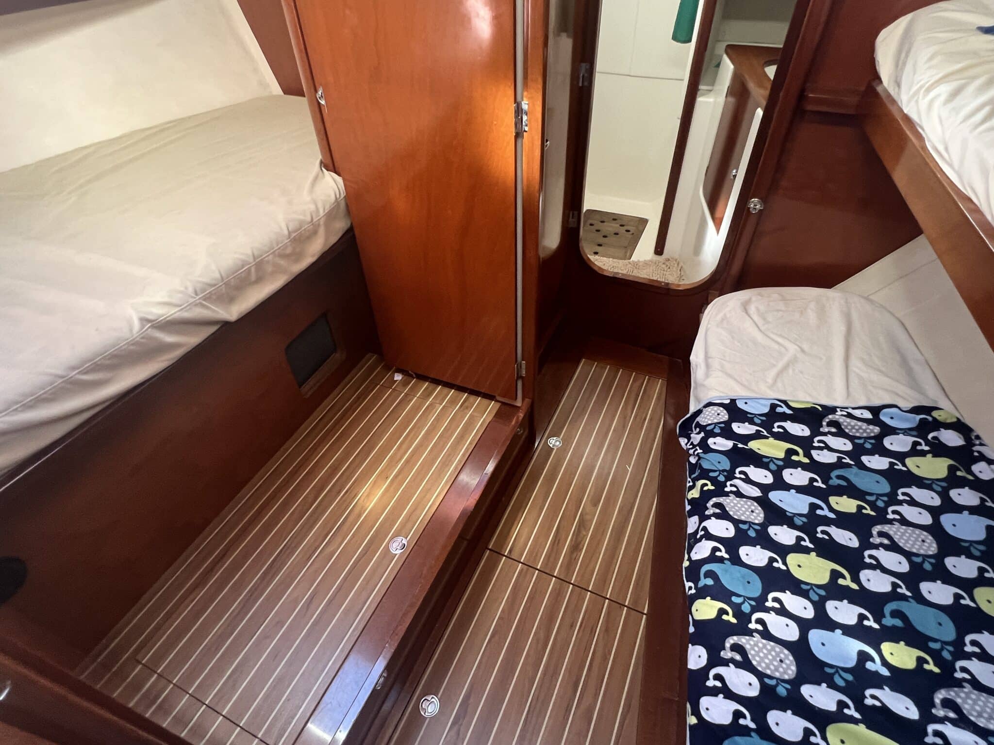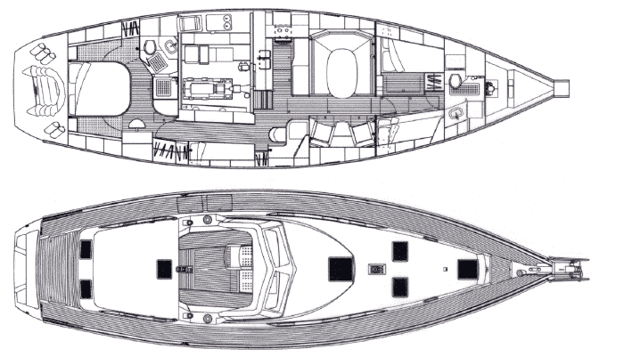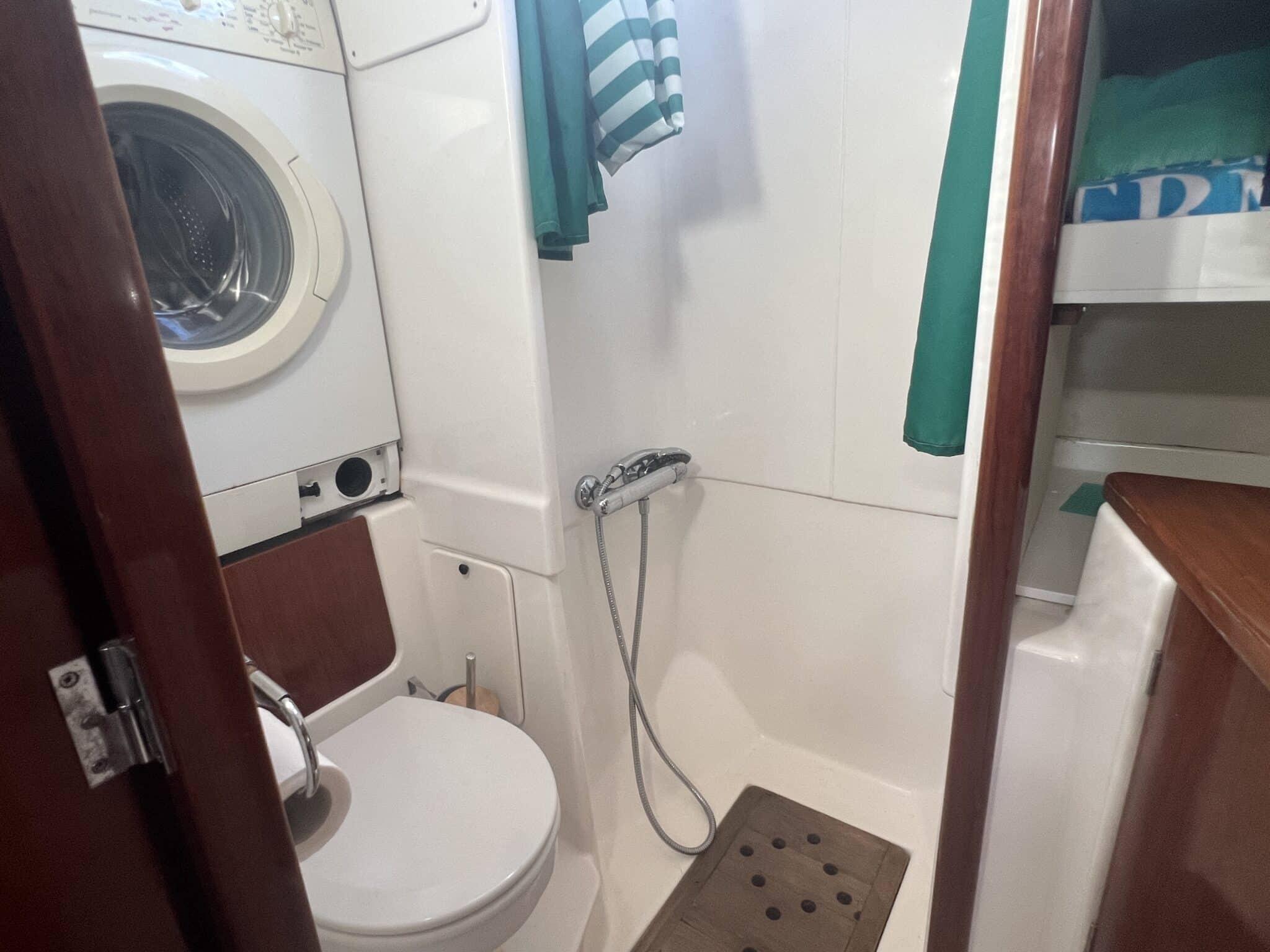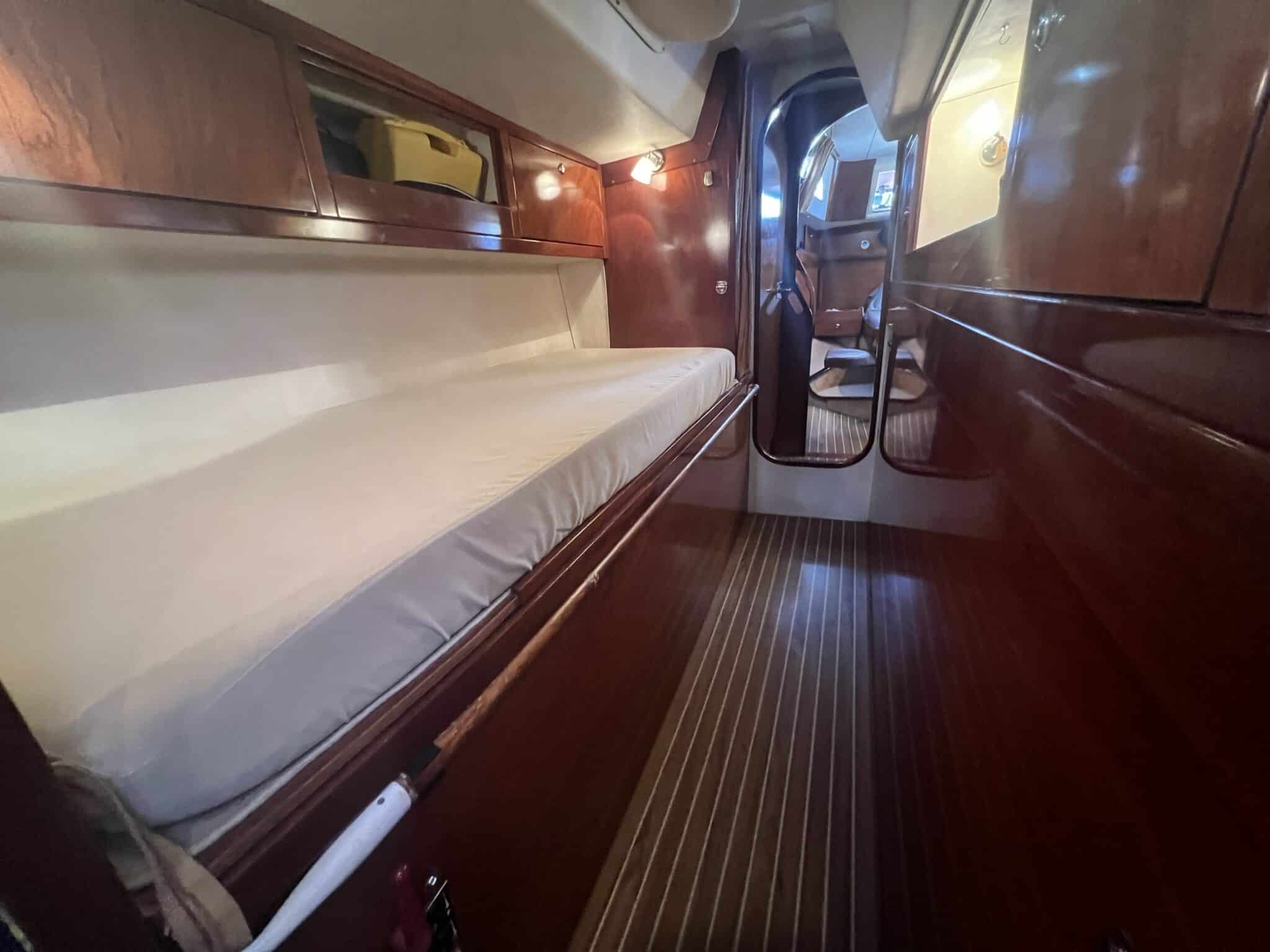 À l’avant, la cabine invités aux dimensions généreuses peut être divisée en deux cabines séparées avec un lit double à bâbord et des lits jumeaux à tribord. Salle d’eau avec douche séparée et lave-linge.
