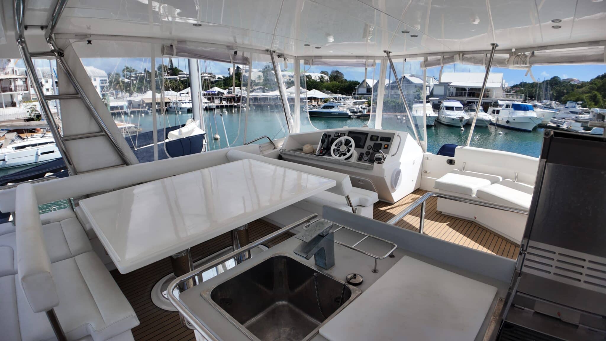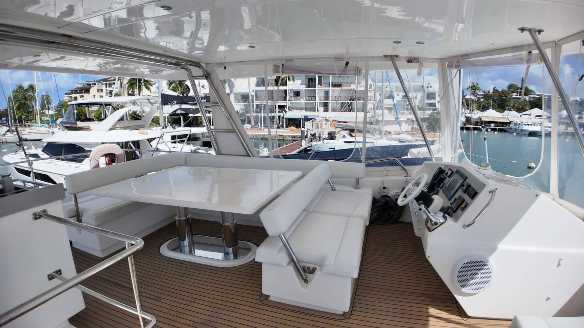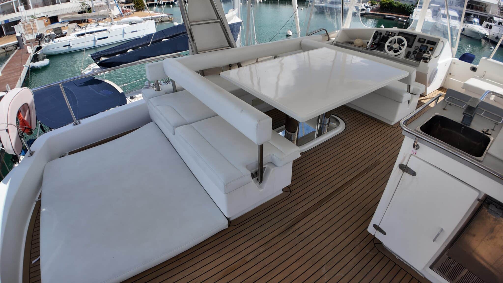 Immense flying bridge avec coin bar accessible depuis le cockpit arrière par un escalier
