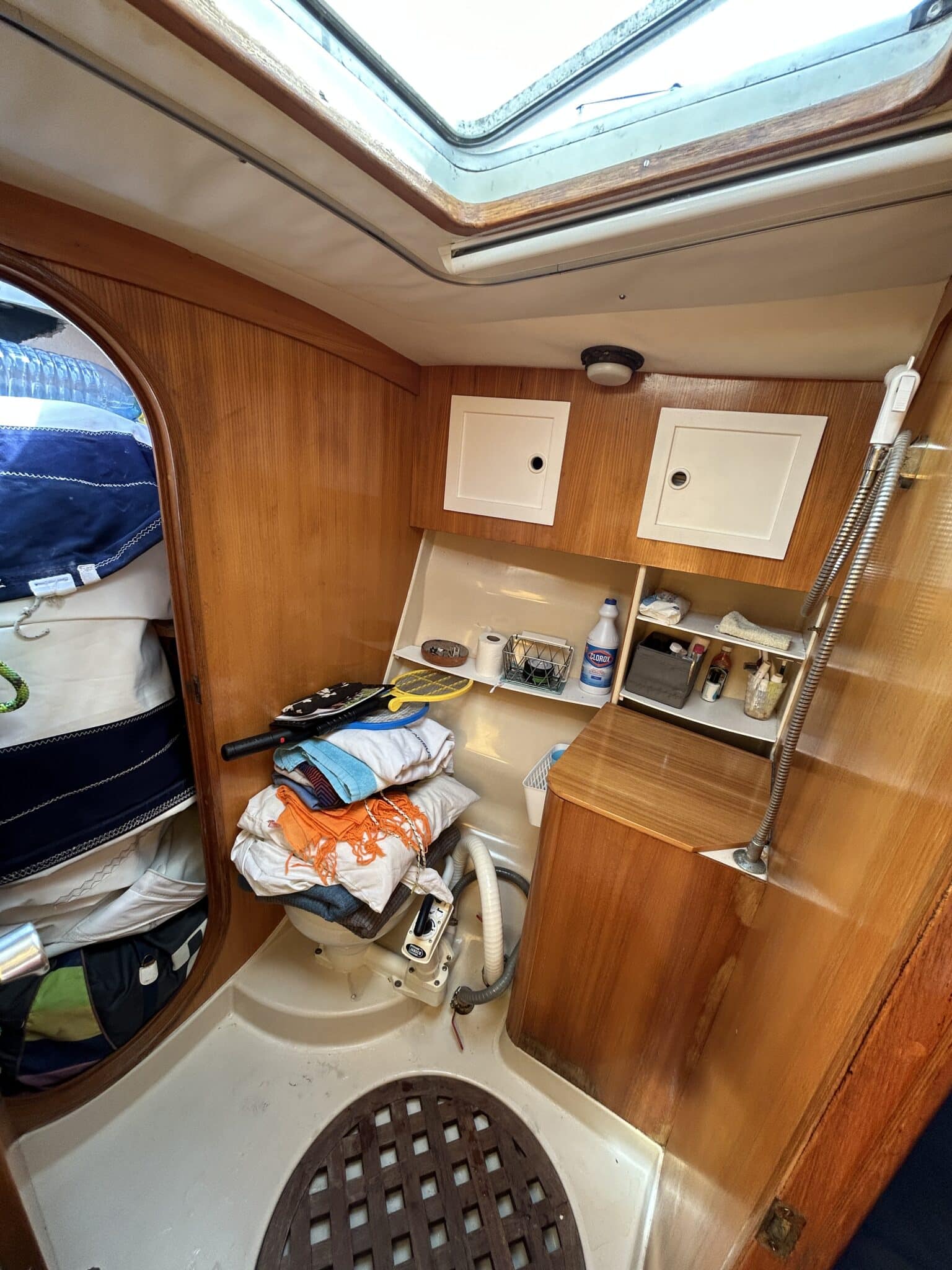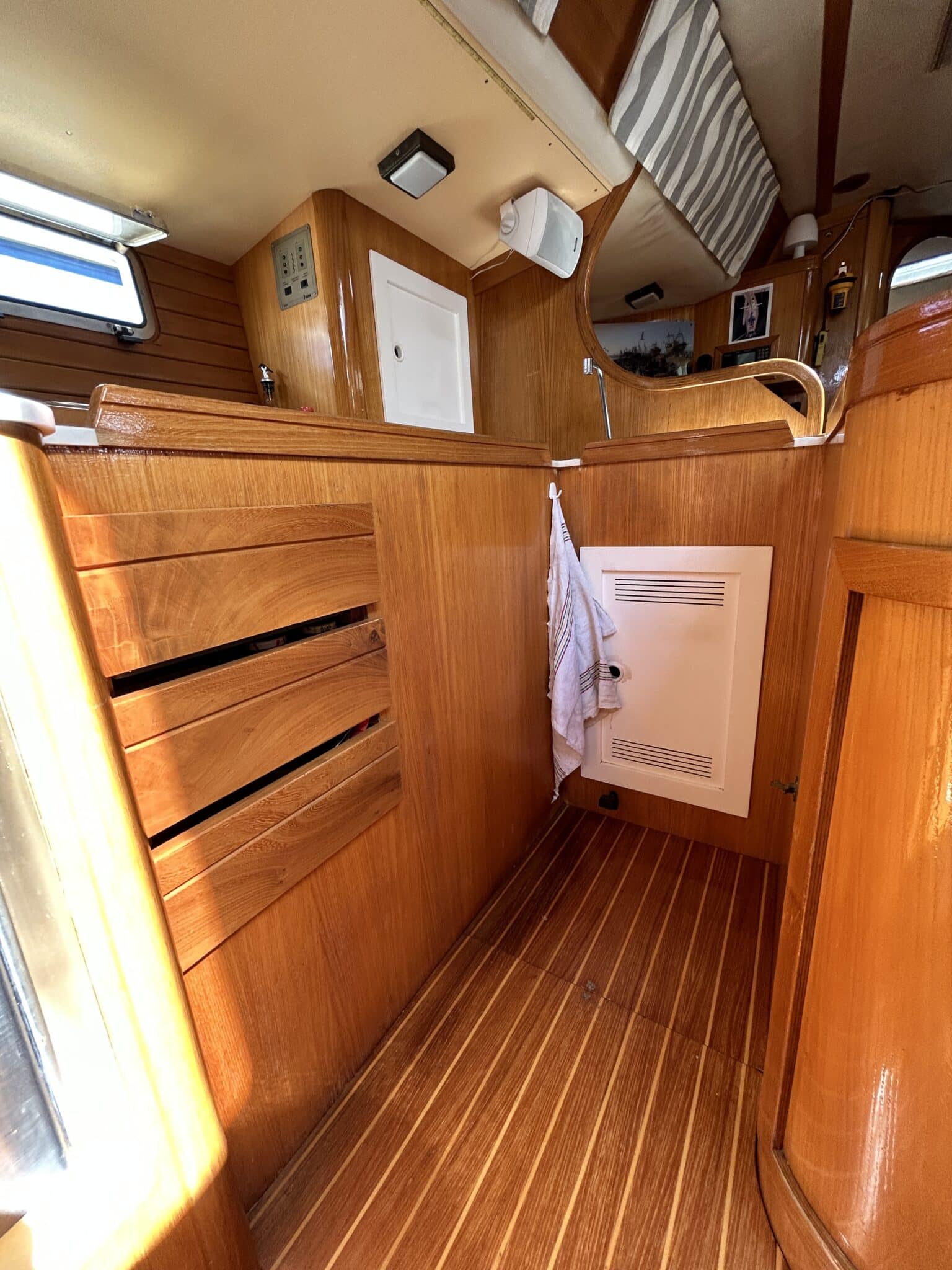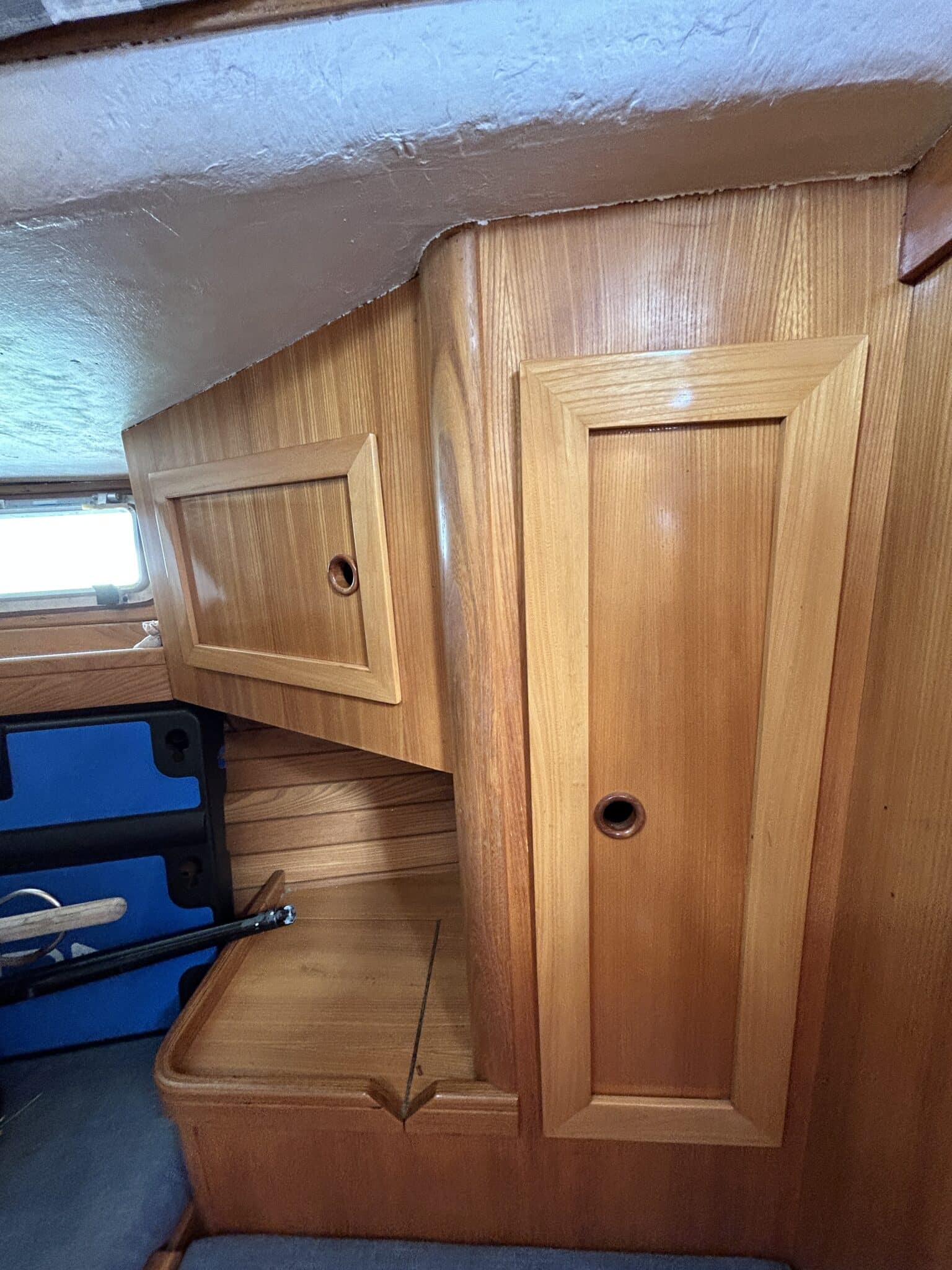 Cabinet de toilette avant et accès soute à voile par l’intérieur (et par hublot)