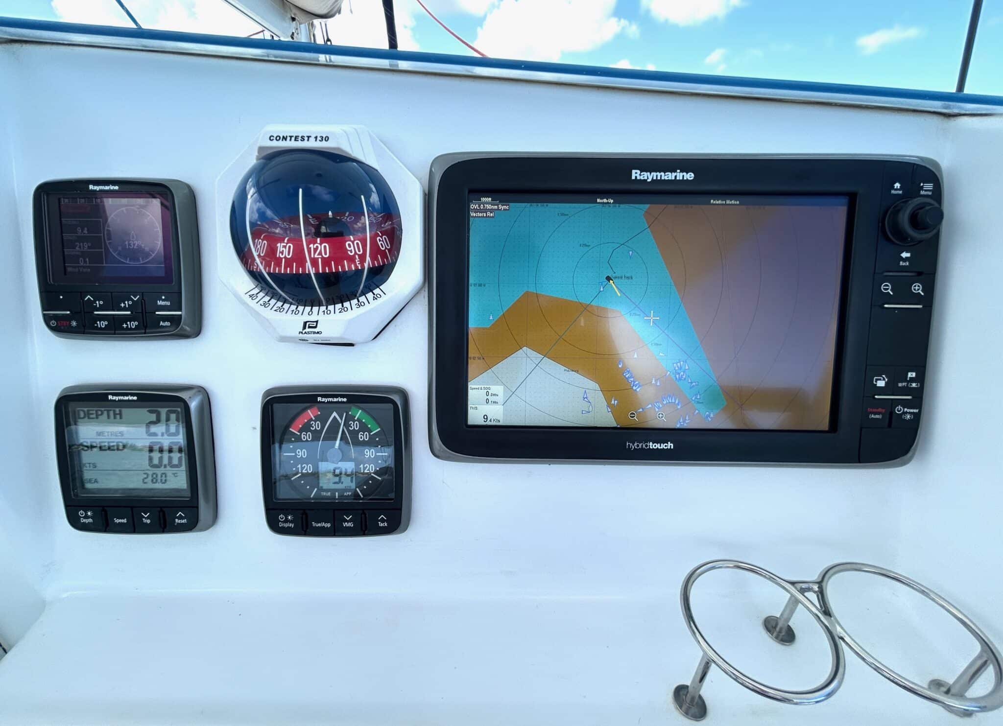 Traceur GPS Raymarine 12″ Hybrid touch (installé en 2023) – carte SD Méditerranée uniquement (navigation aux Caraïbes via iPad avec Navionics non inclus)