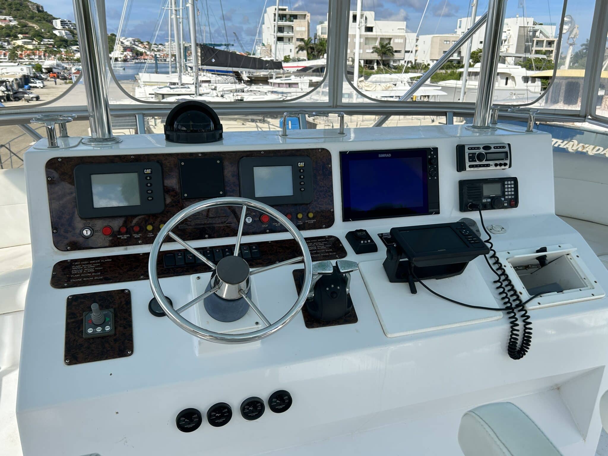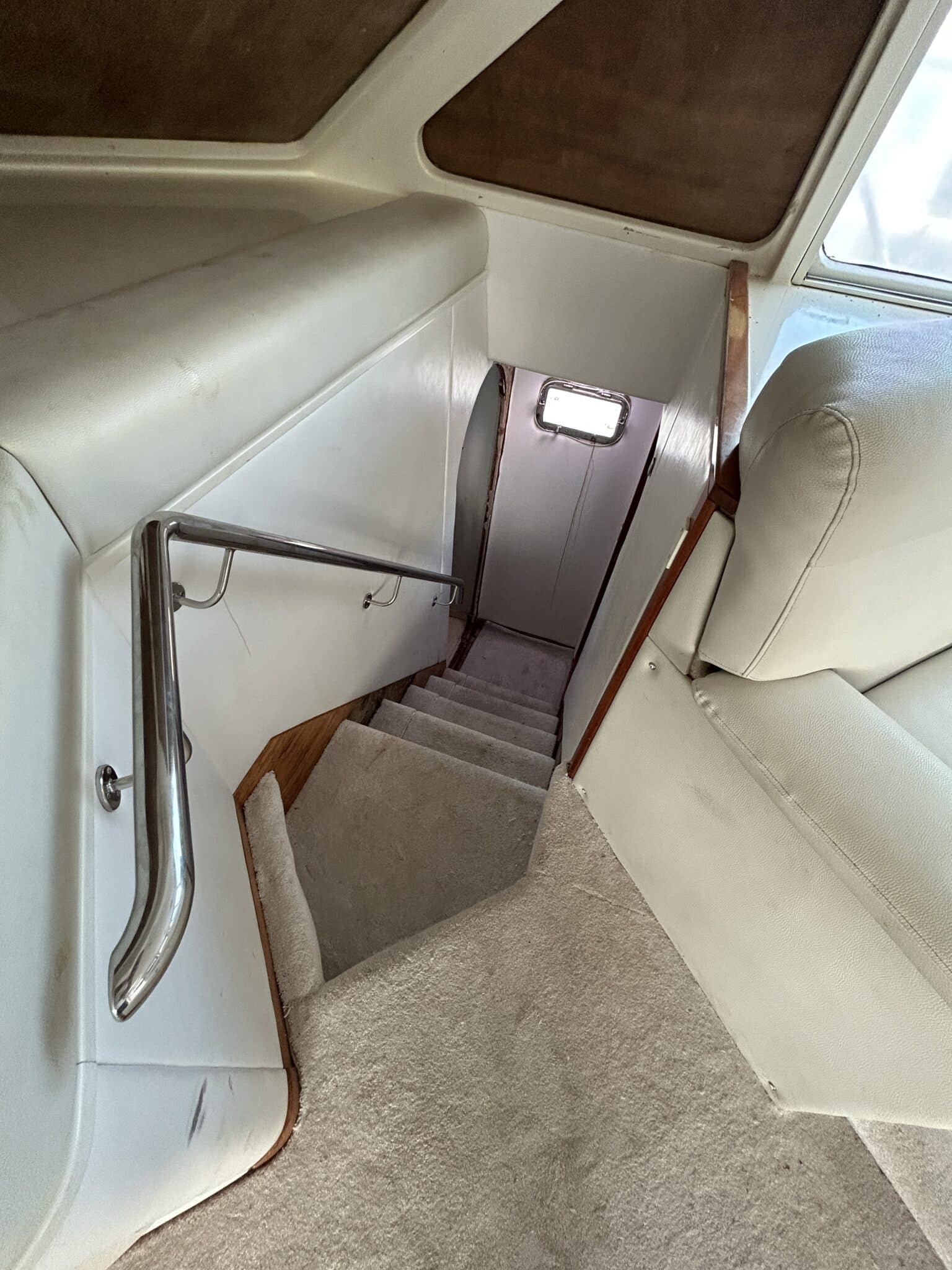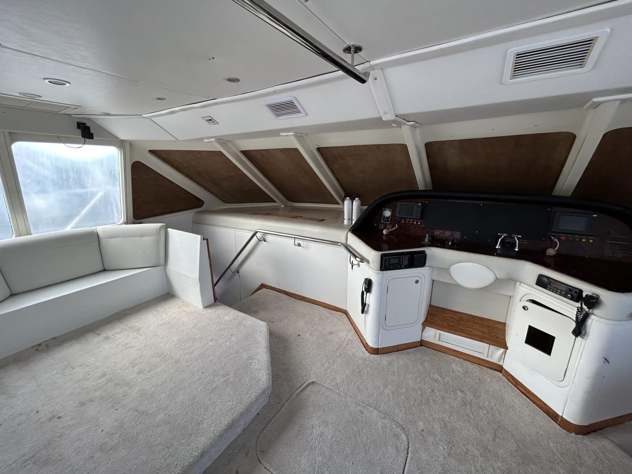 Une station de navigation complète le salon principal avec des escaliers vers le bas à bâbord et à tribord.