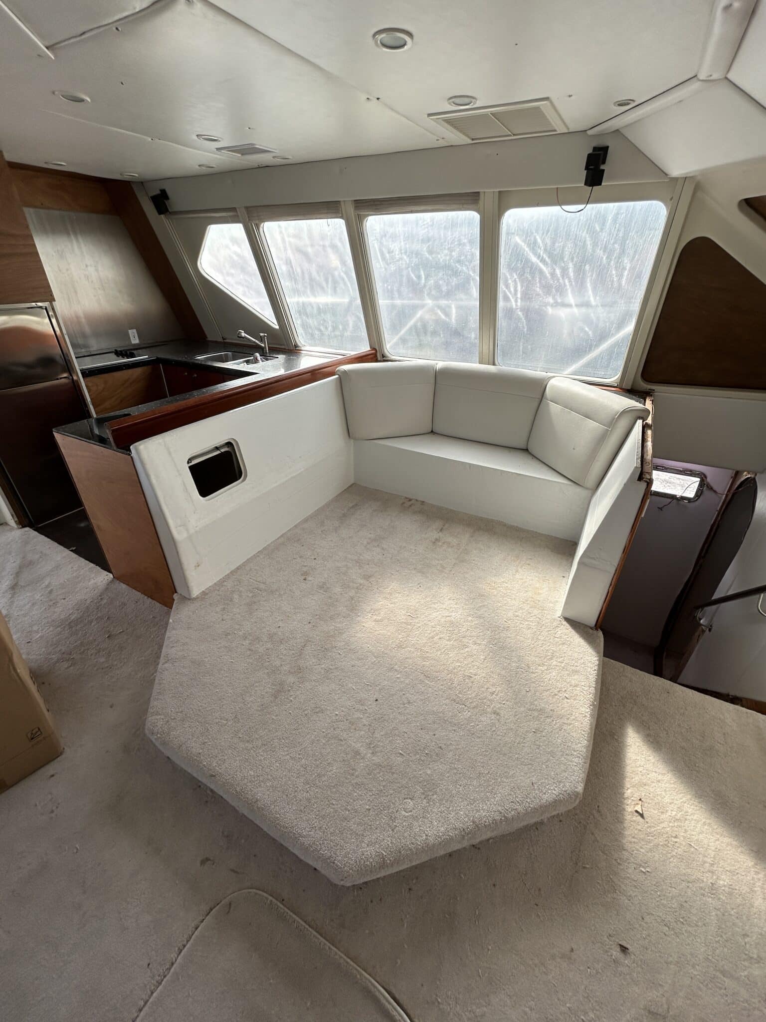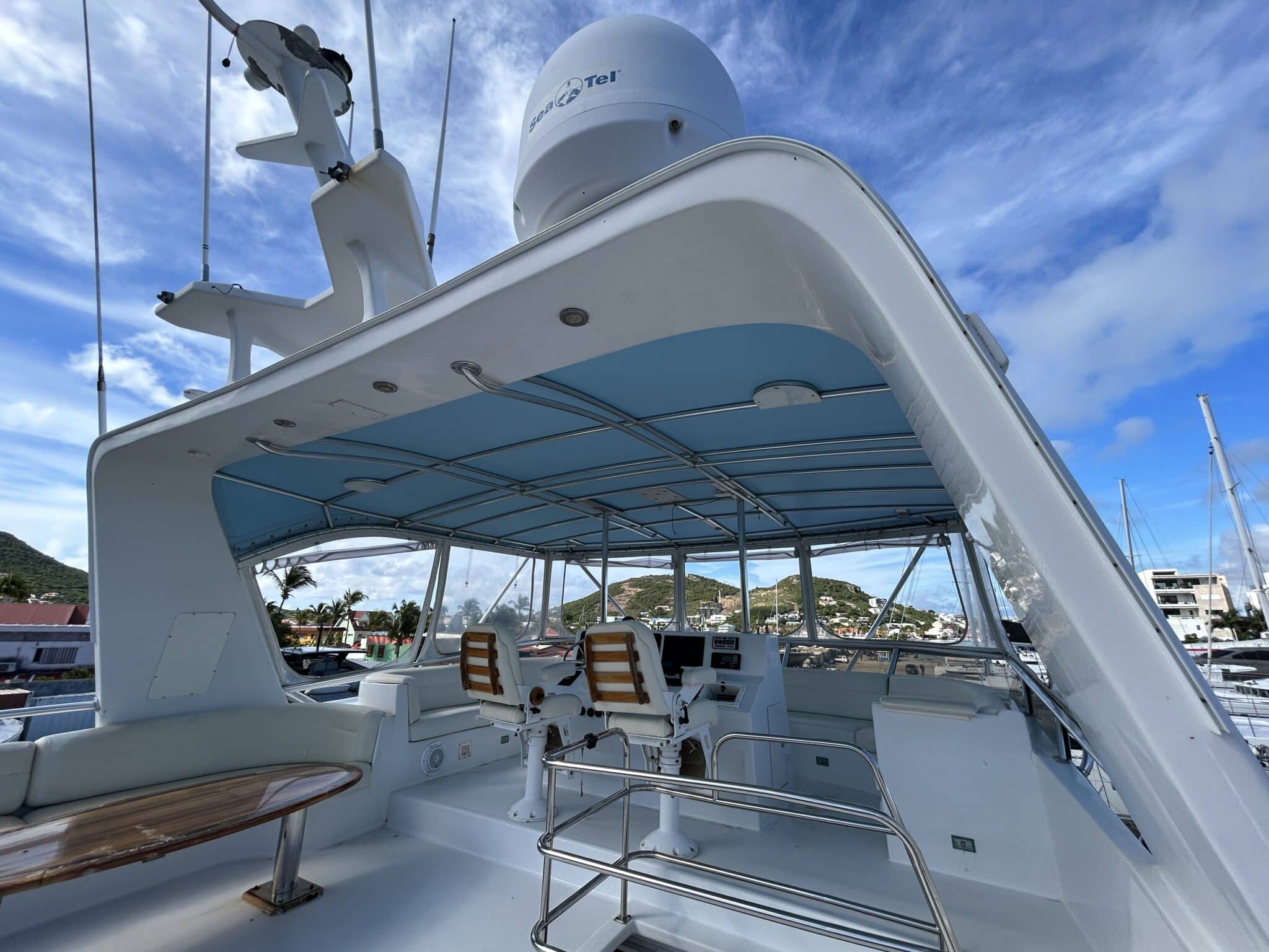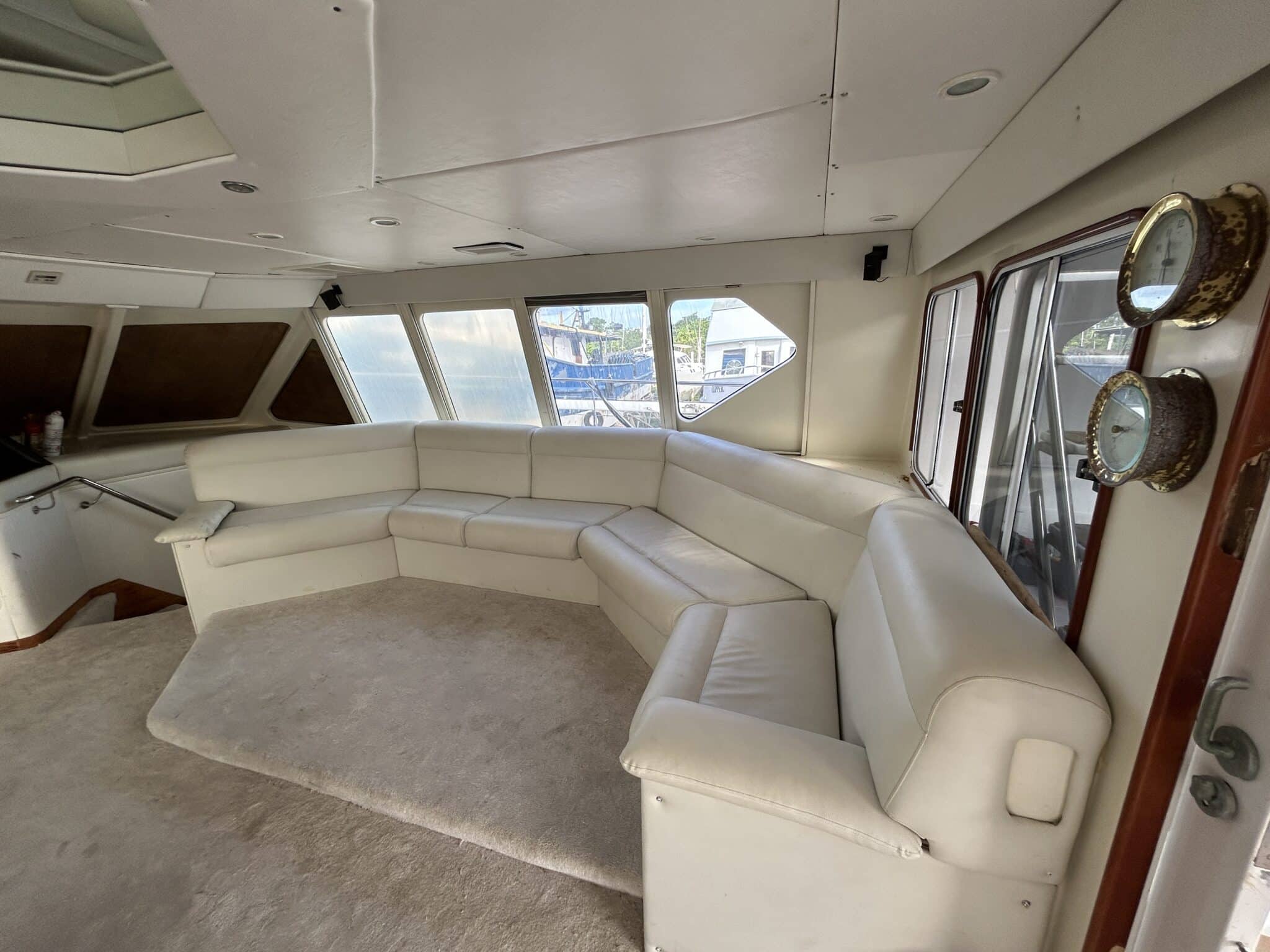 Une station de navigation complète le salon principal avec des escaliers vers le bas à bâbord et à tribord.