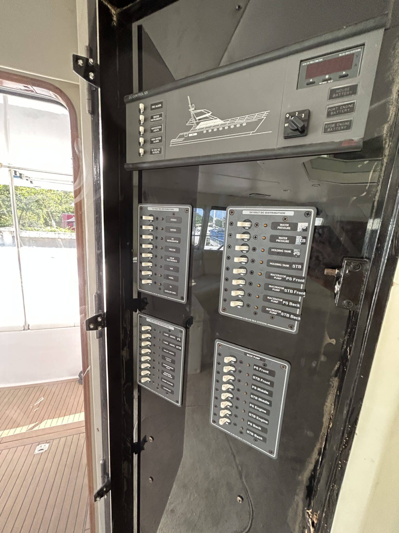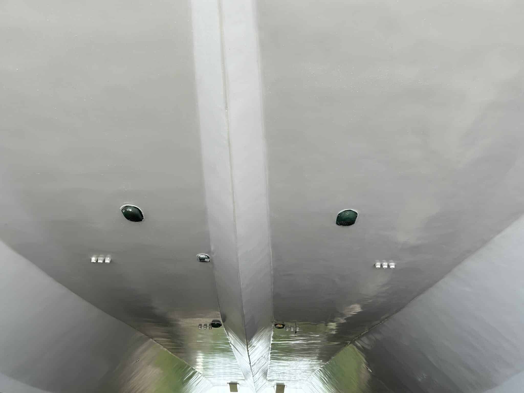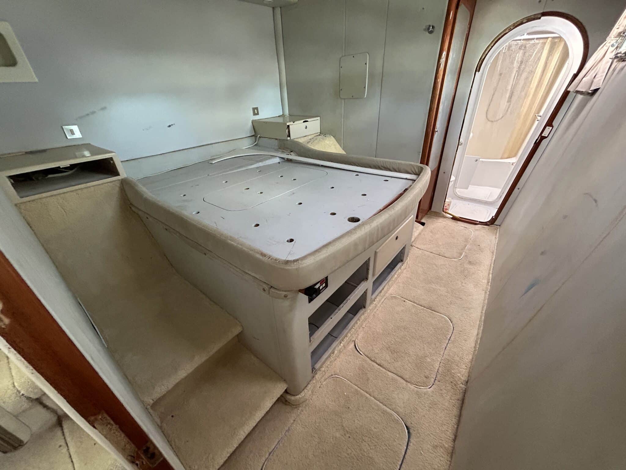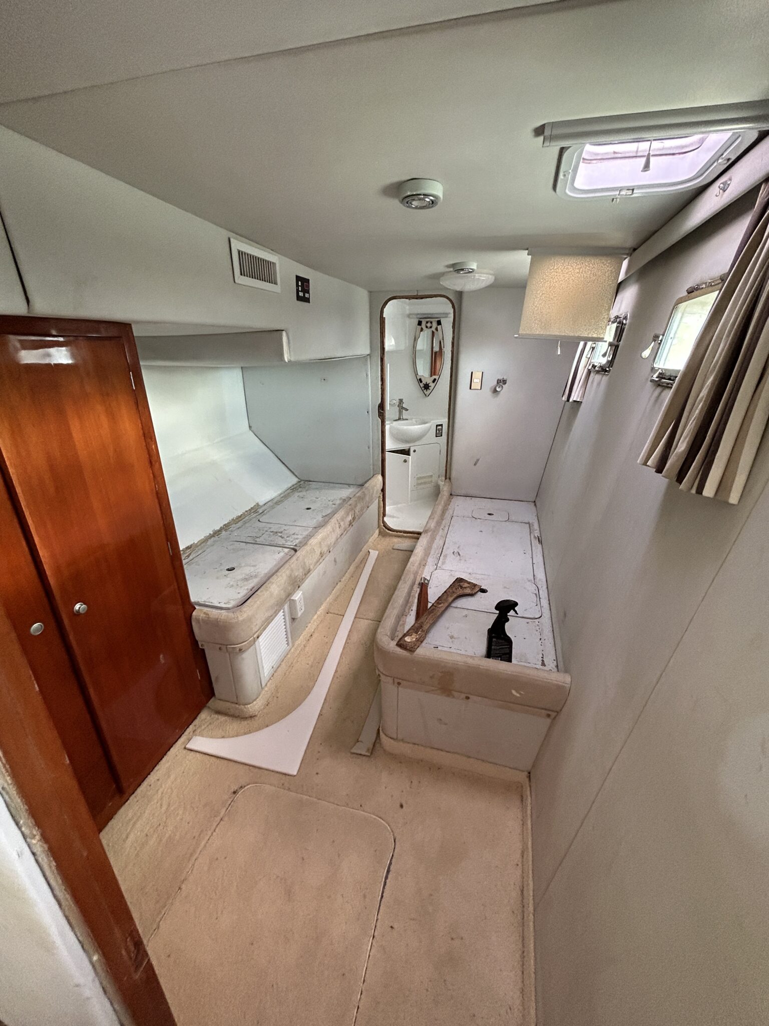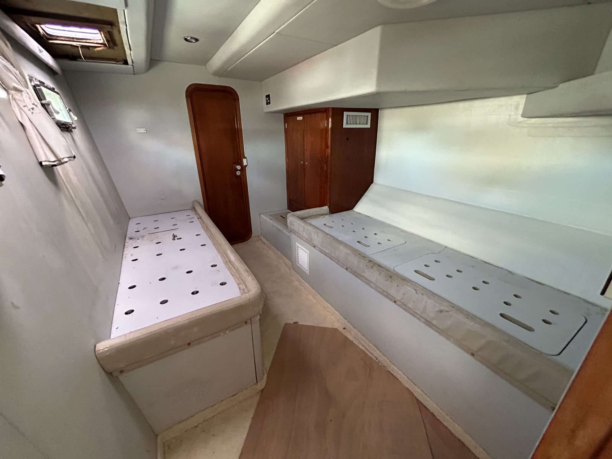 Au milieu du navire dans la coque tribord se trouve la cabine du propriétaire, elle comprend un lit queen-size (armature seulement) avec rangement, penderie, WC et salle de bain. À tribord à l’arrière se trouve une cabine invité avec 2 lits simples et une salle de bain.