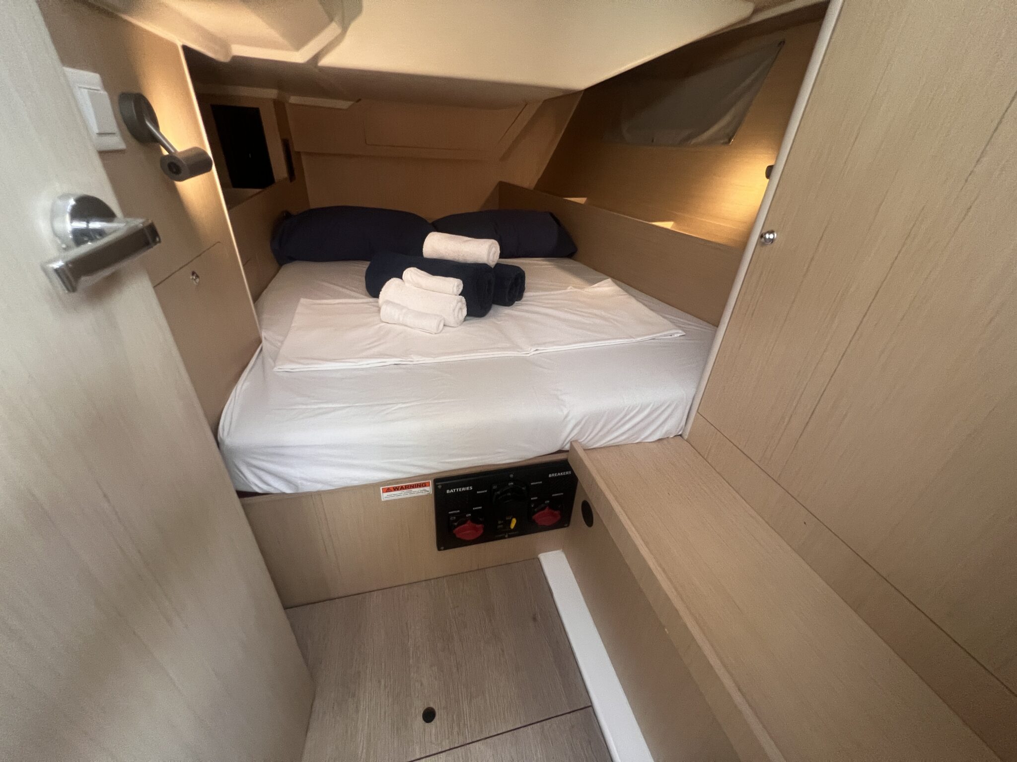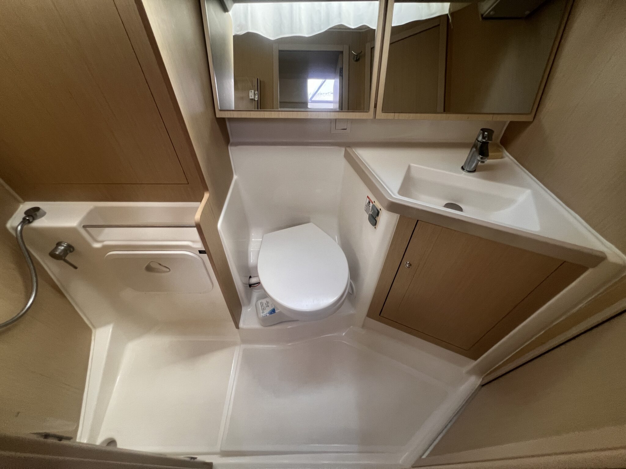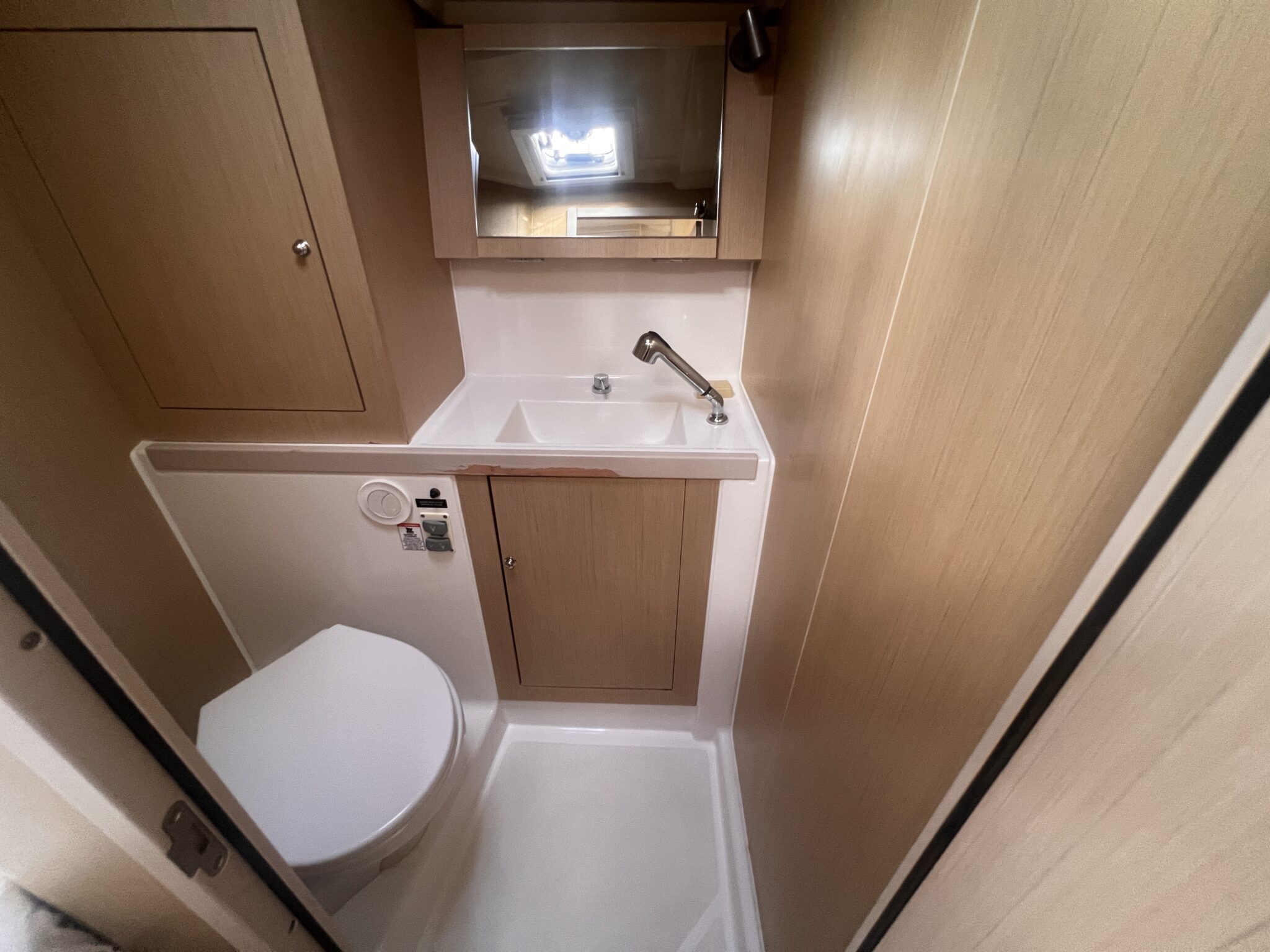 A l’arrière 2 cabines doubles + salle d’eau avec cabine de douche et WC électrique sur tribord