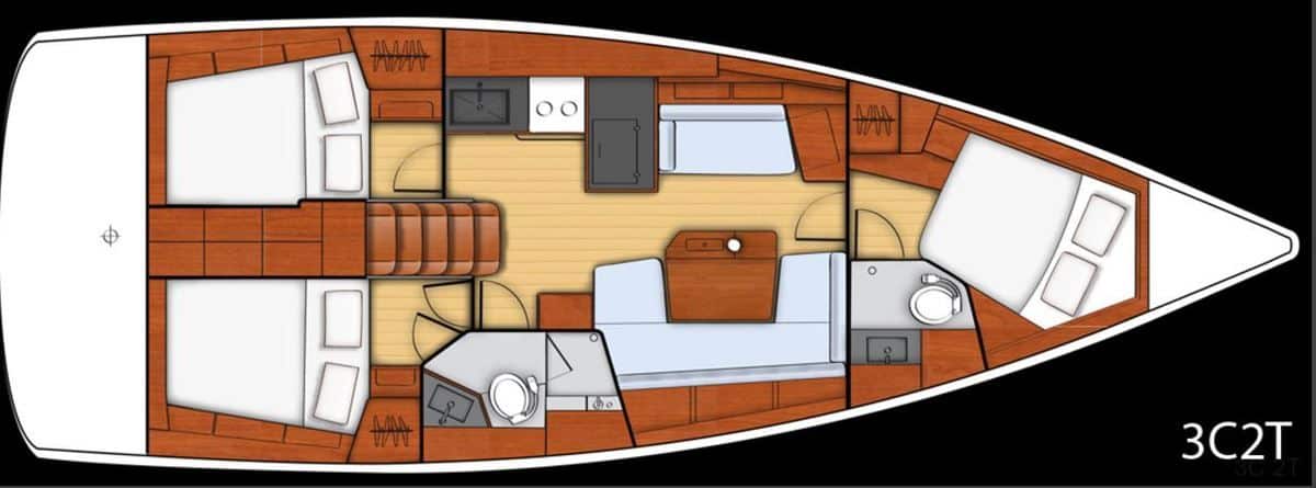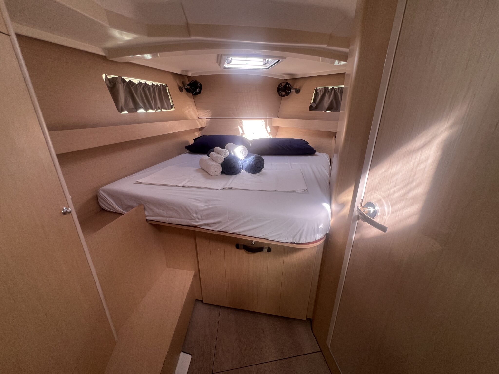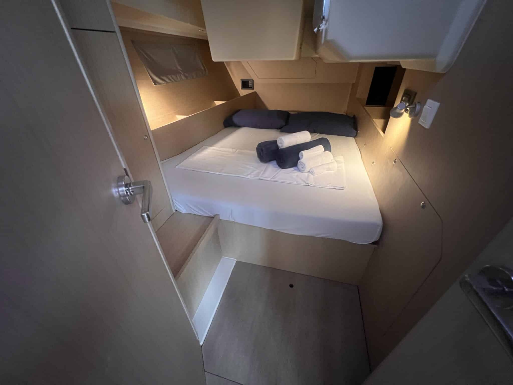 A l’arrière 2 cabines doubles + salle d’eau avec cabine de douche et WC électrique sur tribord