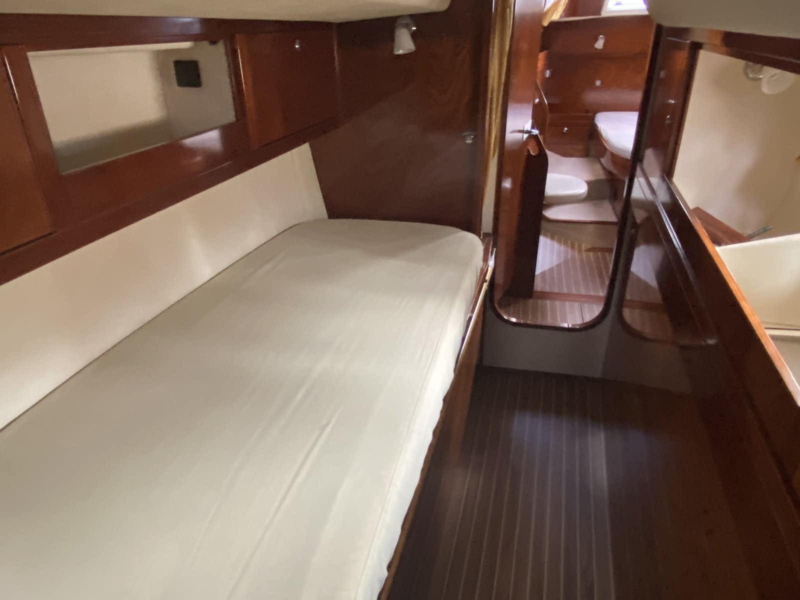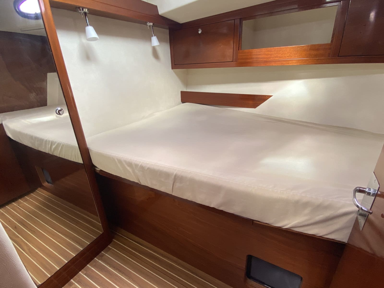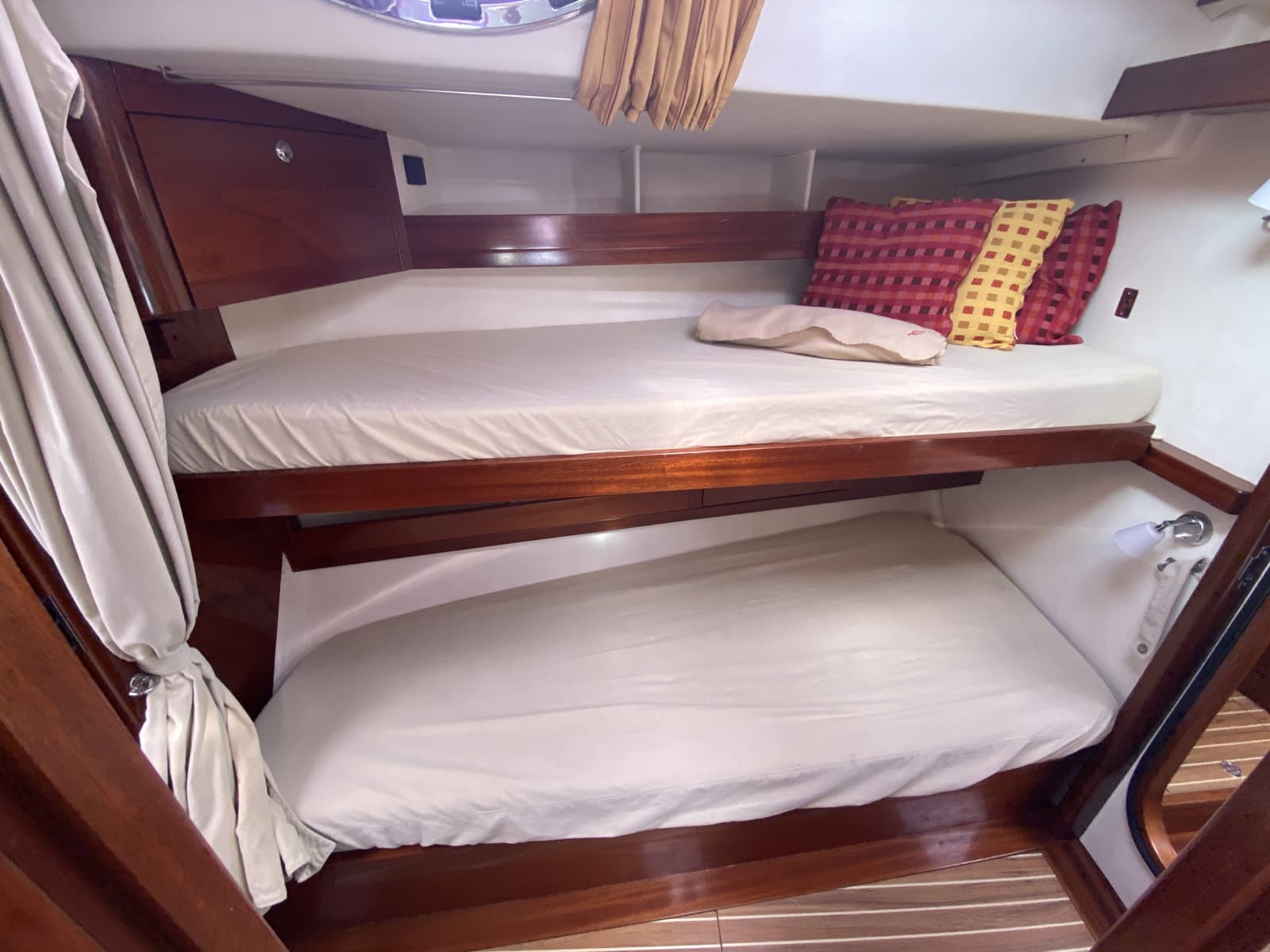 Forward double cabin + single bunk beds with private head, large shower, washing machine + dryer