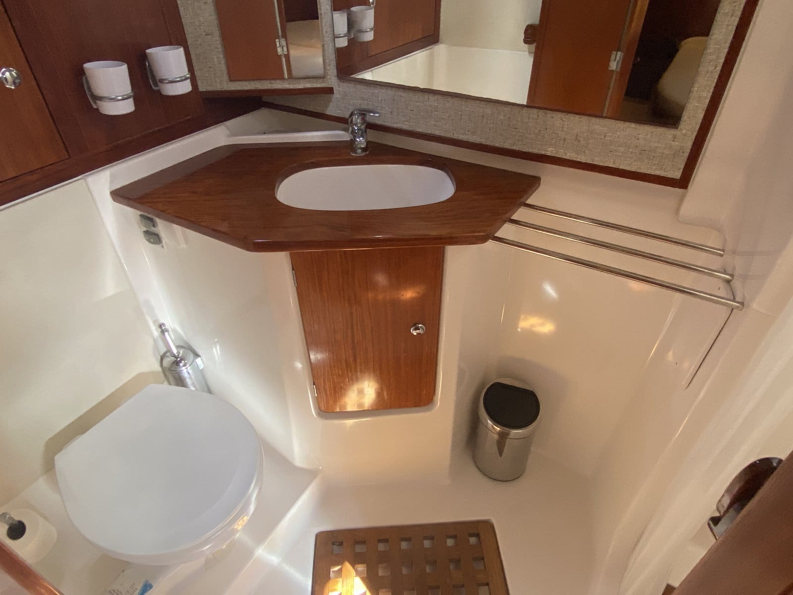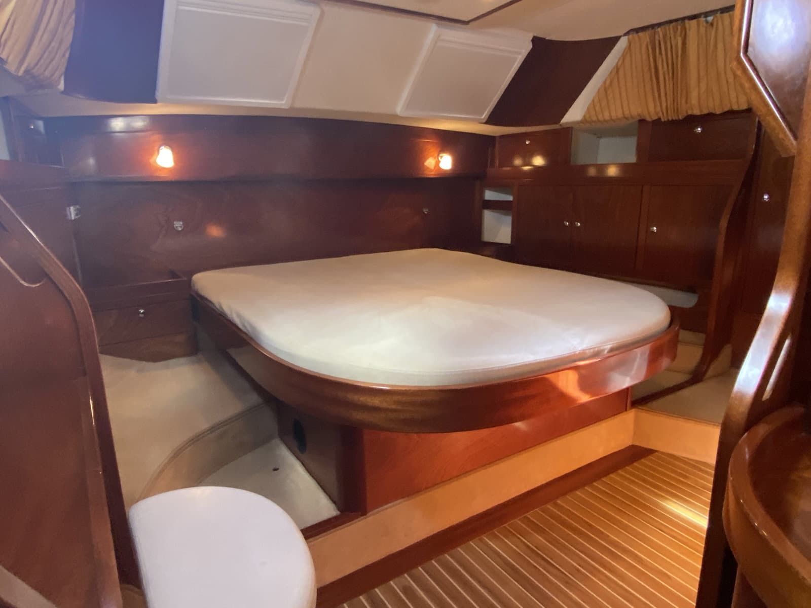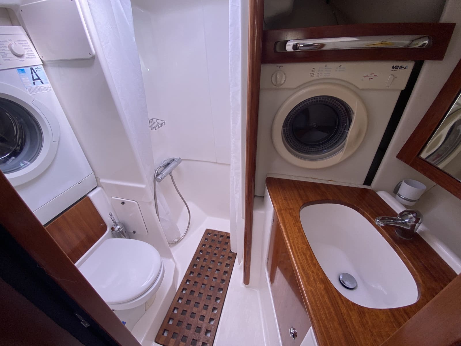 Forward double cabin + single bunk beds with private head, large shower, washing machine + dryer