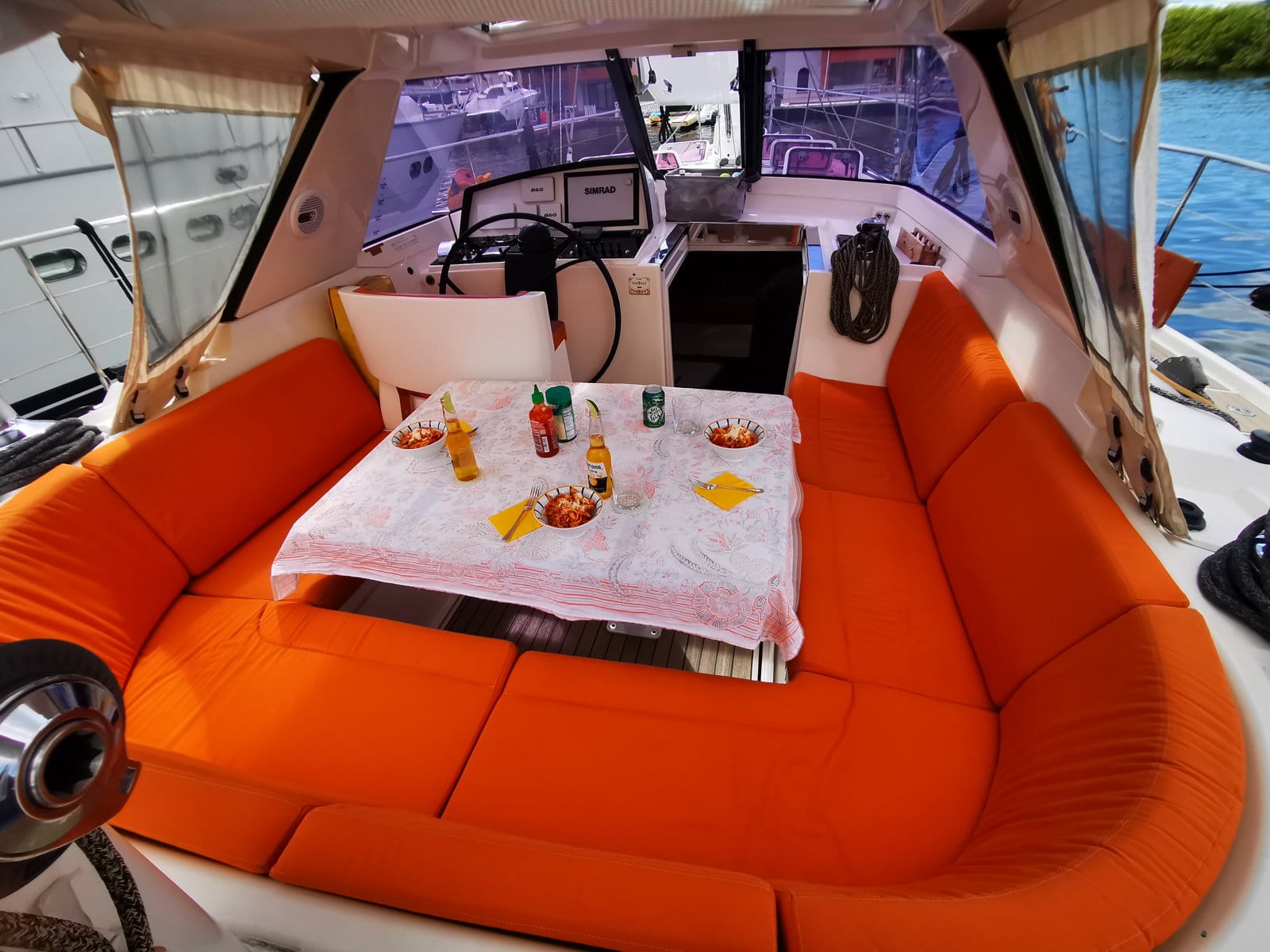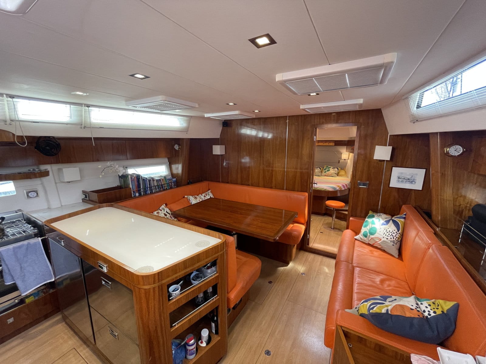 Side lounge on starboard with a large sofa
