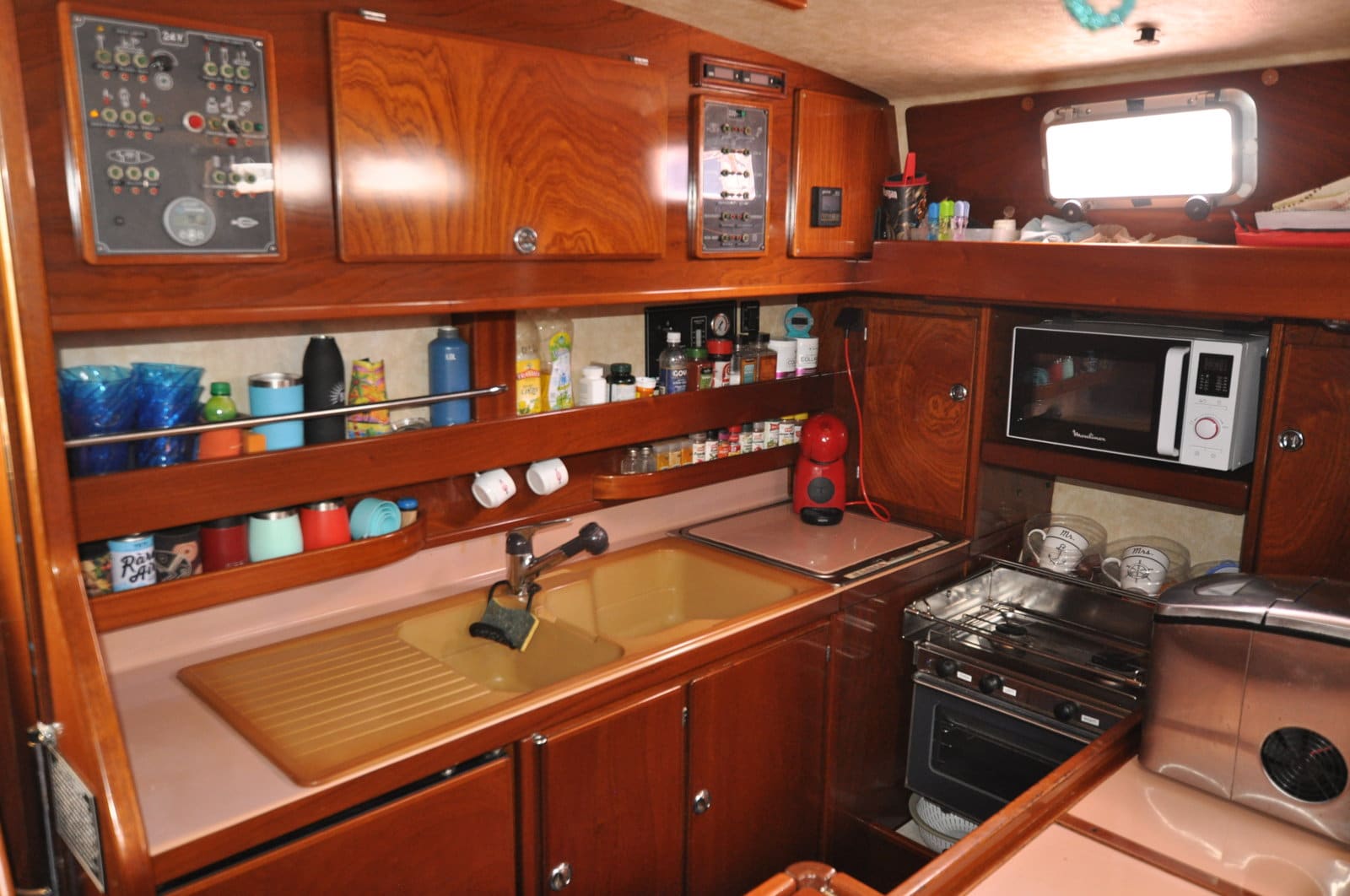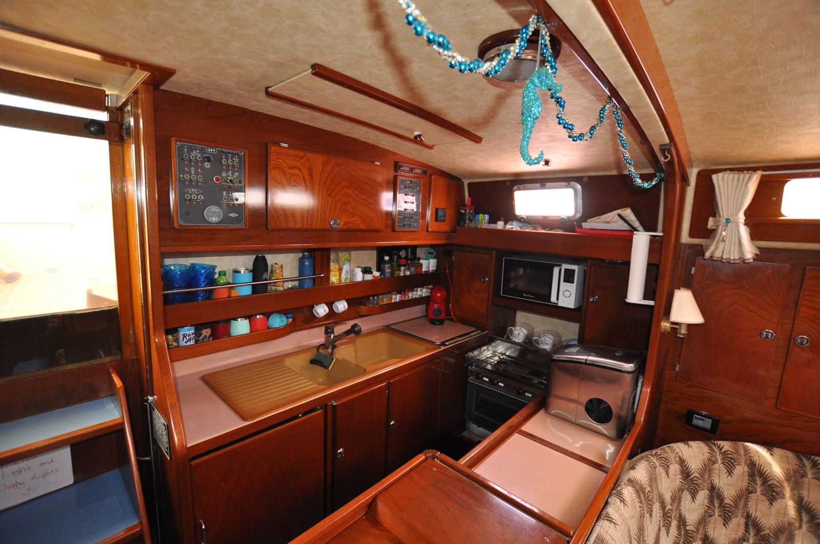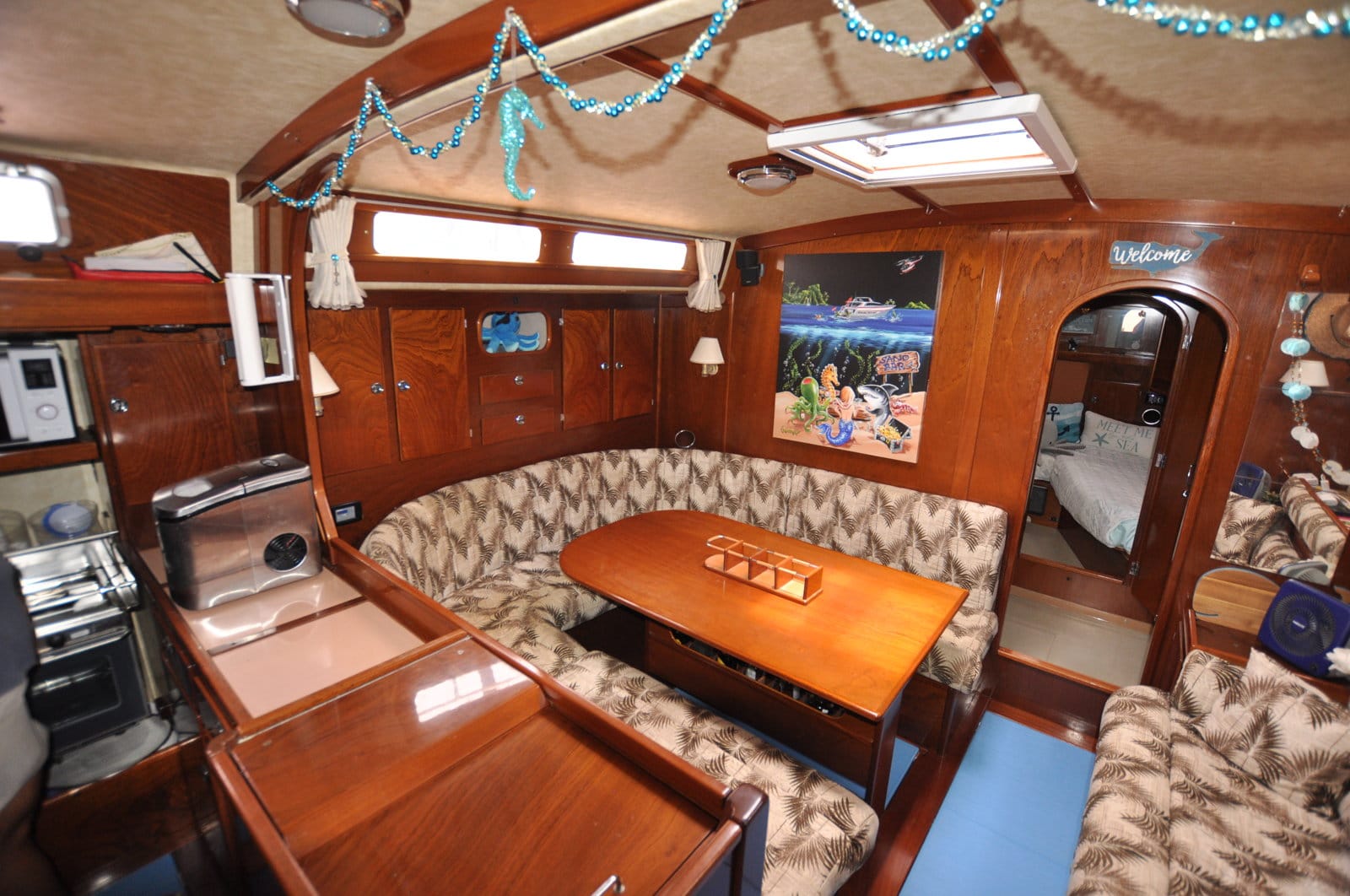 Large saloon at the bottom of the companionway with kitchen on port side