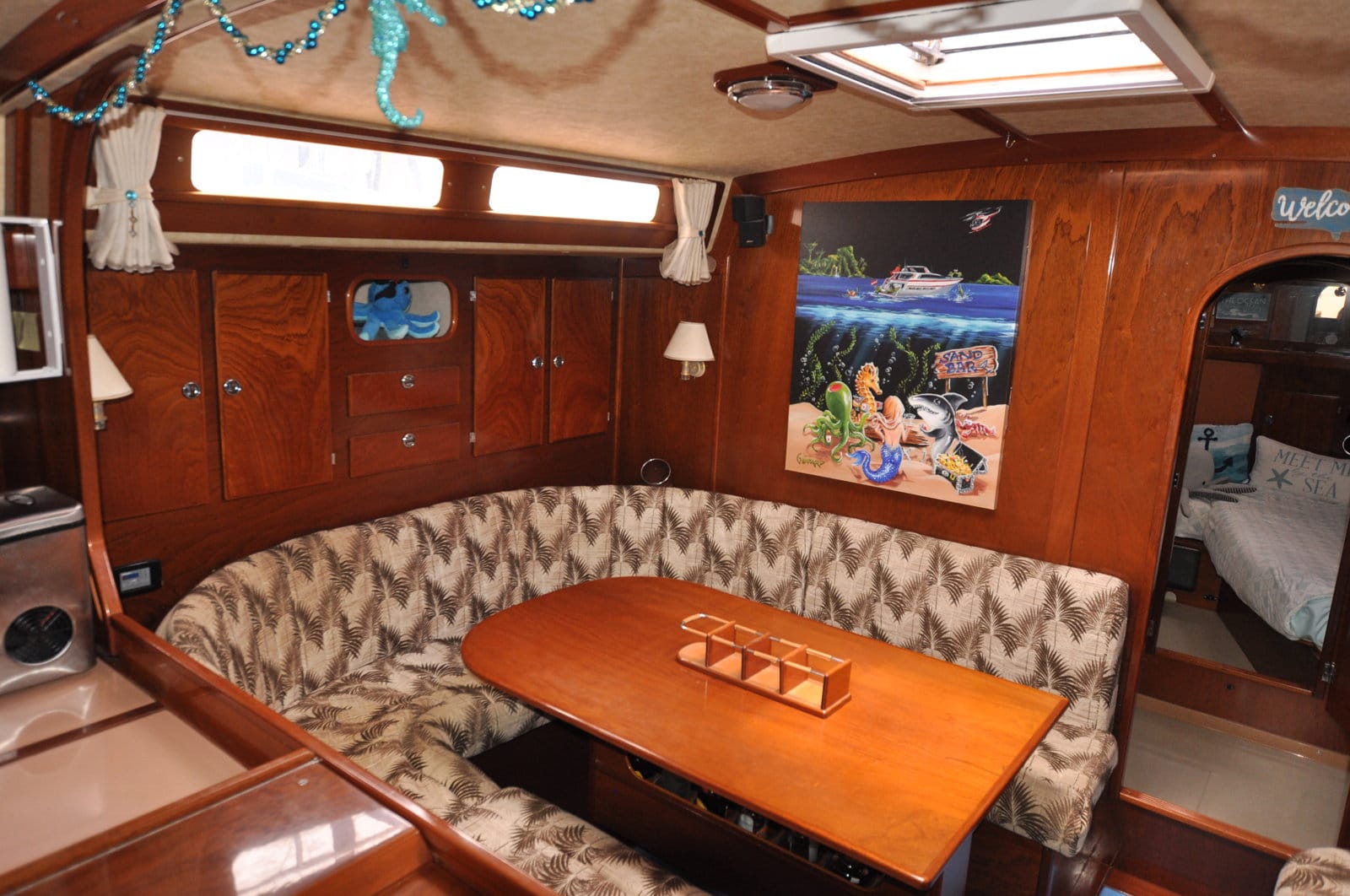 Large table on port side, sofa on starboard side