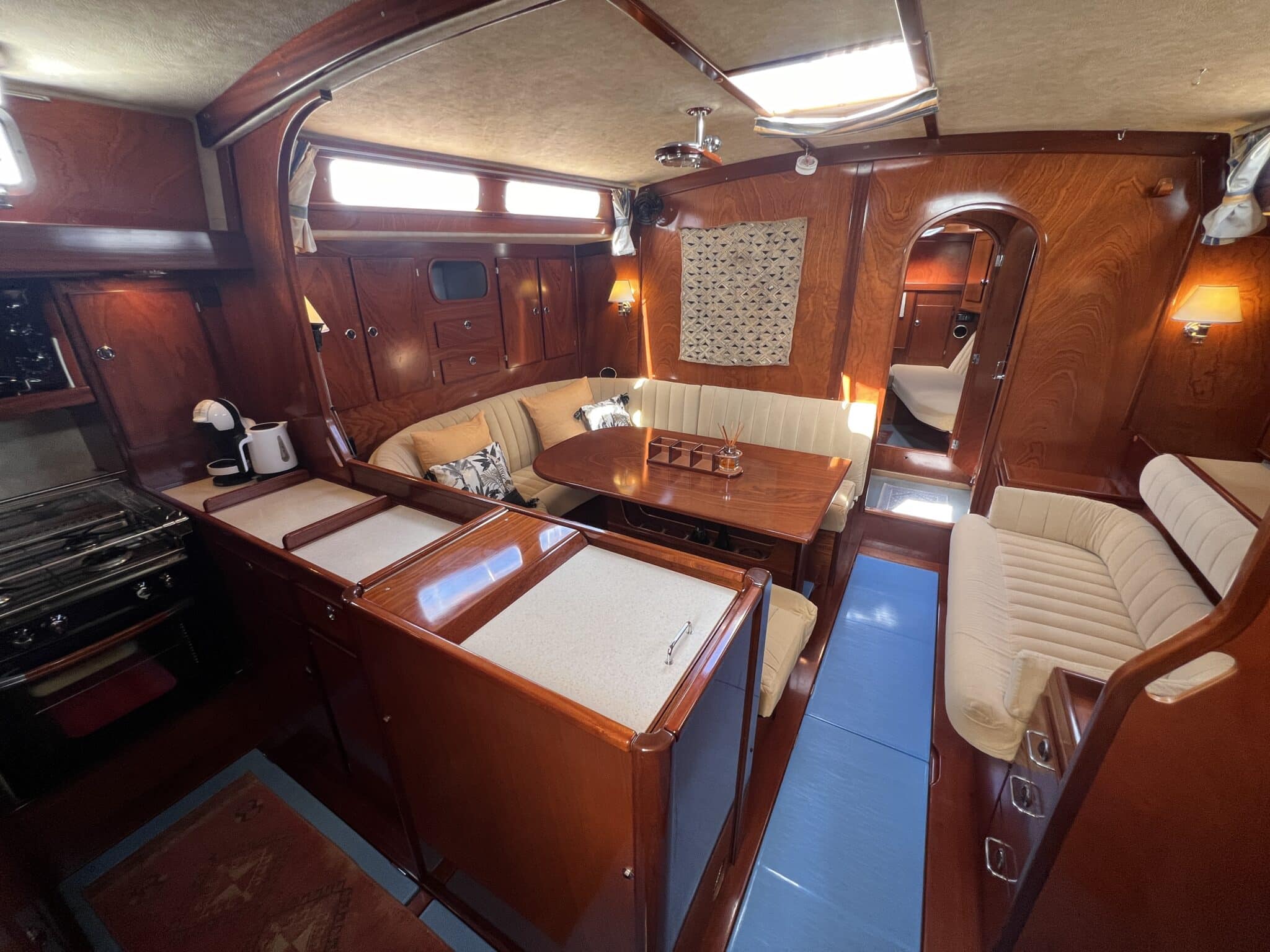 Large saloon with galley on port and nav station on starbord