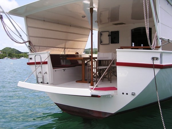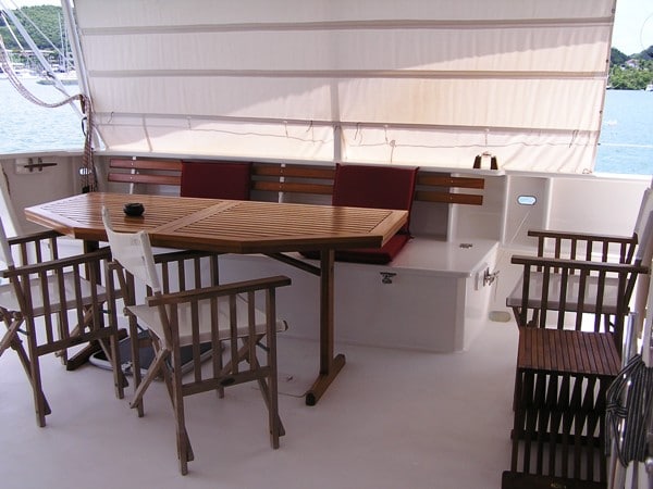 Cockpit forming a large, comfortable and sheltered outdoor living area, equipped with benches, table, various lockers and access to the rear hold