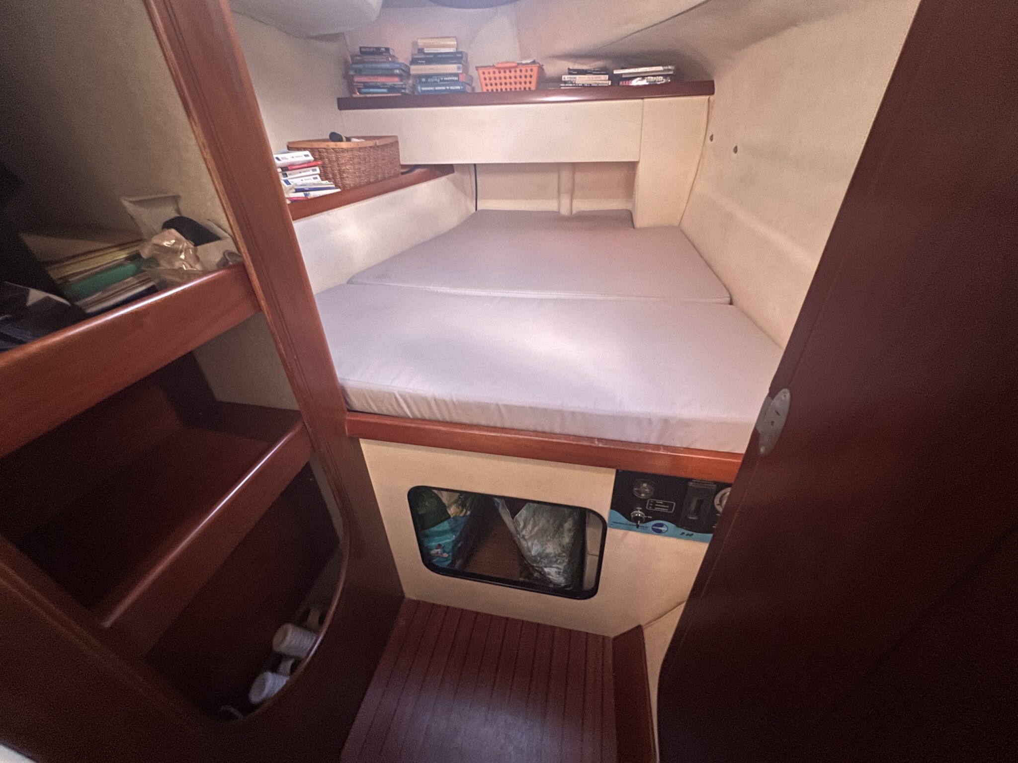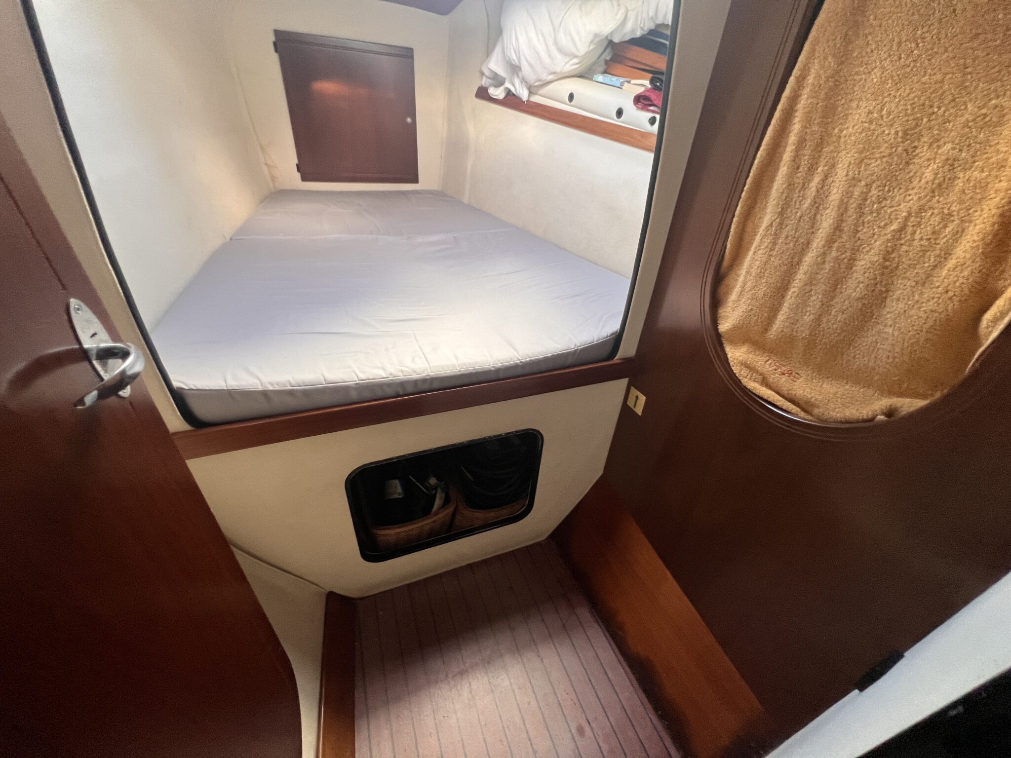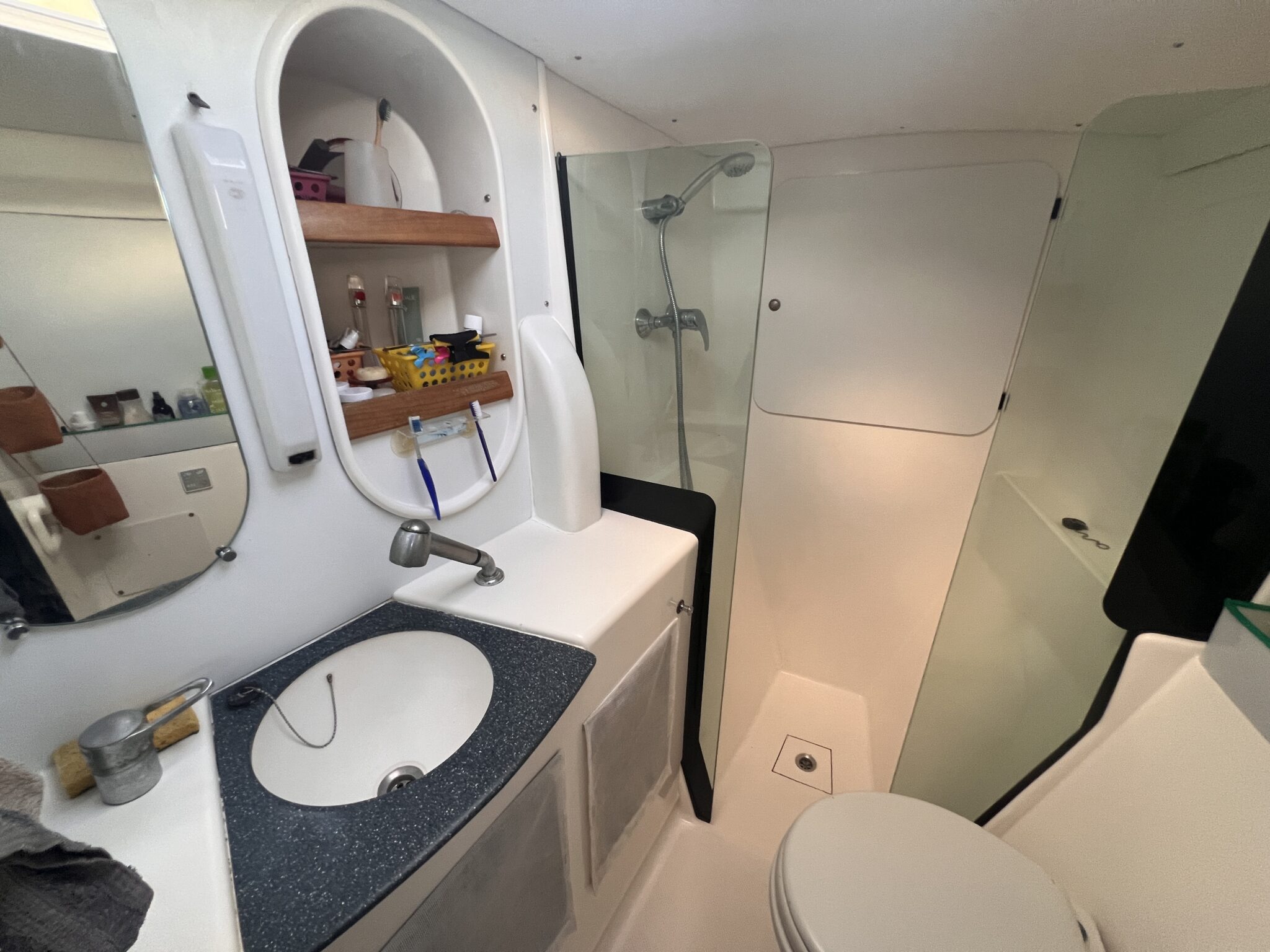 Owner’s hull to starboard, double berth aft, office (or workbench), forward head with electric toilet and large shower