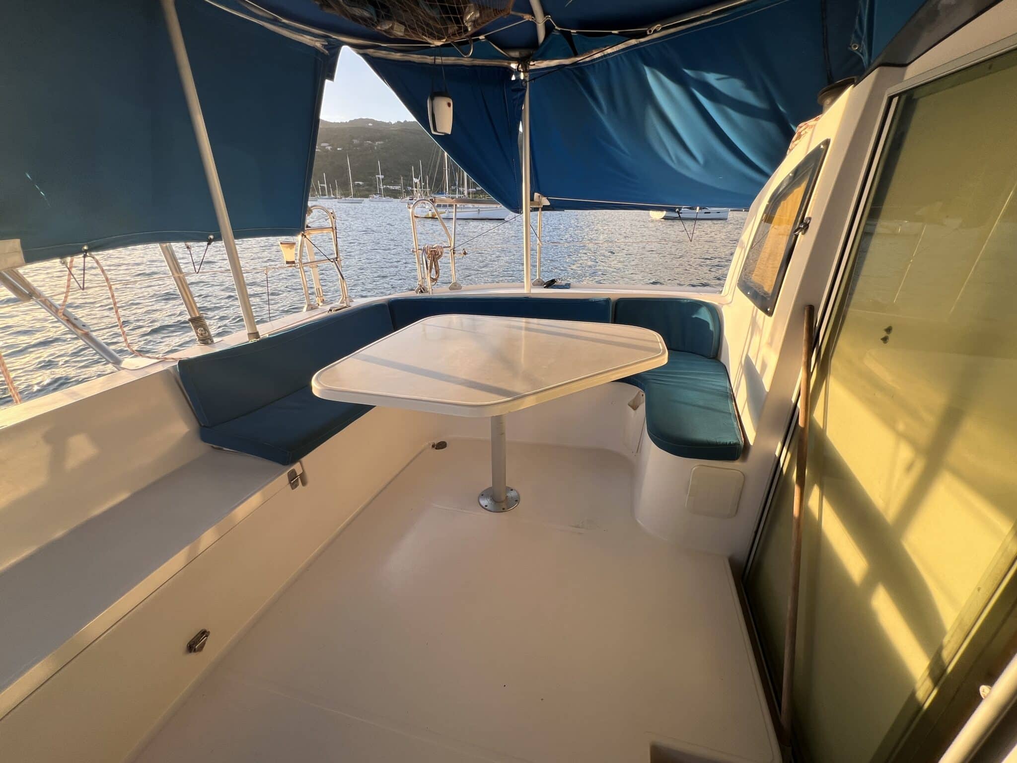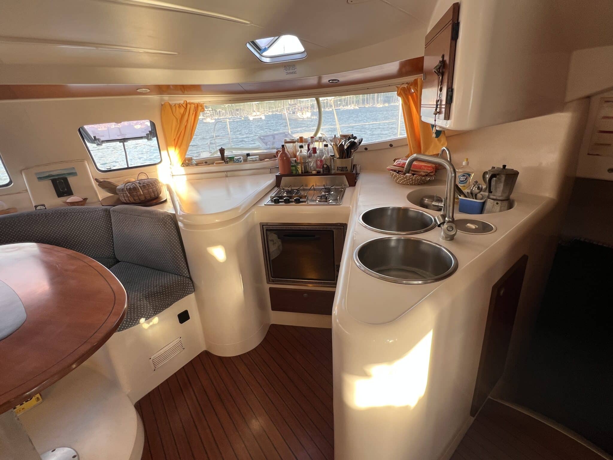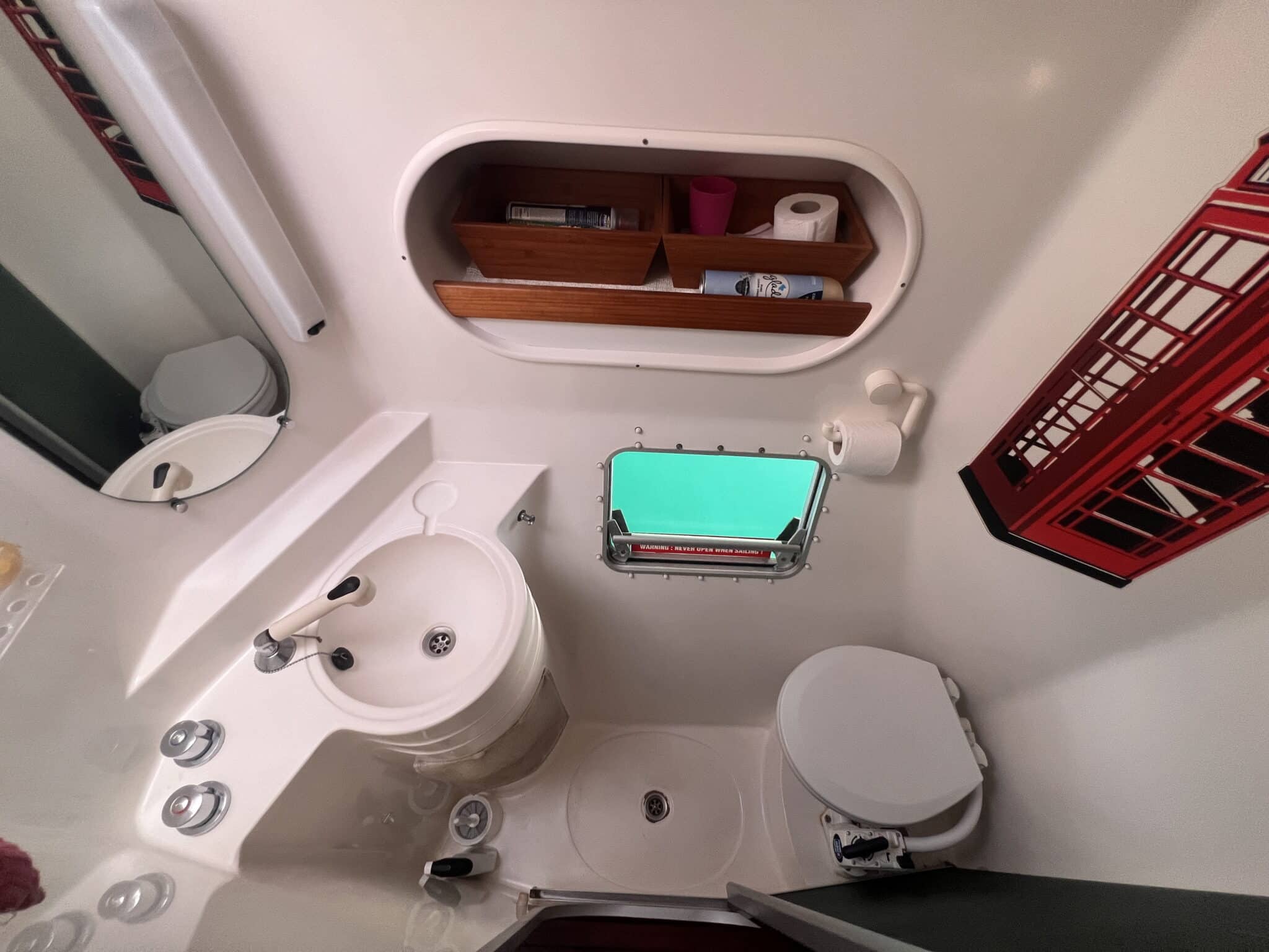 Owner’s hull to starboard, double berth aft, office (or workbench), forward head with electric toilet and large shower