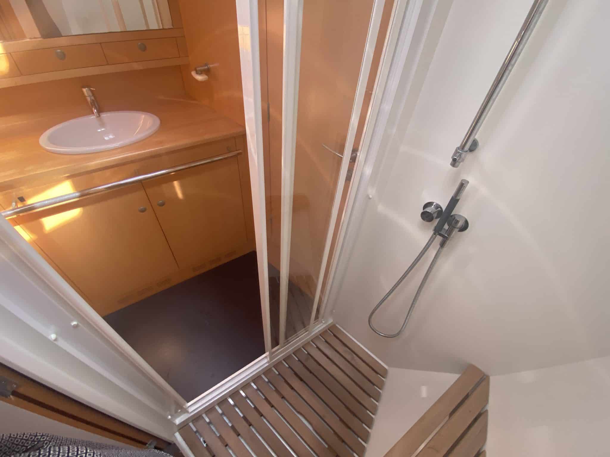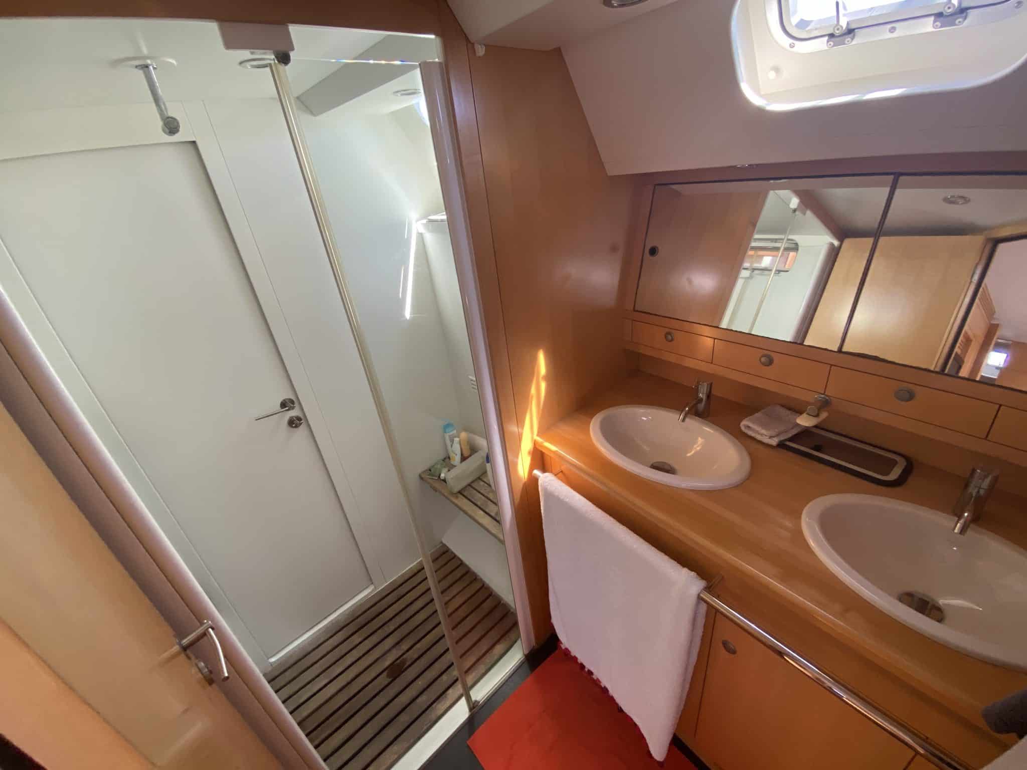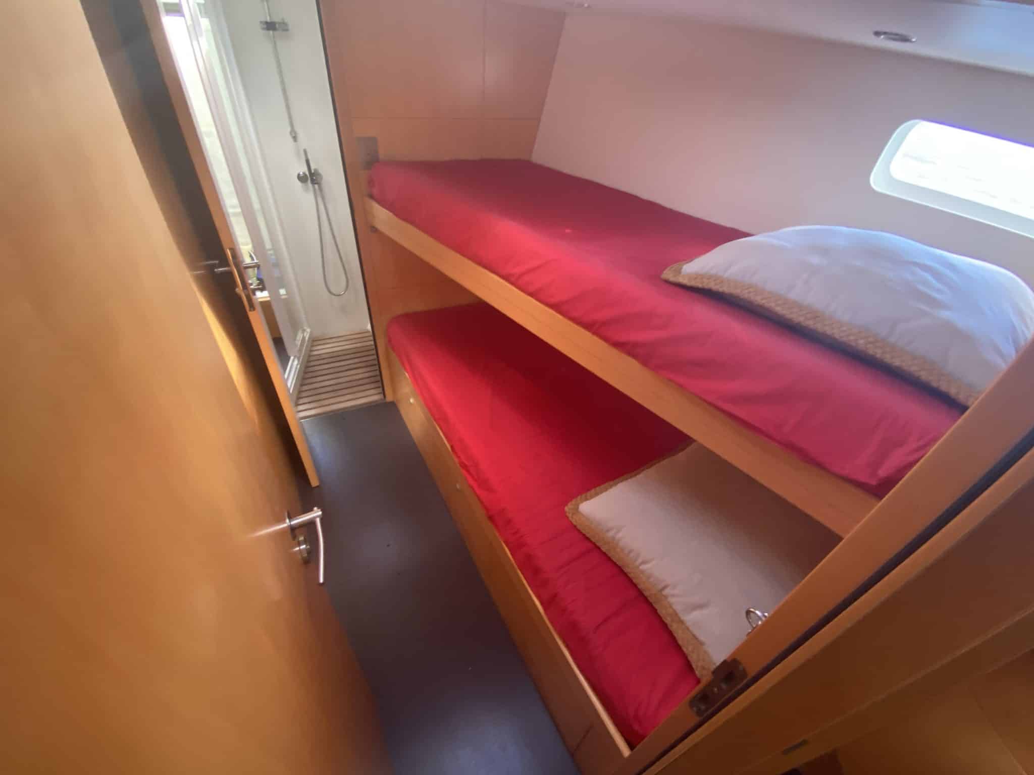 Forward starboard bunk beds and head with shower and separate toilet