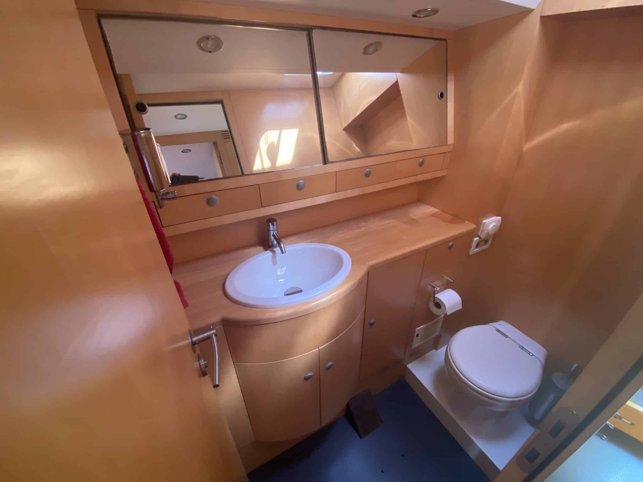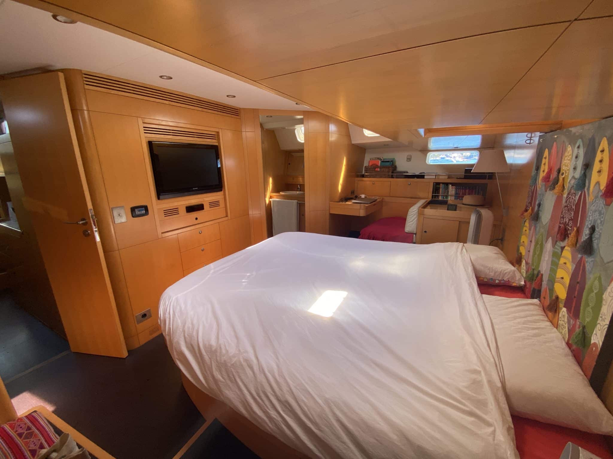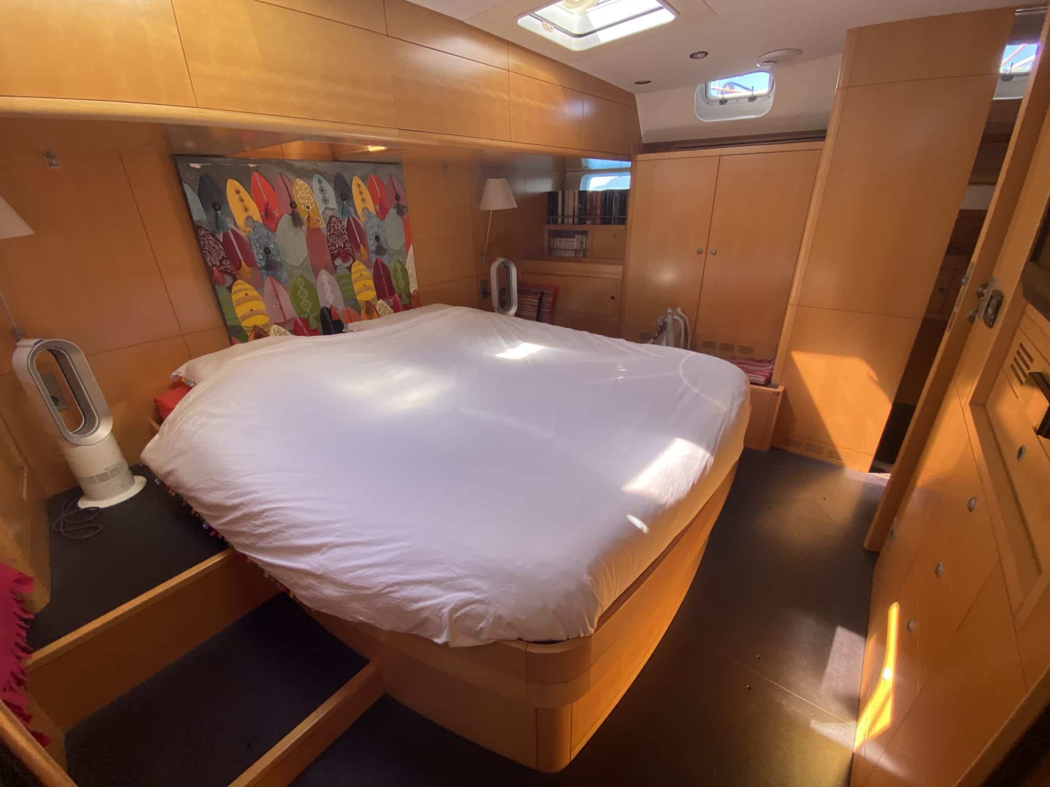 Large owner’s aft cabin, ensuite shower room with separate toilet, desk, TV, JVC stereo, many storage spaces,…