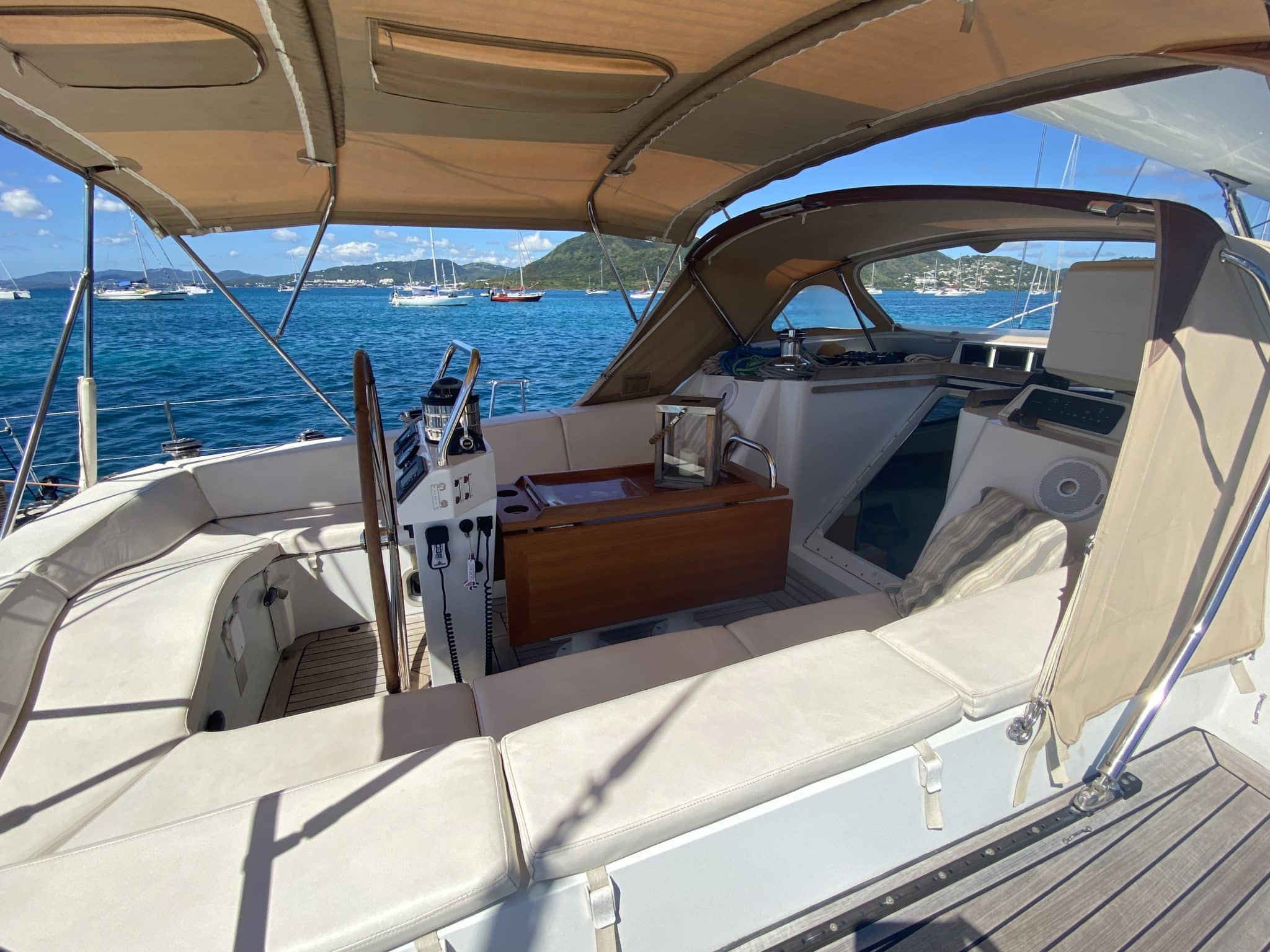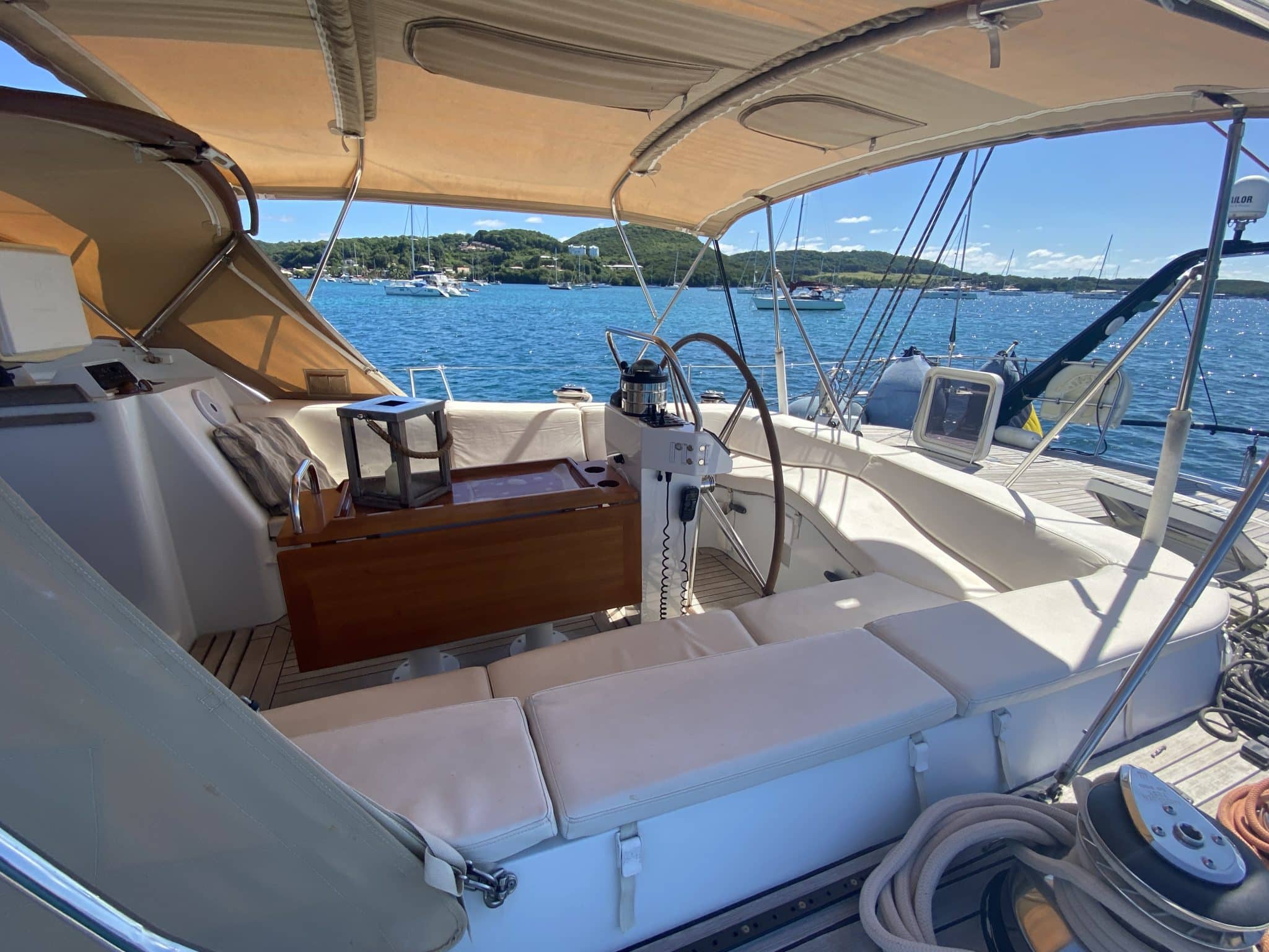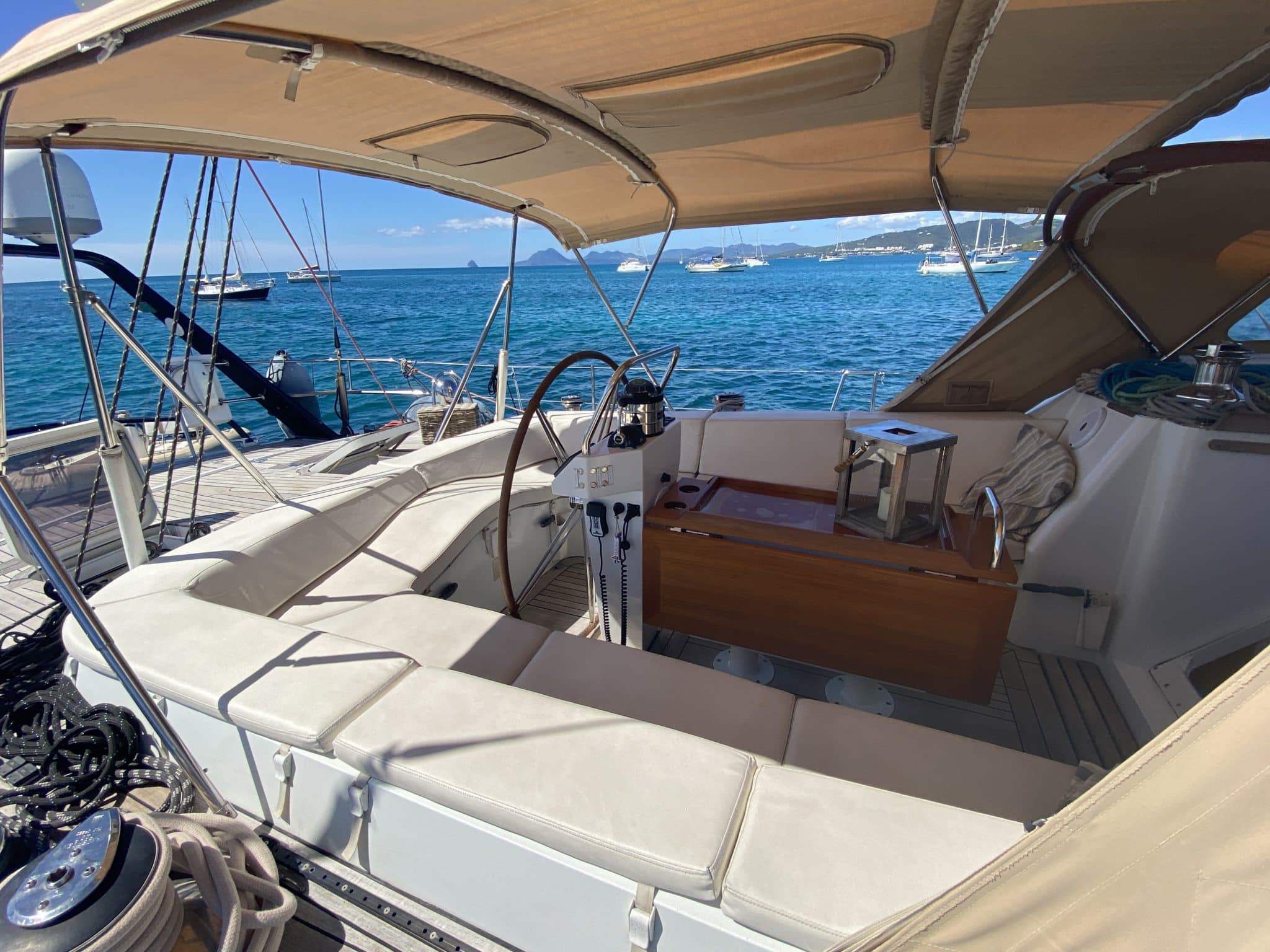 Central cockpit sheltered by bimini, enclosures (3 doors) and dodger, cushions, centrale table with refrigerator, …