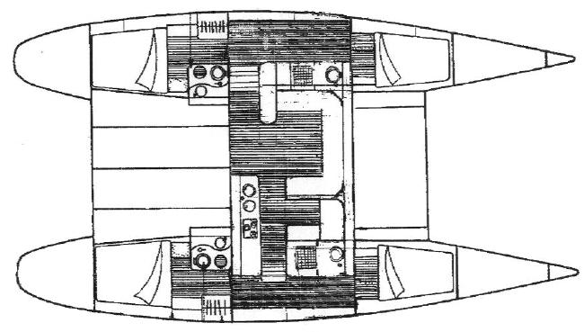 The forward lockers are drained by sea water. The forward lockers drain to the sea, and the other two are watertight and accessible through their forward counterparts. The large surface area of the trampoline allows water to pass through in heavy seas and reduces the tendency to pitch.