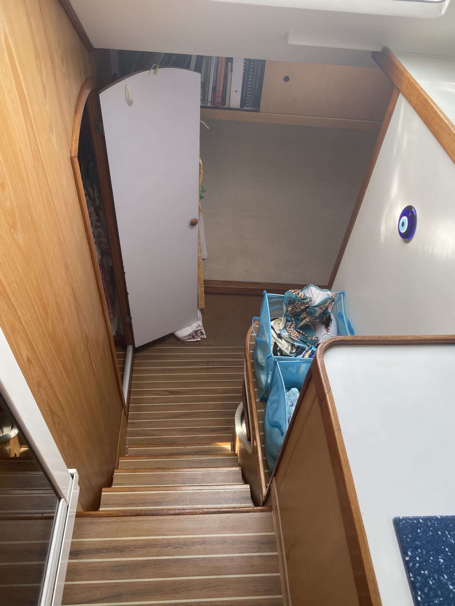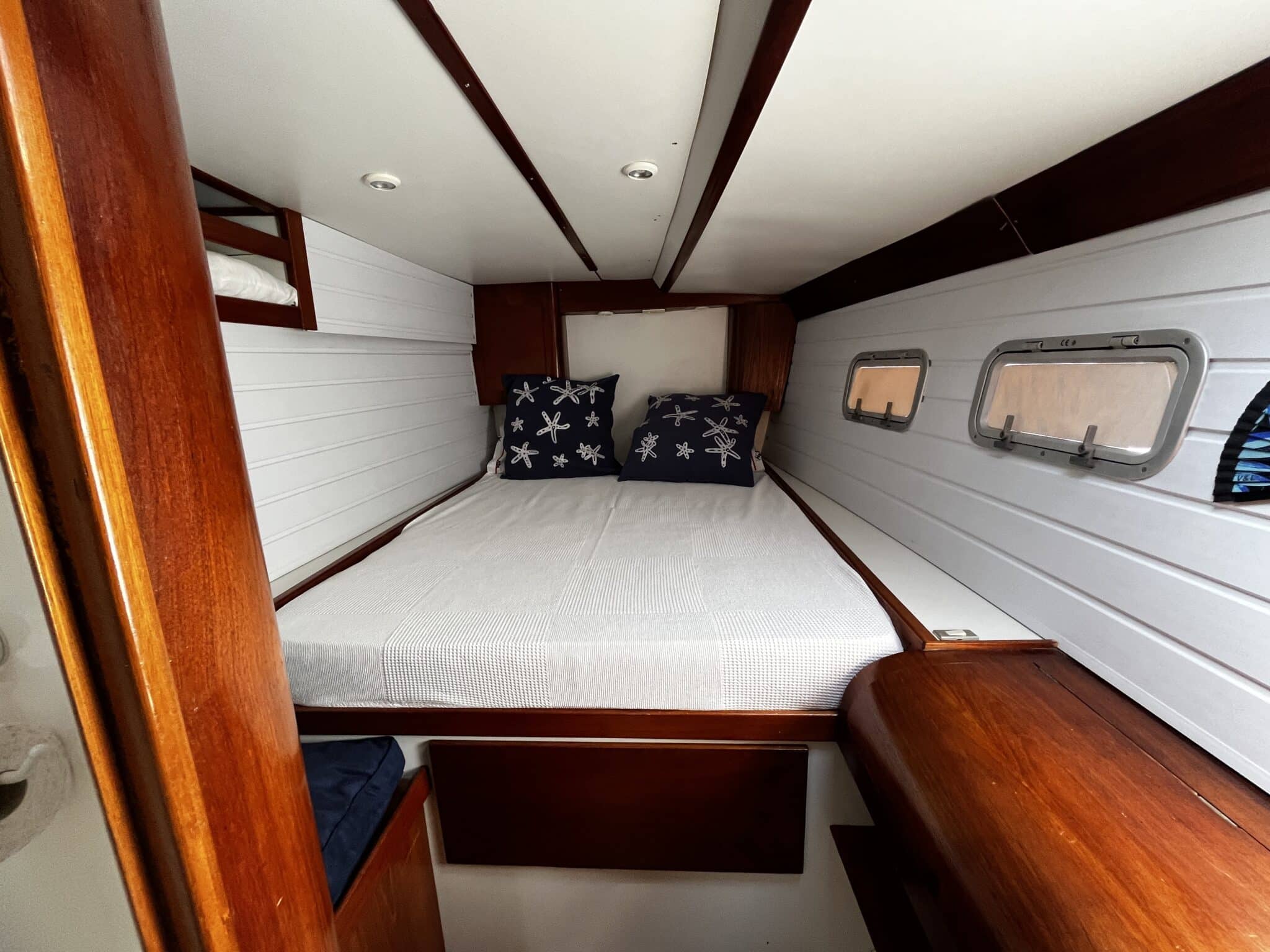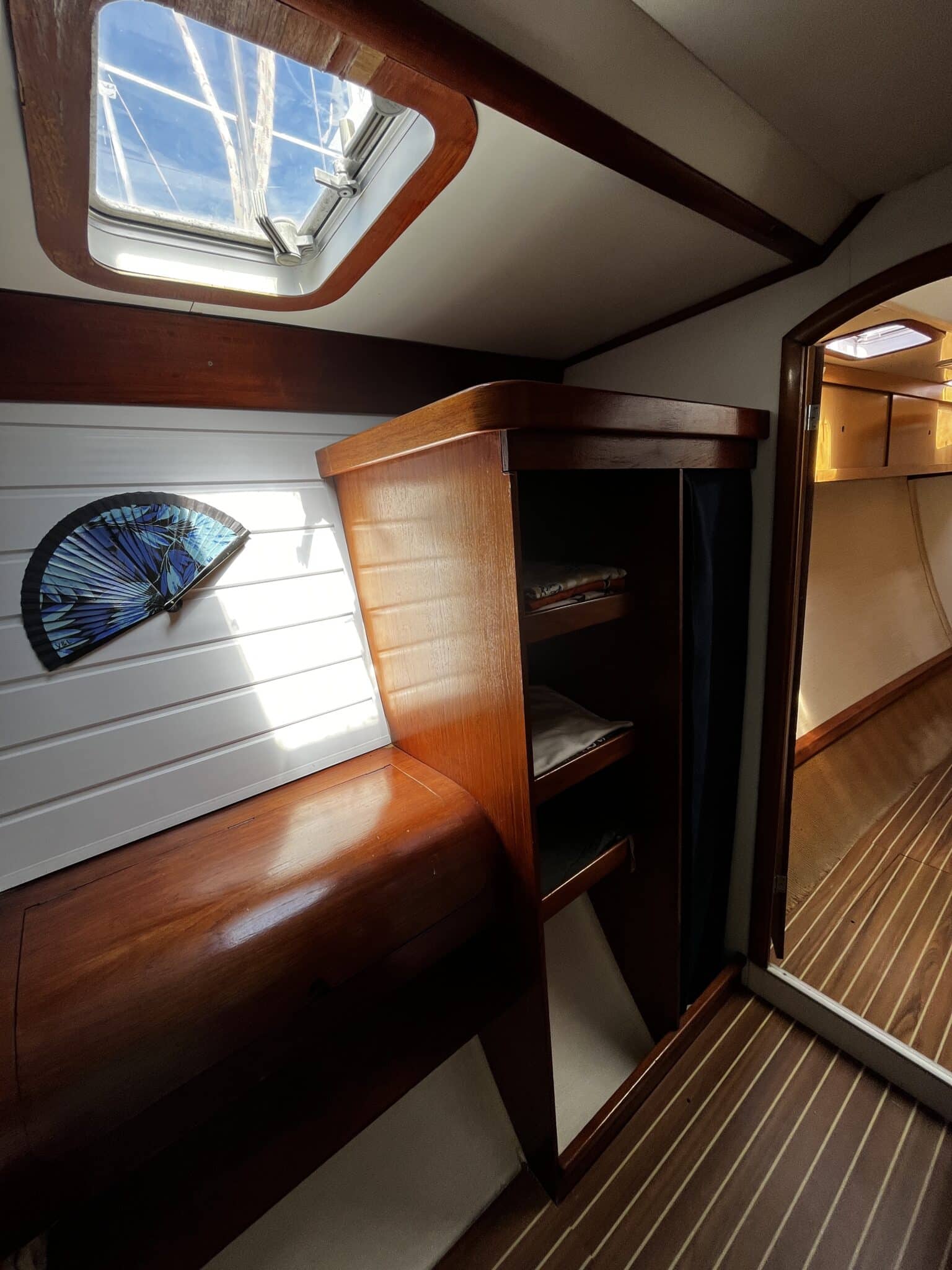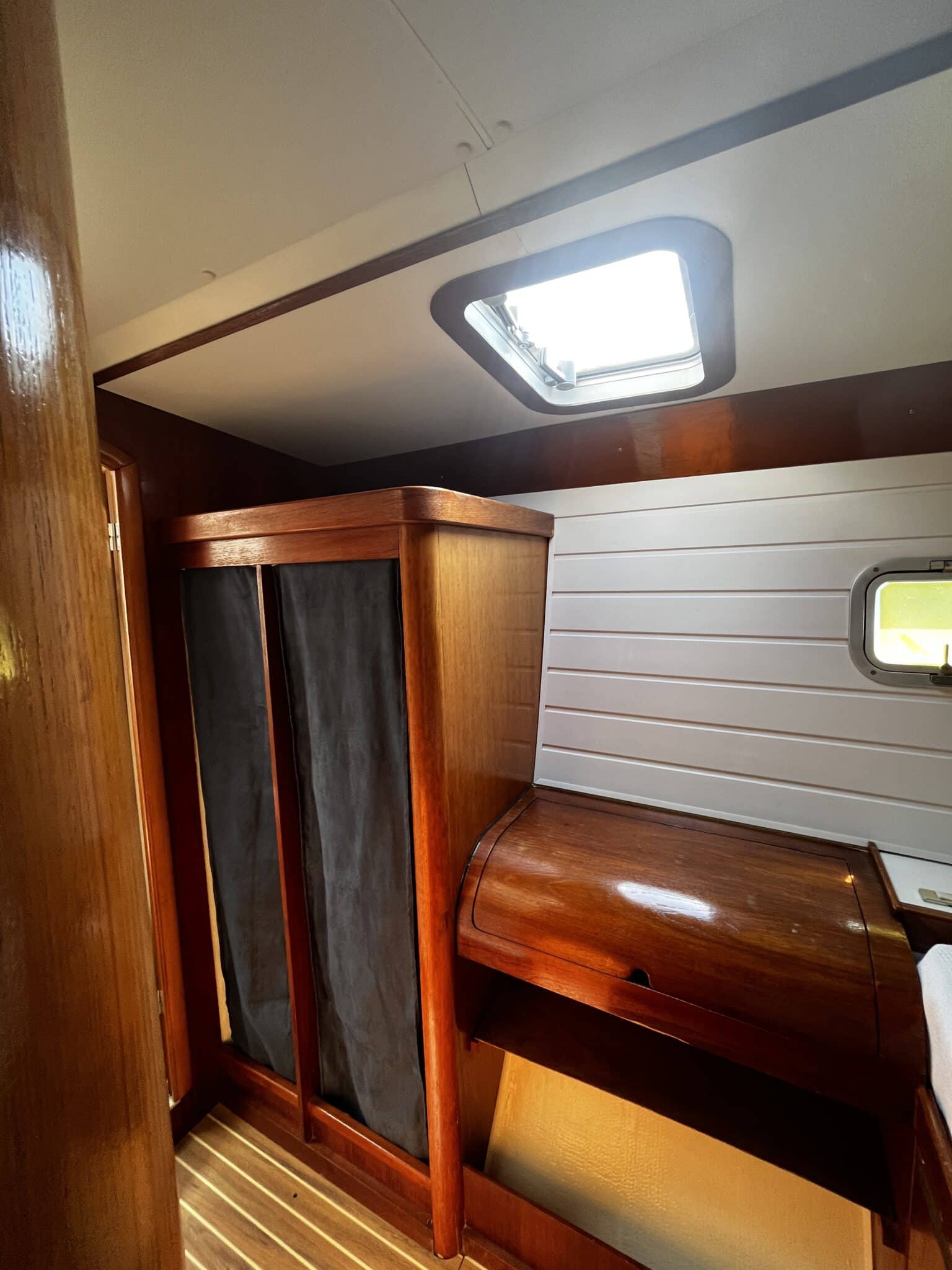 The rear cabin has a double berth, a large drawer and ample storage space underneath. The SSB Icom tuner is located above the bunk and two reading lights are located on the rear bulkhead. There is a closet with shelves e. A 220V outlet and a 220V outlet are located on the shelf under the secretary.