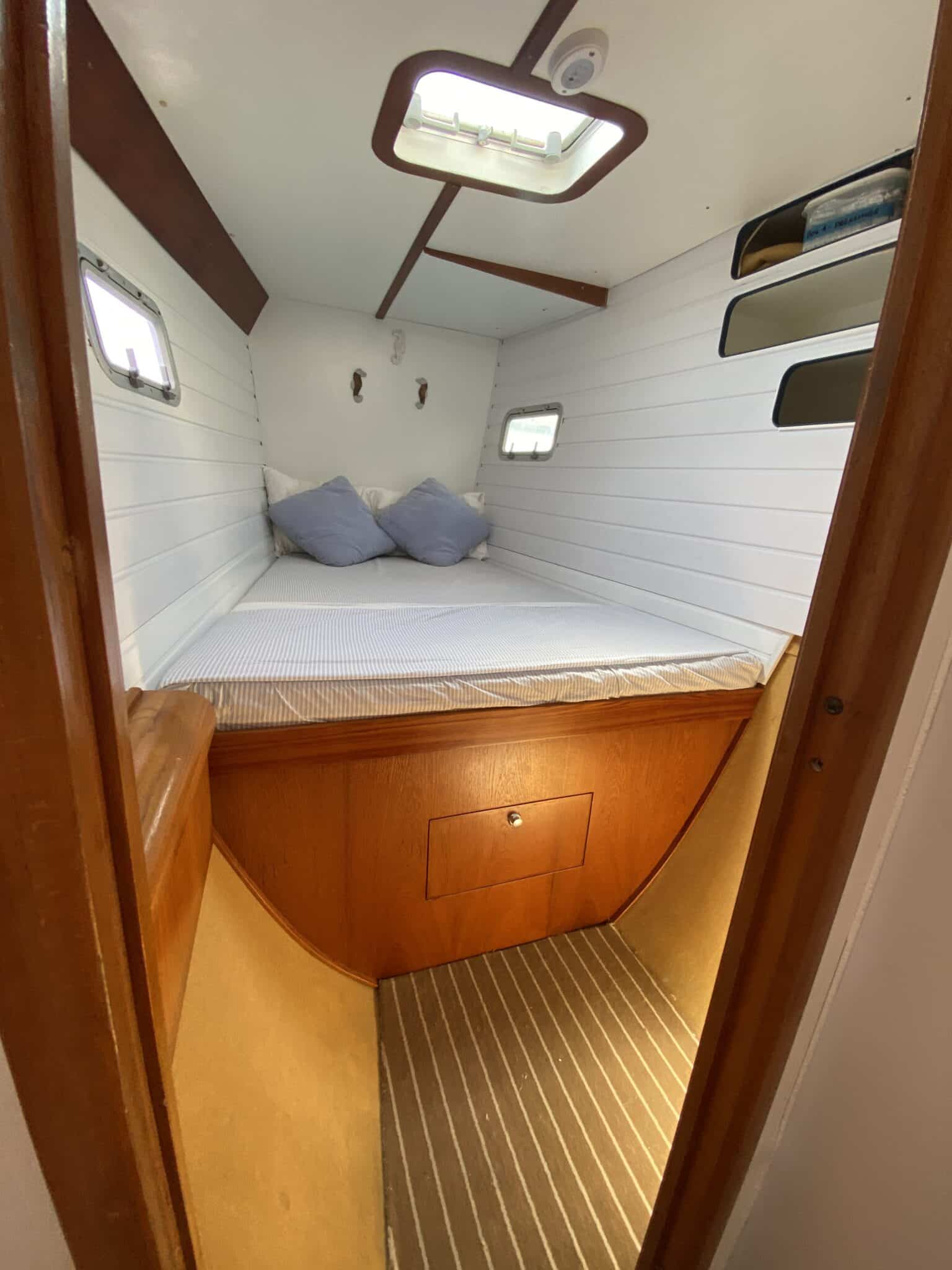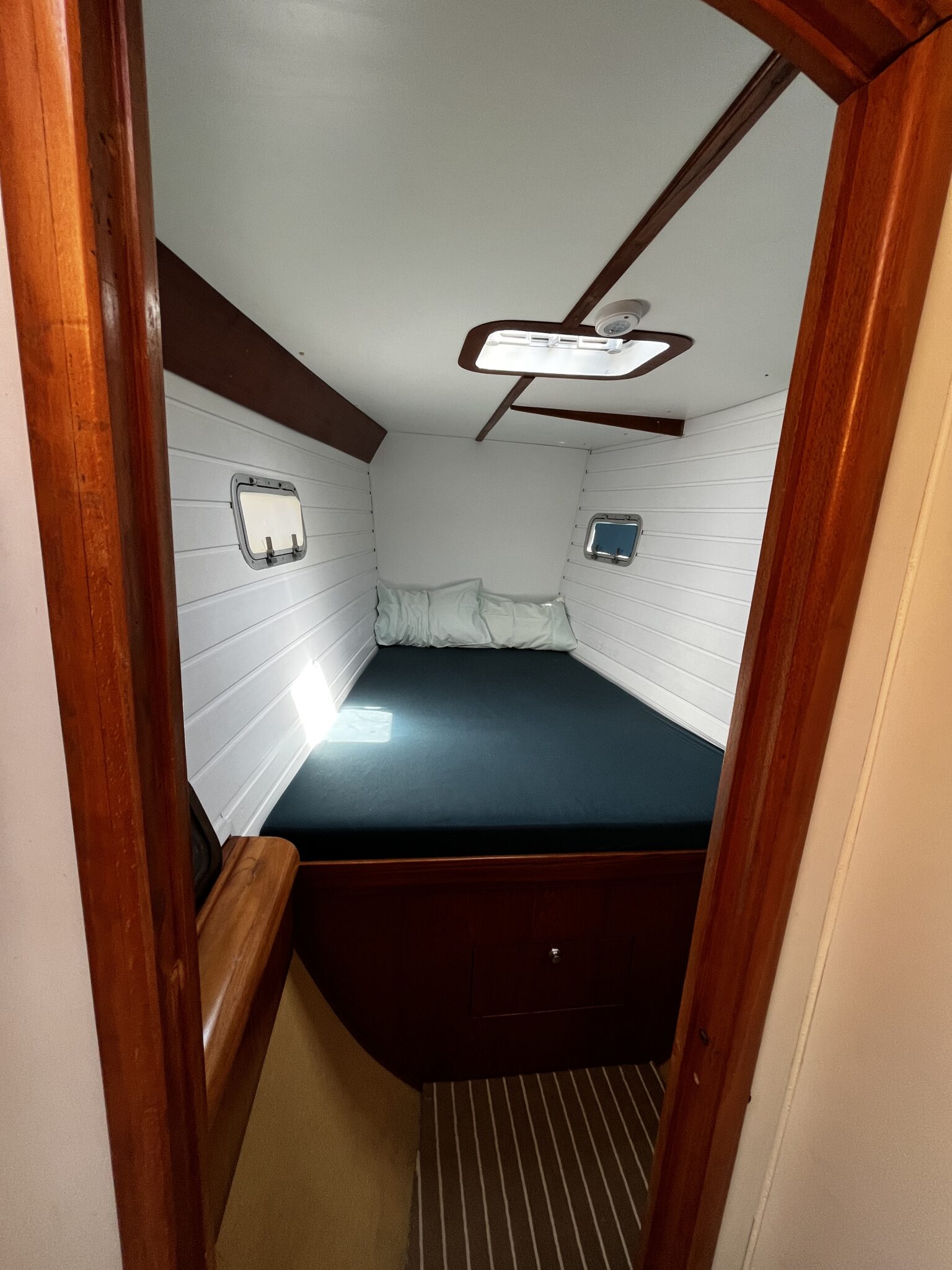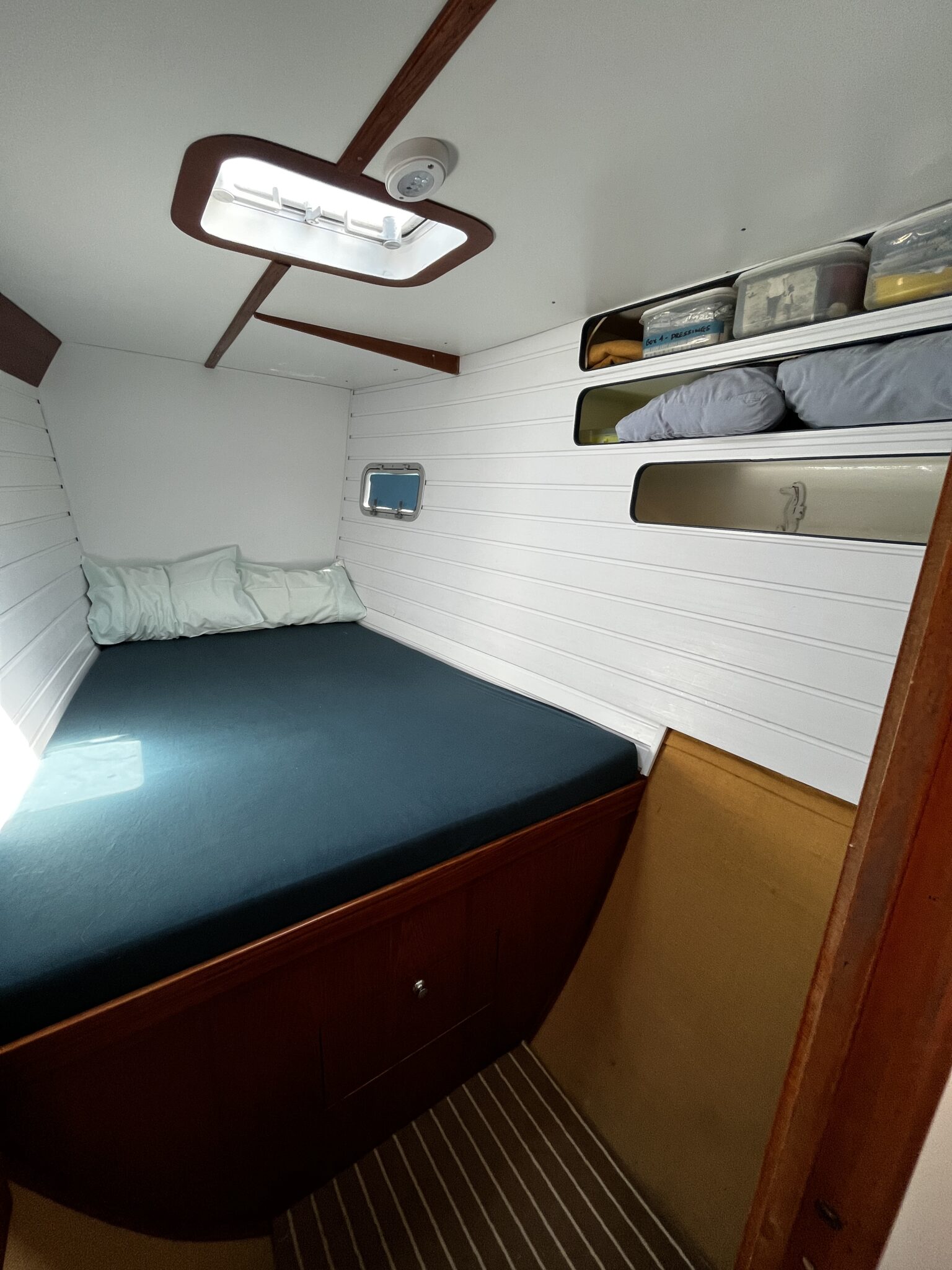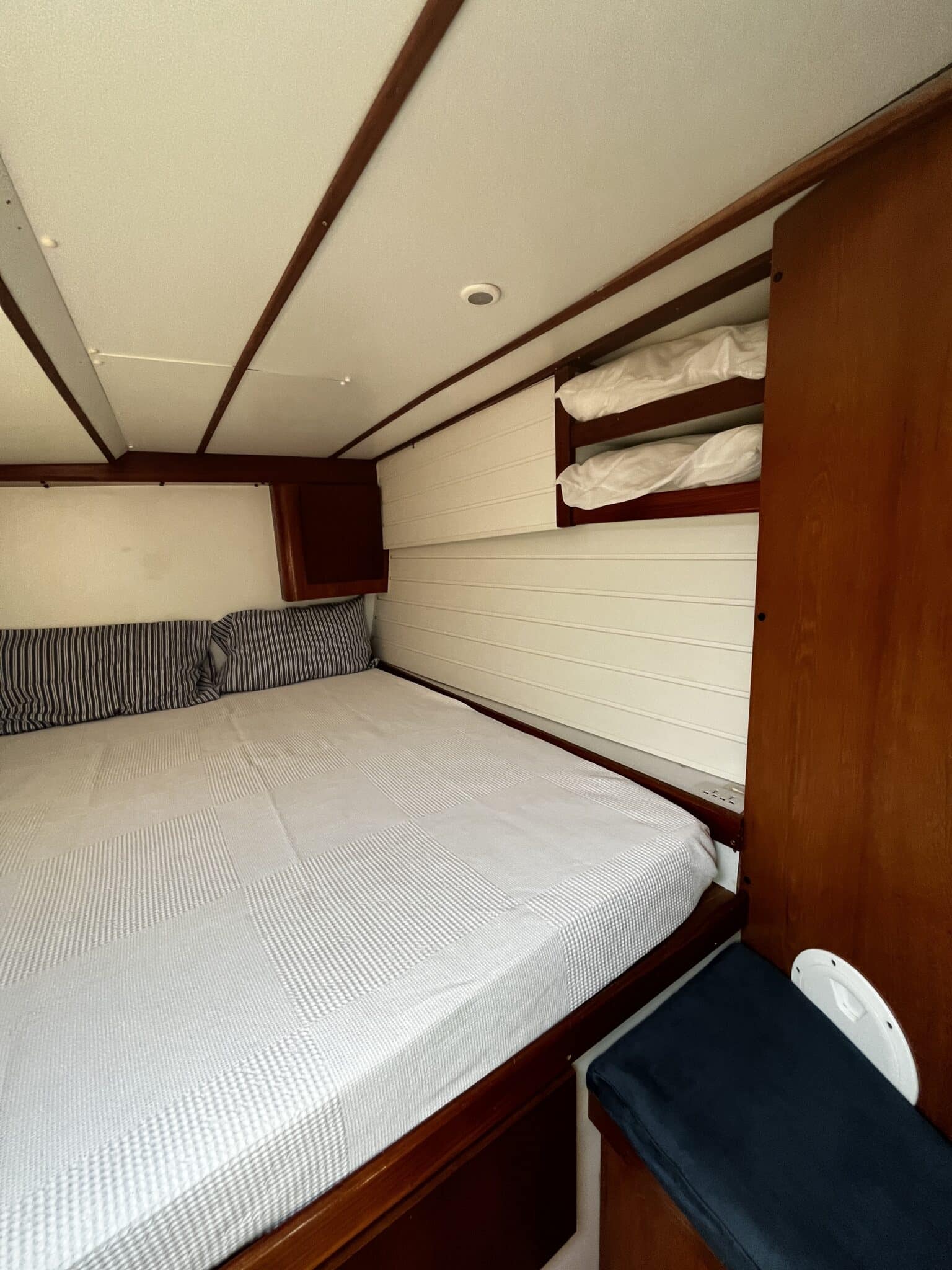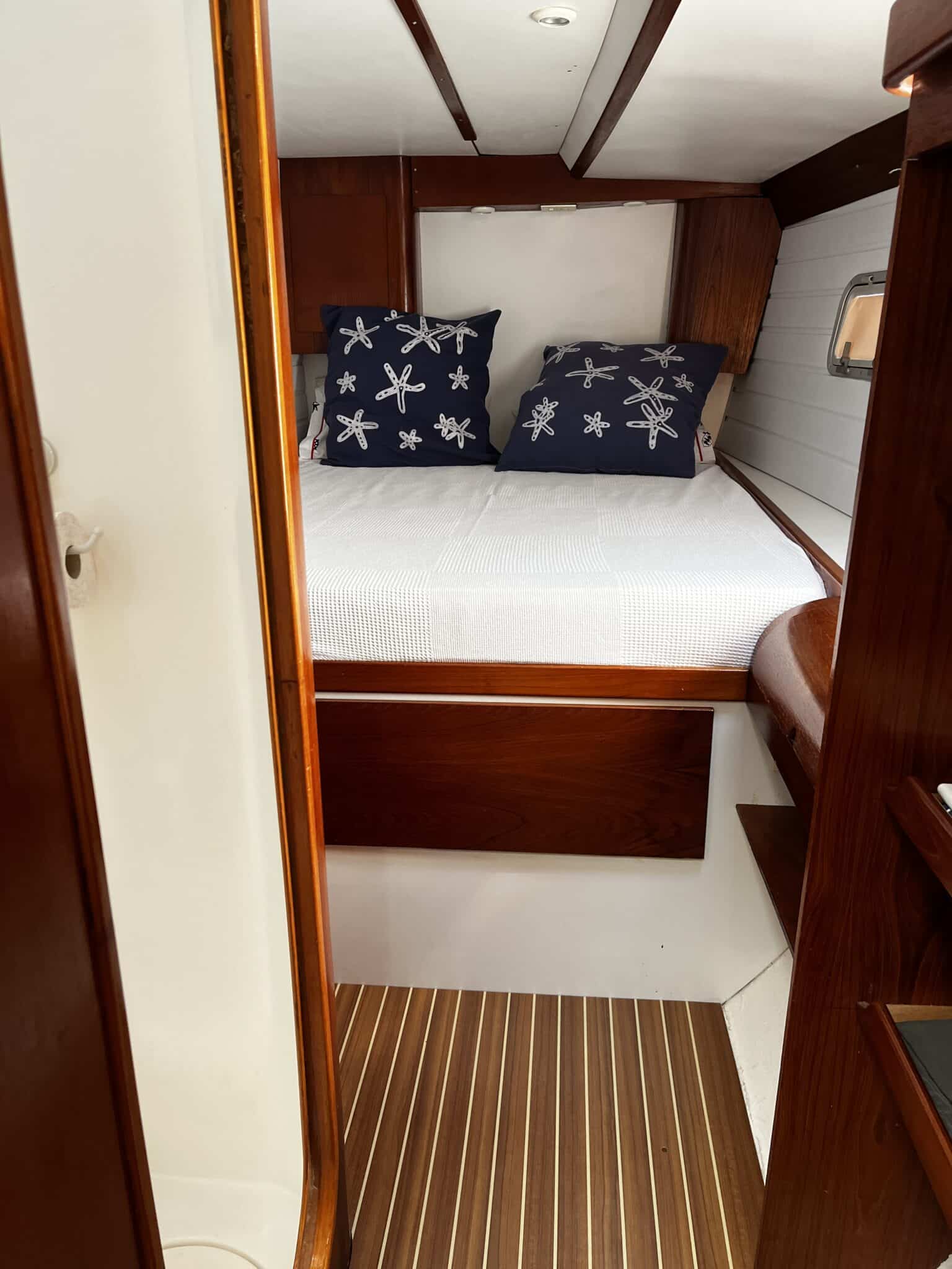 The rear cabin has a double berth, a large drawer and ample storage space underneath. The SSB Icom tuner is located above the bunk and two reading lights are located on the rear bulkhead. There is a closet with shelves e. A 220V outlet and a 220V outlet are located on the shelf under the secretary.