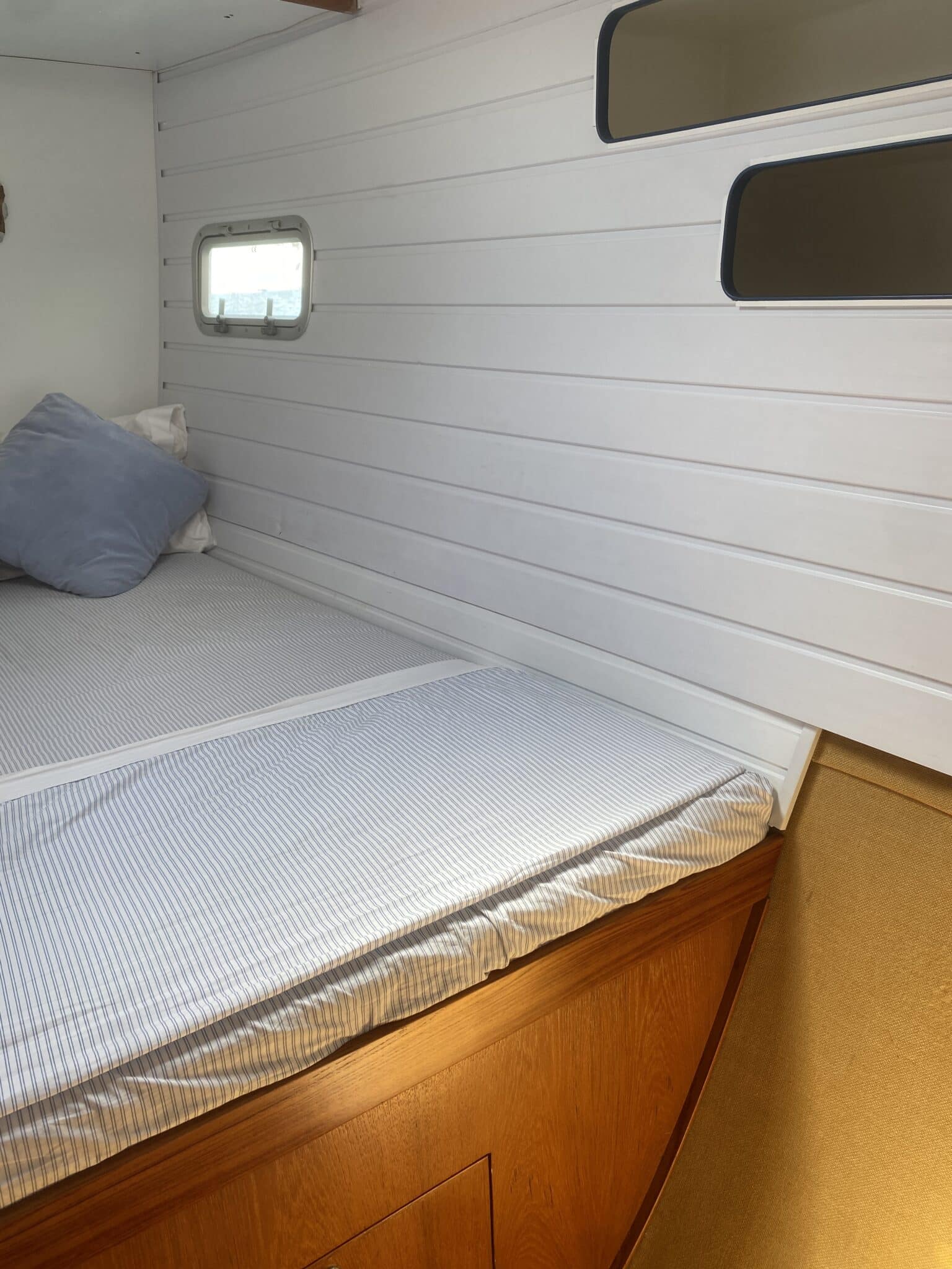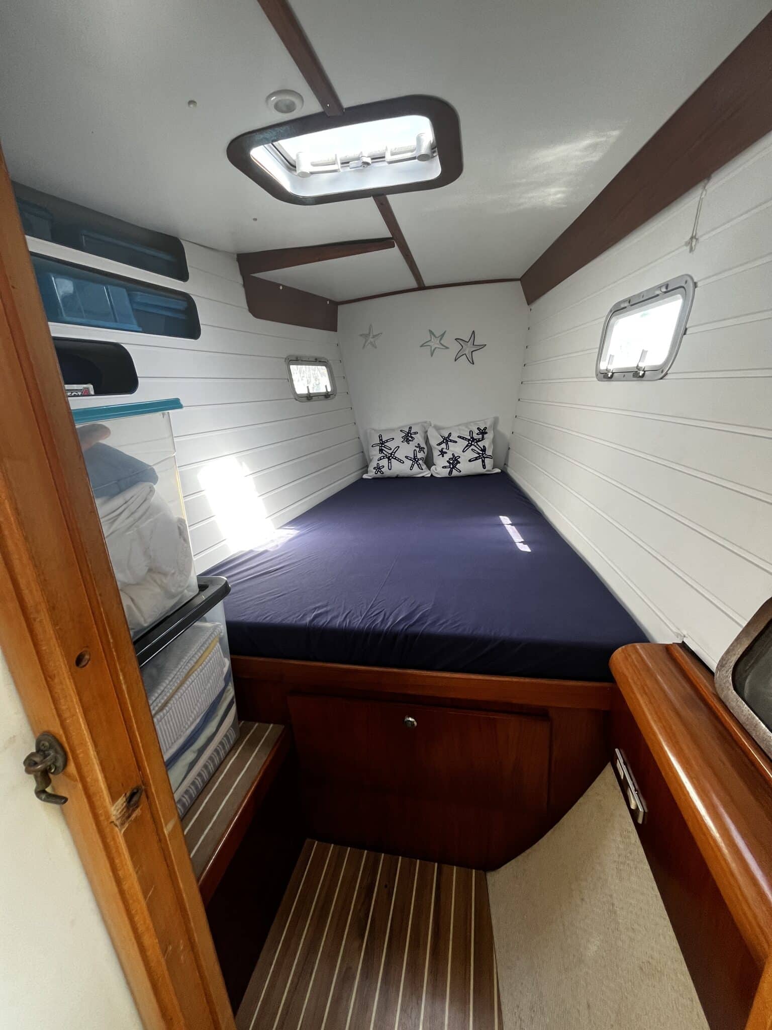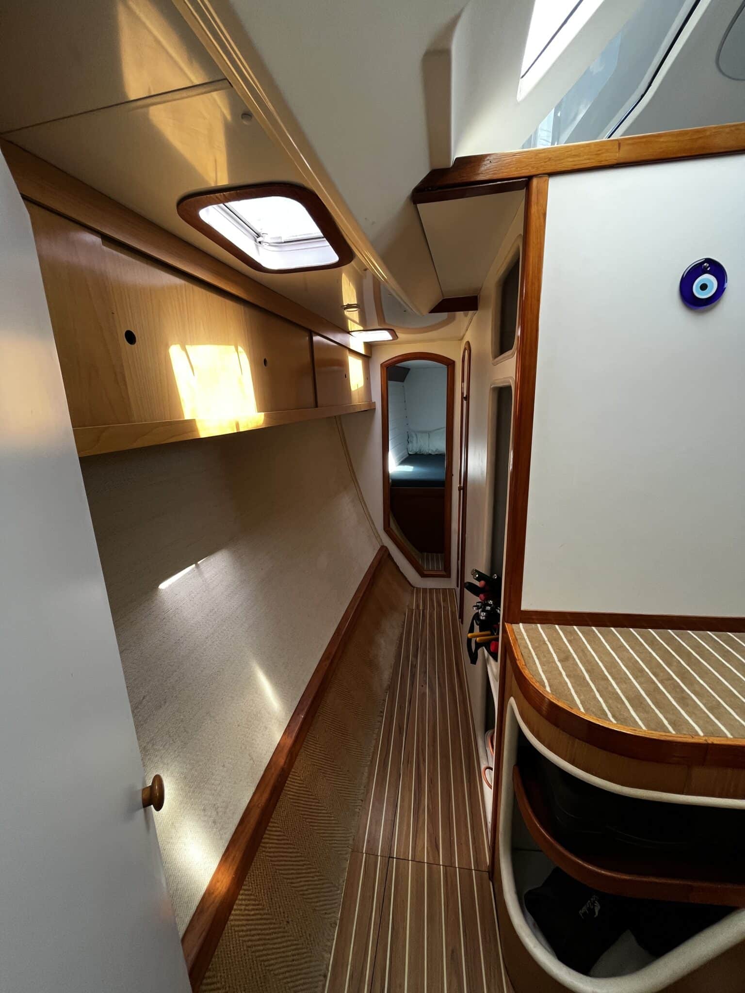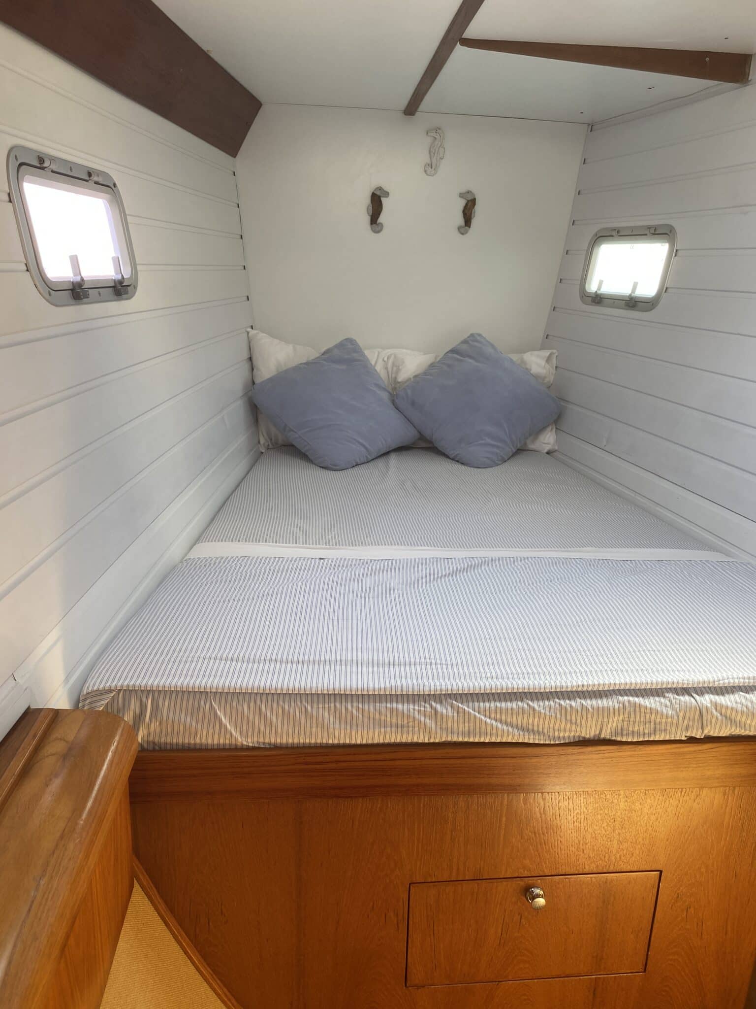 The rear cabin has a double berth, a large drawer and ample storage space underneath. The SSB Icom tuner is located above the bunk and two reading lights are located on the rear bulkhead. There is a closet with shelves e. A 220V outlet and a 220V outlet are located on the shelf under the secretary.