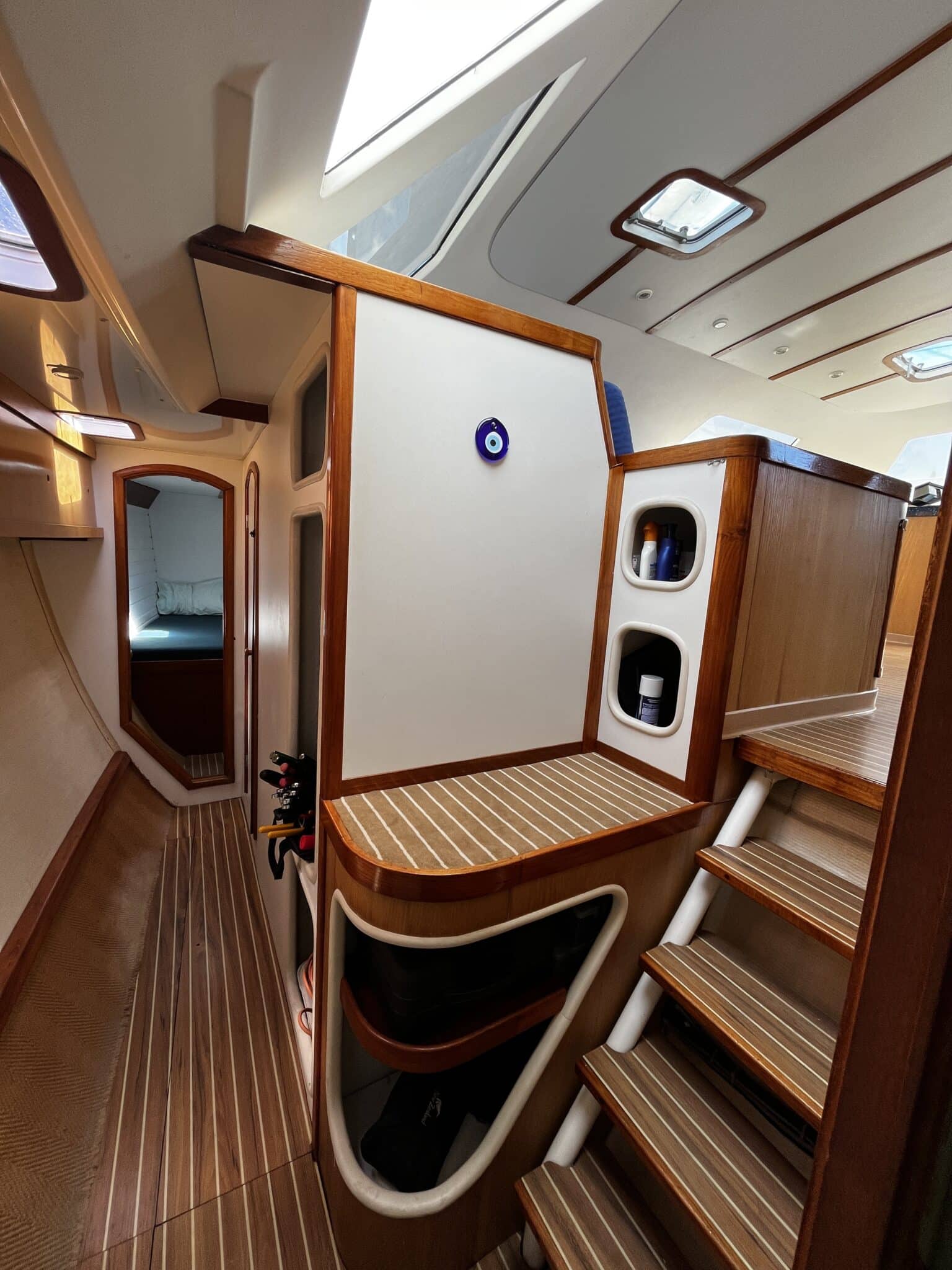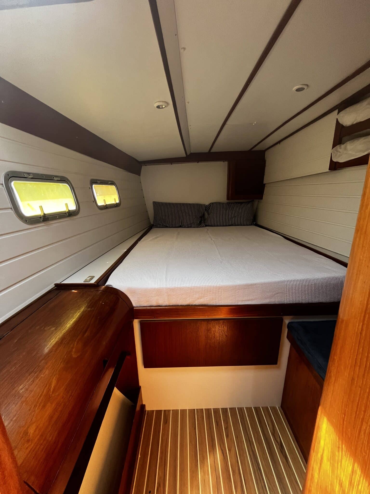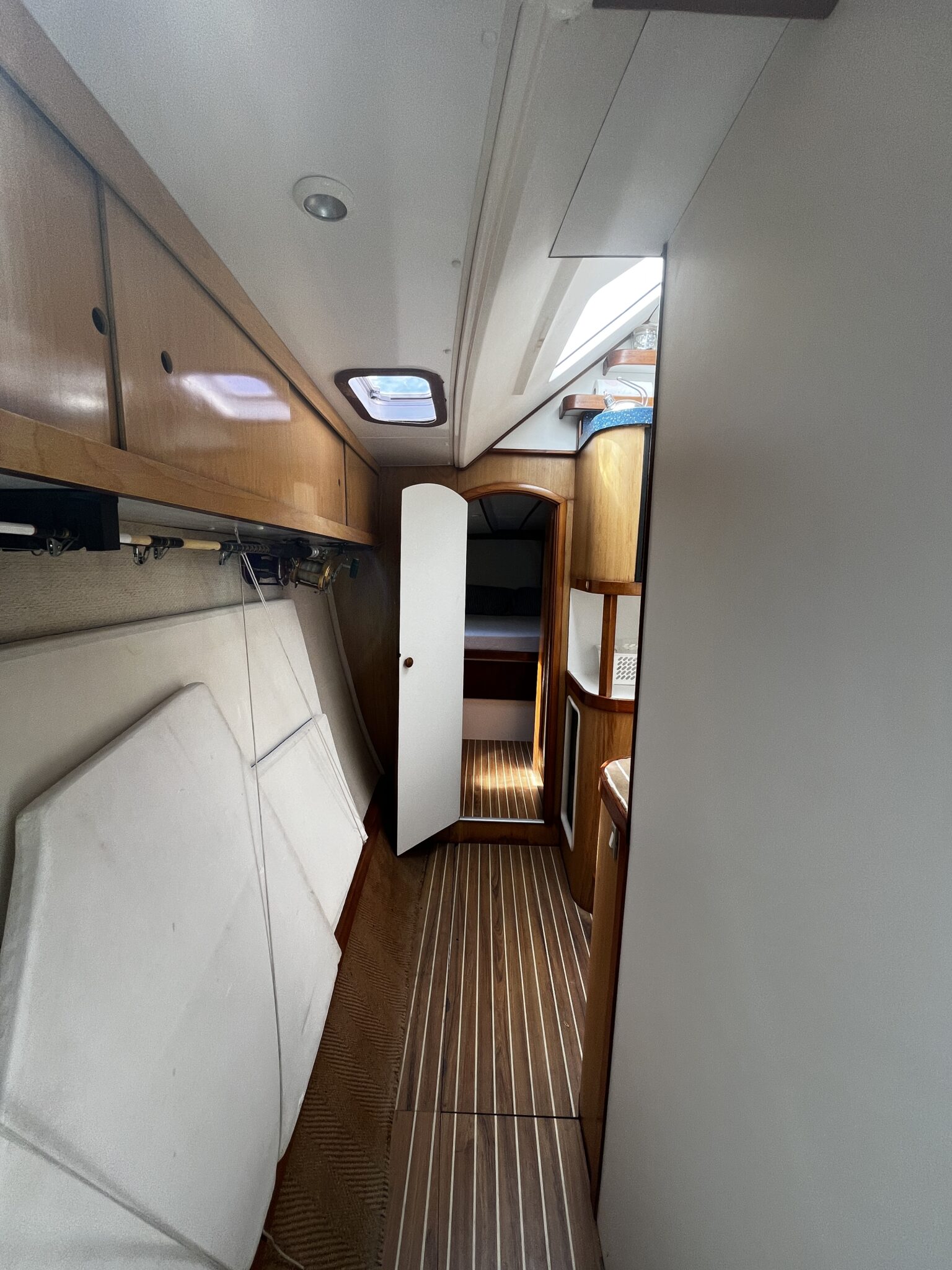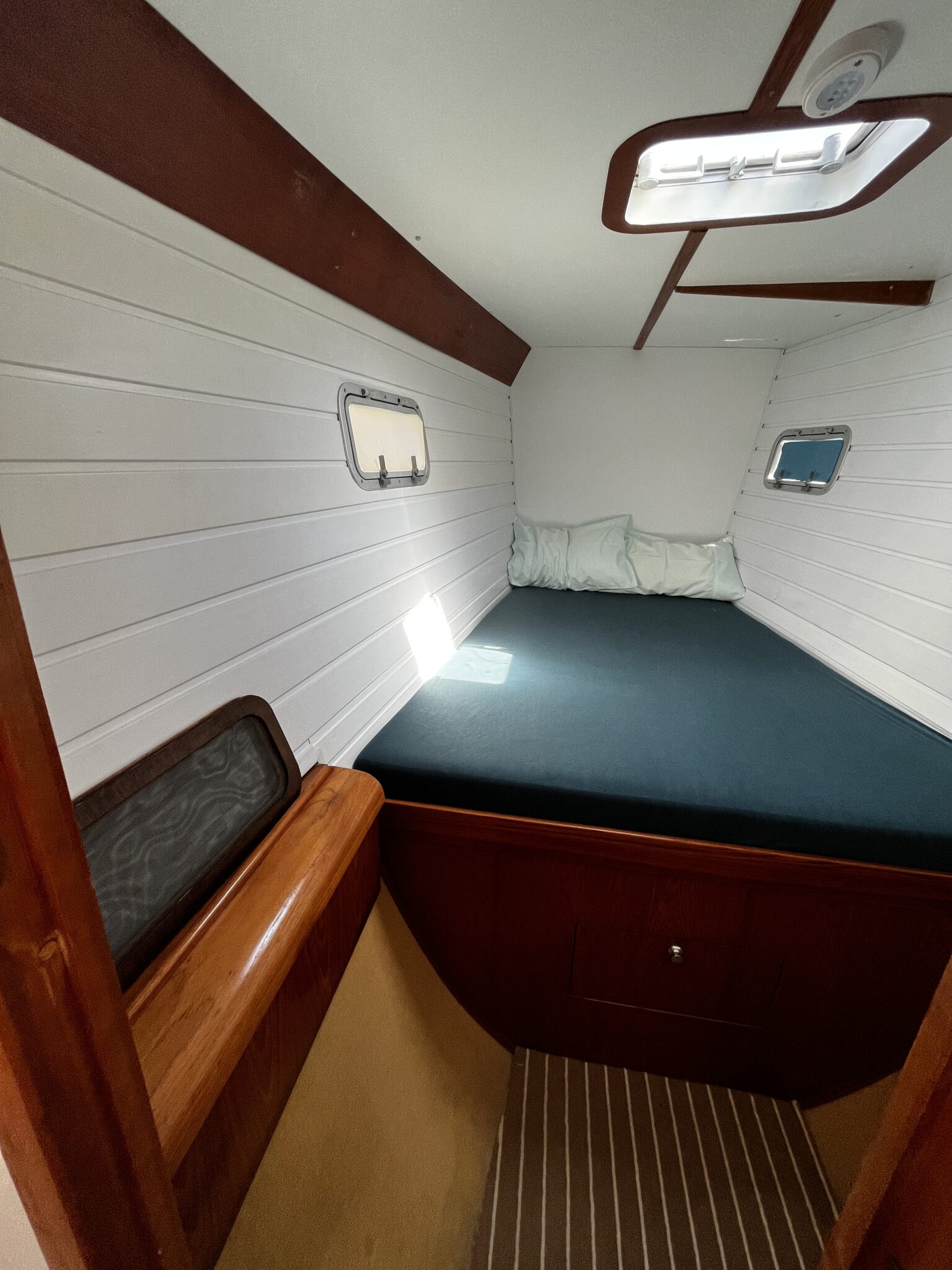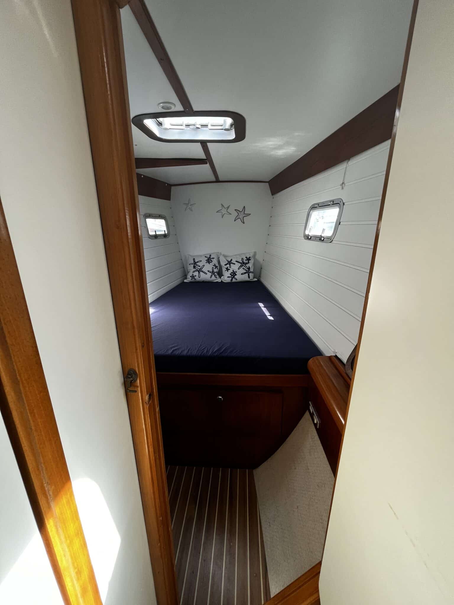 The rear cabin has a double berth, a large drawer and ample storage space underneath. The SSB Icom tuner is located above the bunk and two reading lights are located on the rear bulkhead. There is a closet with shelves e. A 220V outlet and a 220V outlet are located on the shelf under the secretary.