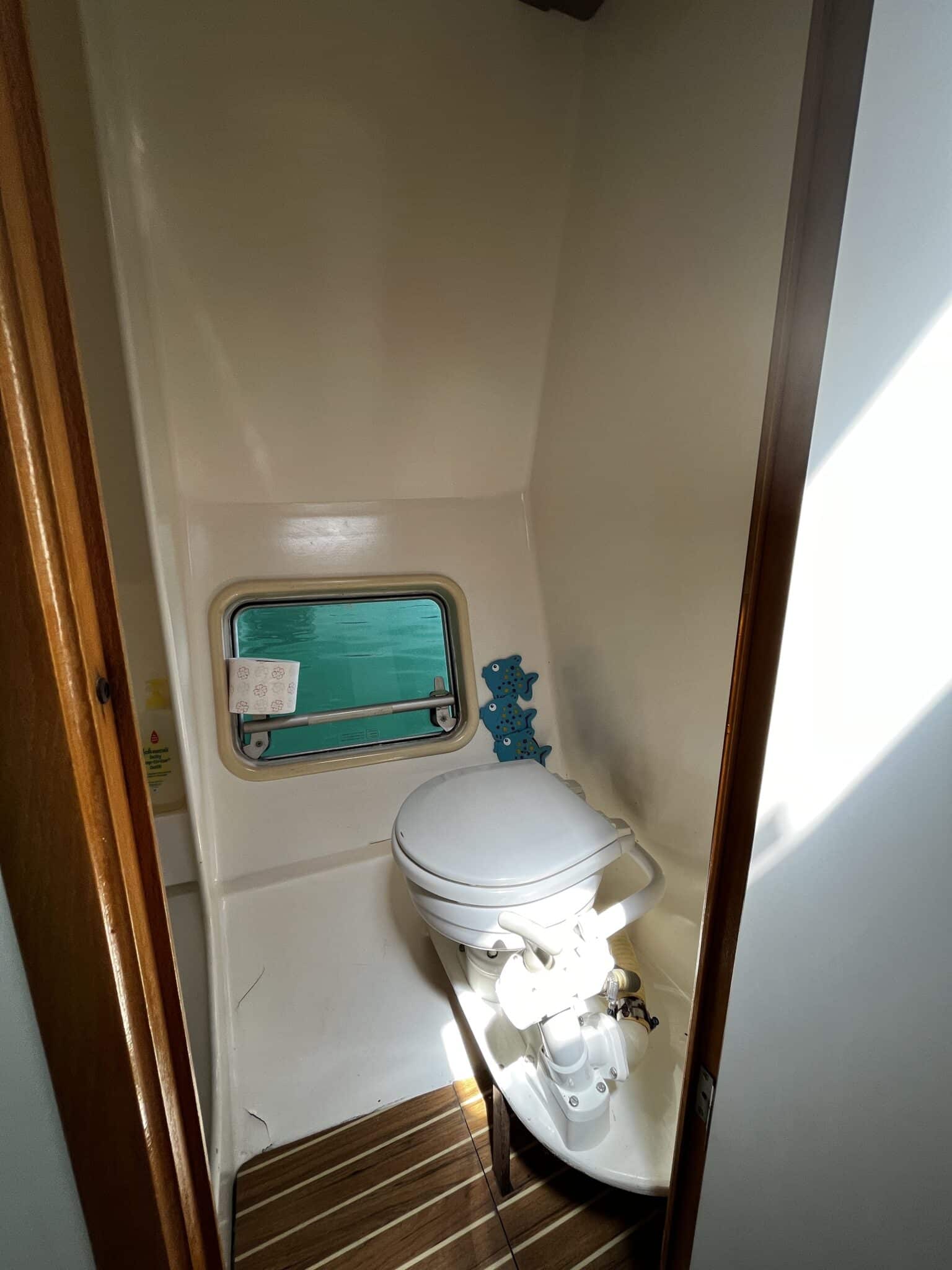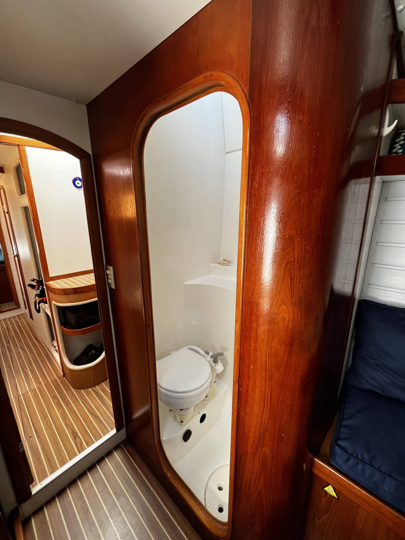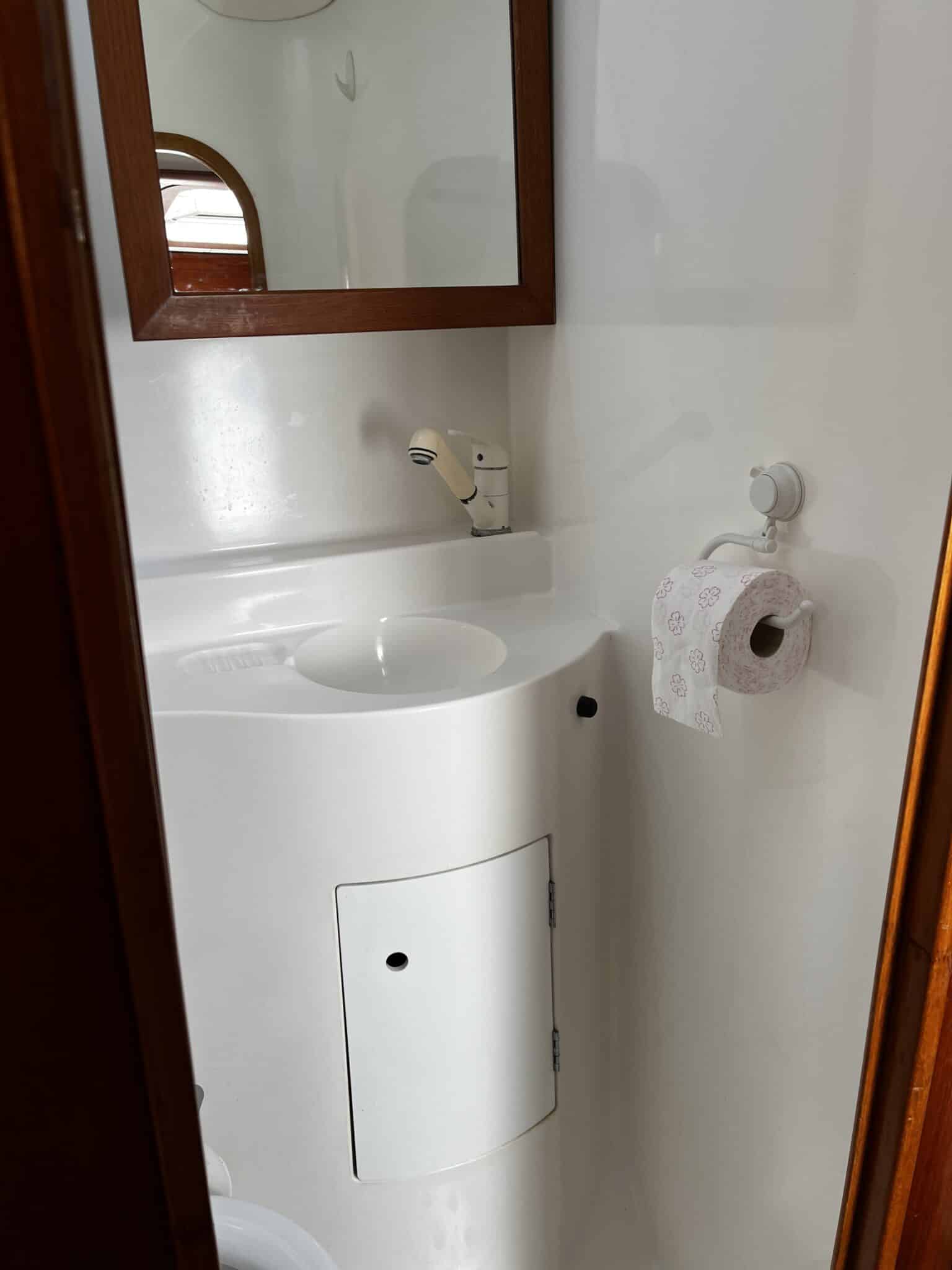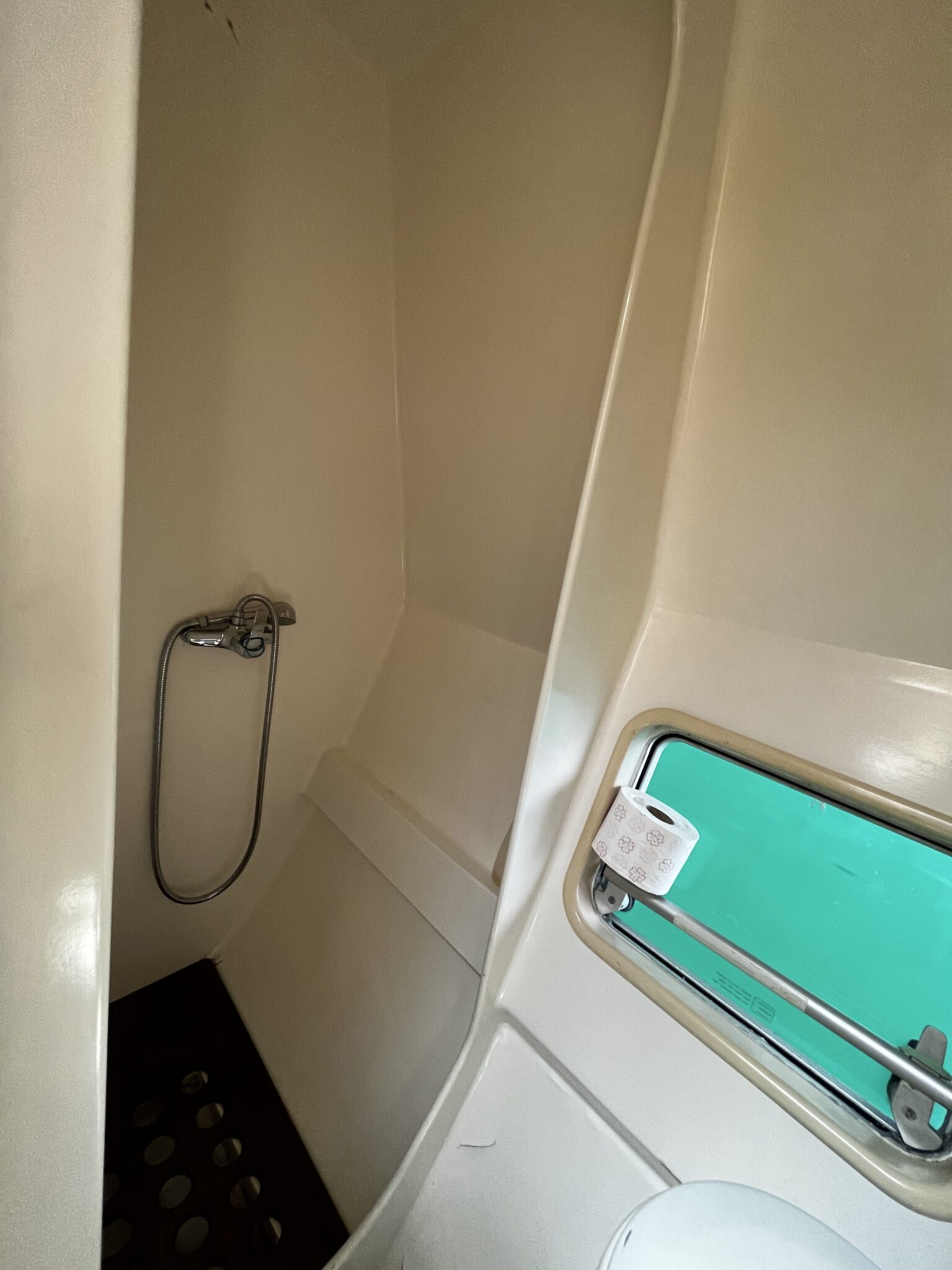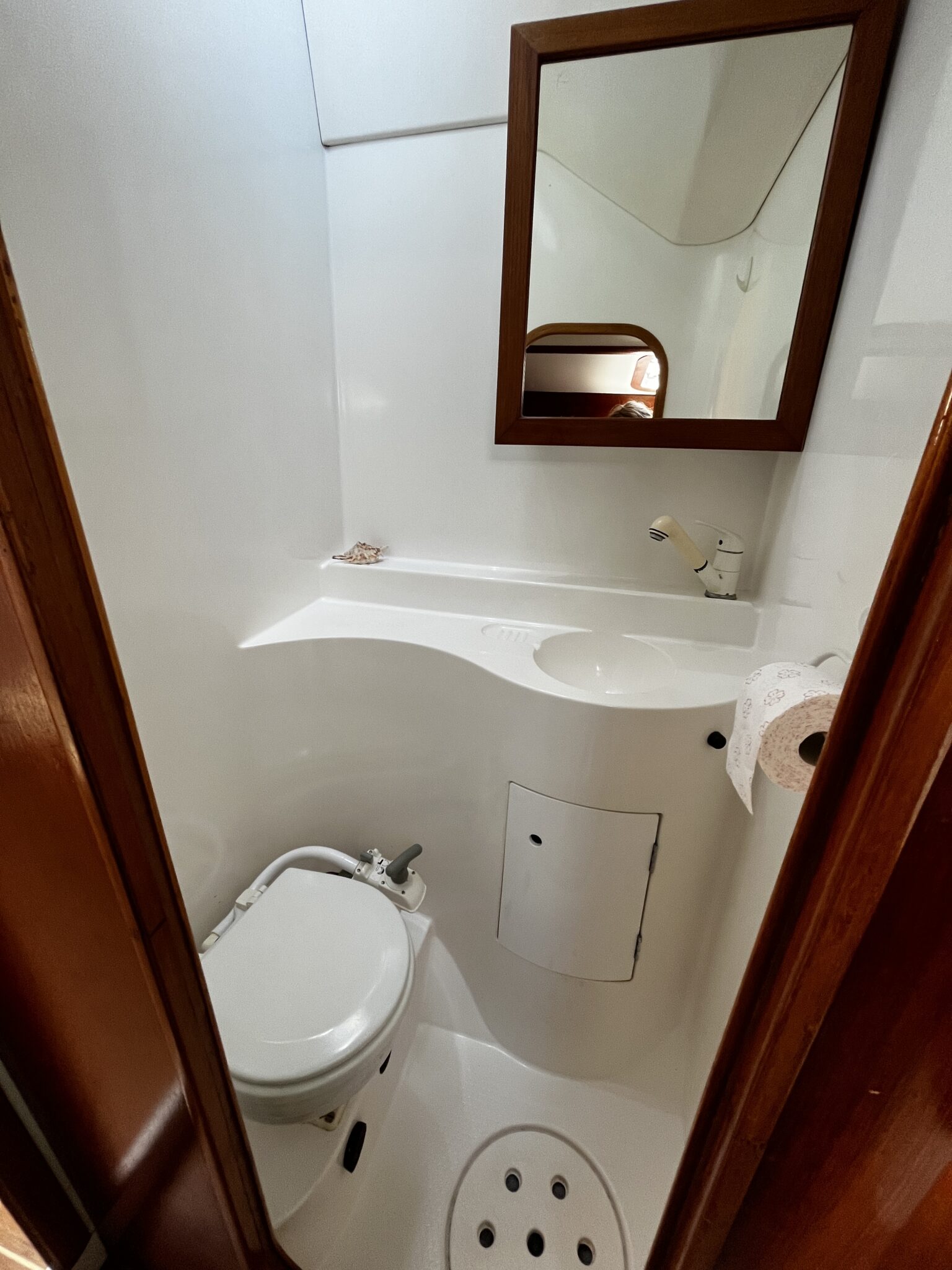 The bathroom is equipped with a handheld shower and a toilet with mirror. The Jabsco toilet pod is manual, but an electric adapter is available for installation. The shower area is made of white molded polyester, with hot/cold water under pressure.