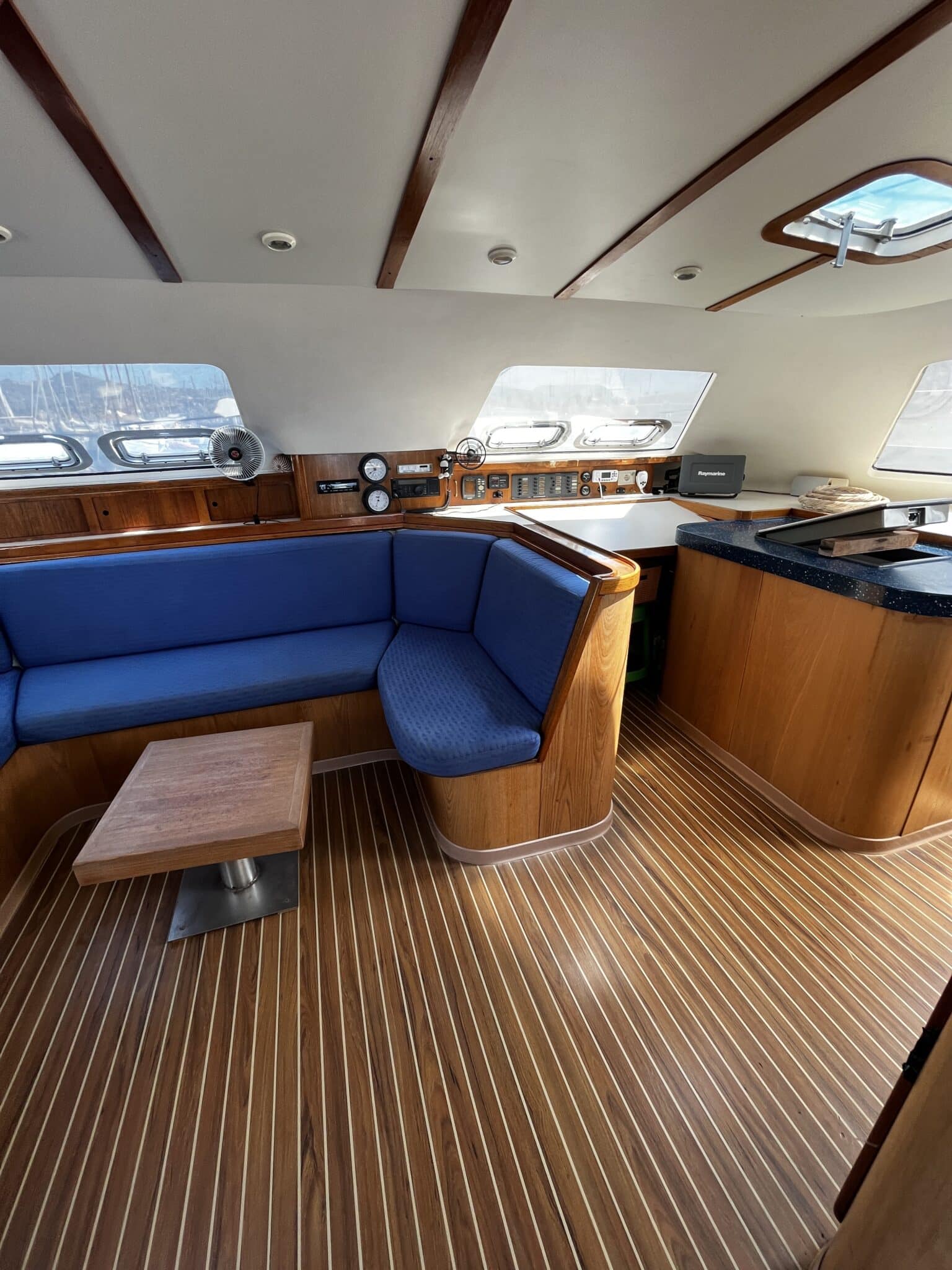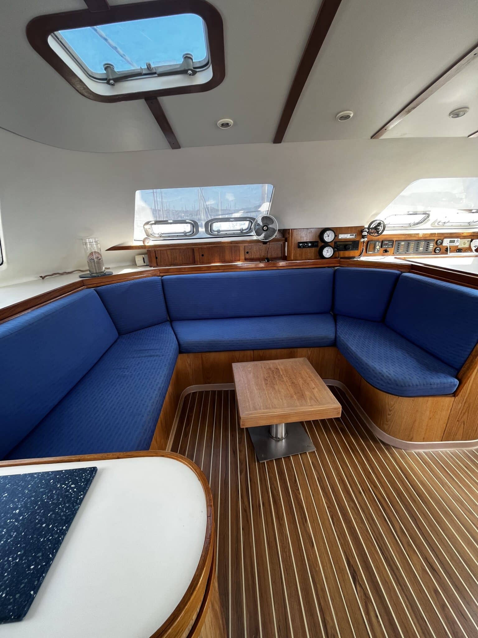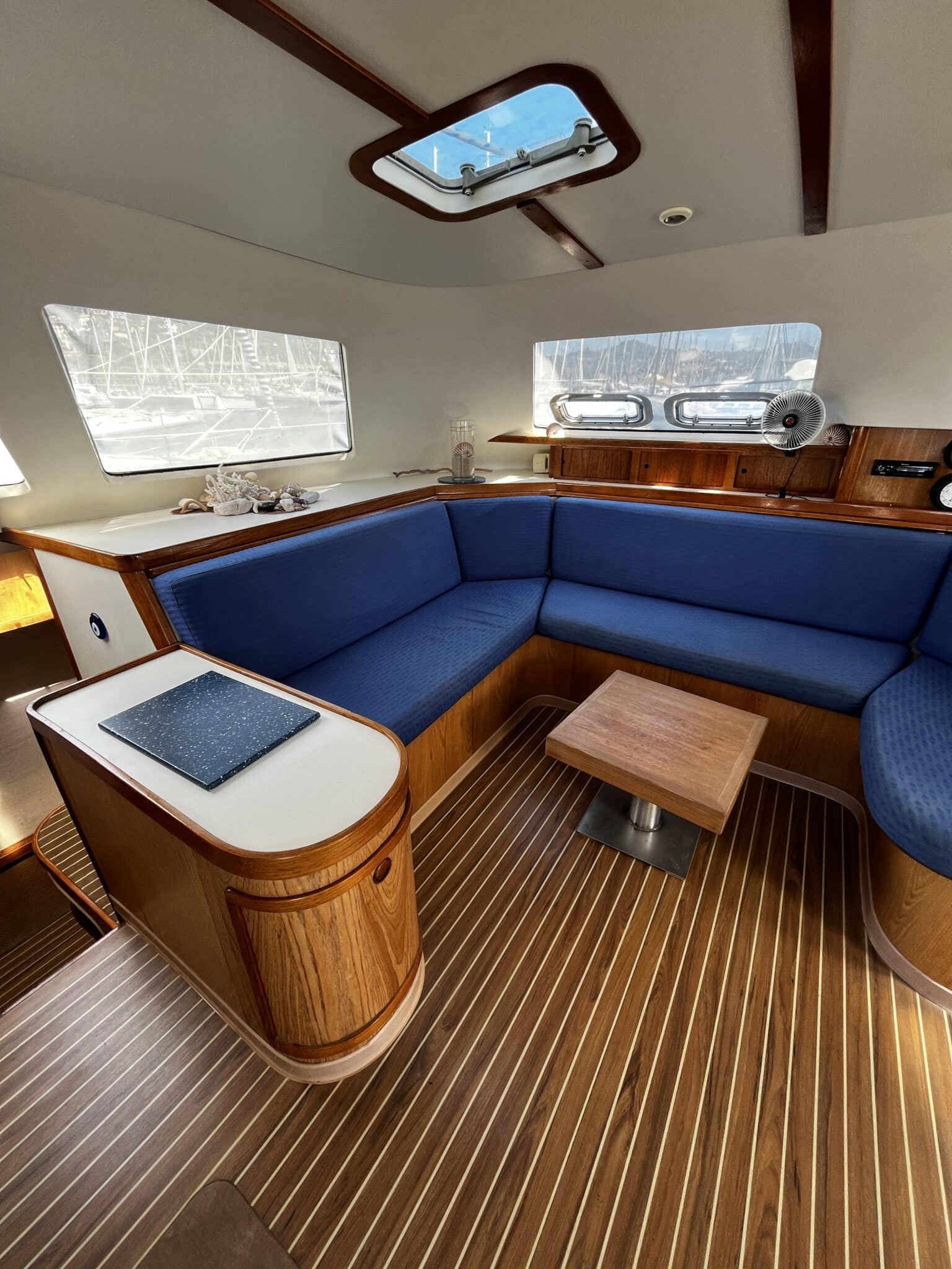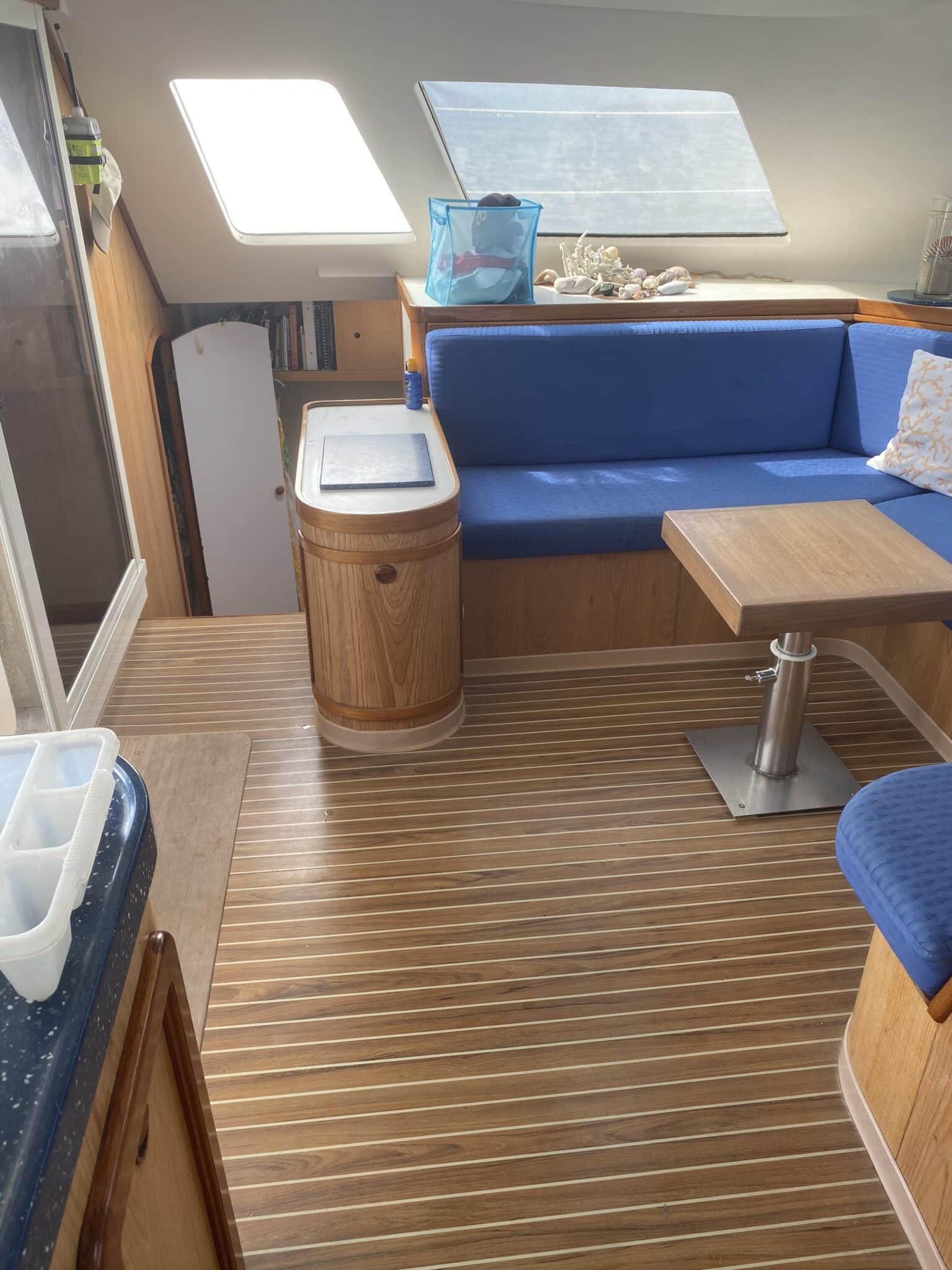 The salon settee was reupholstered in 2005 with Jeanneau’s recommended Macro Cotton treated fabric. There are also a number of new matching cushions.