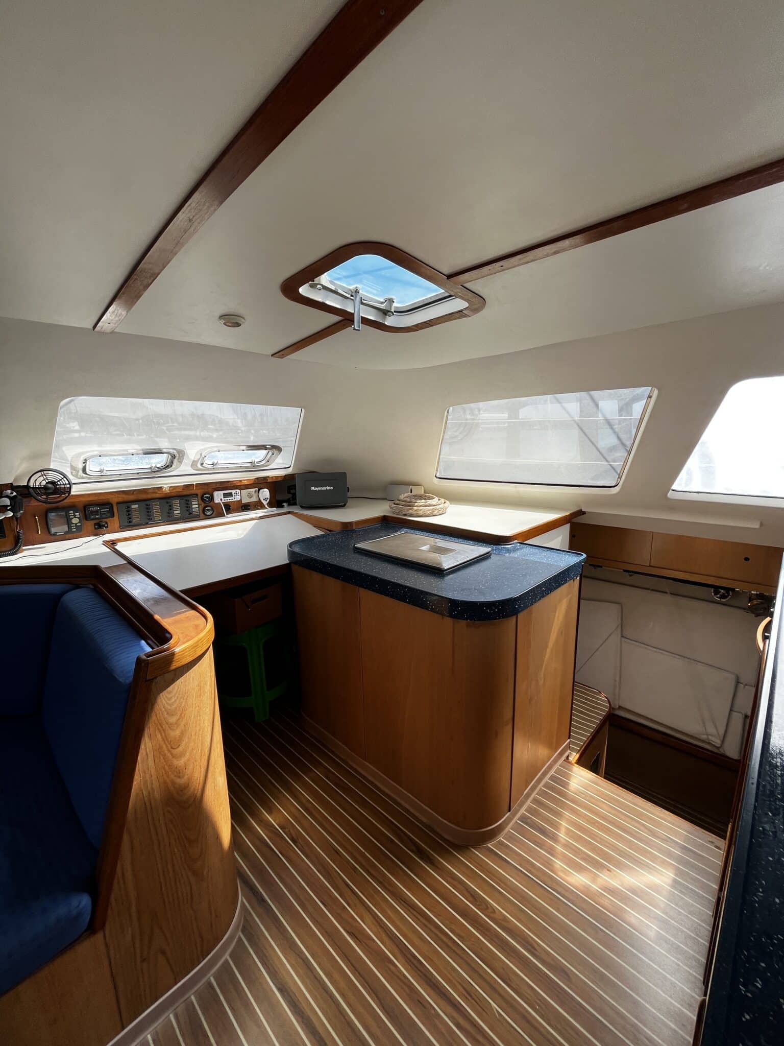 The nav station is located on the starboard side next to the galley and faces forward with radios, an electrical distribution panel, a chart table and a shelf for storing charts.