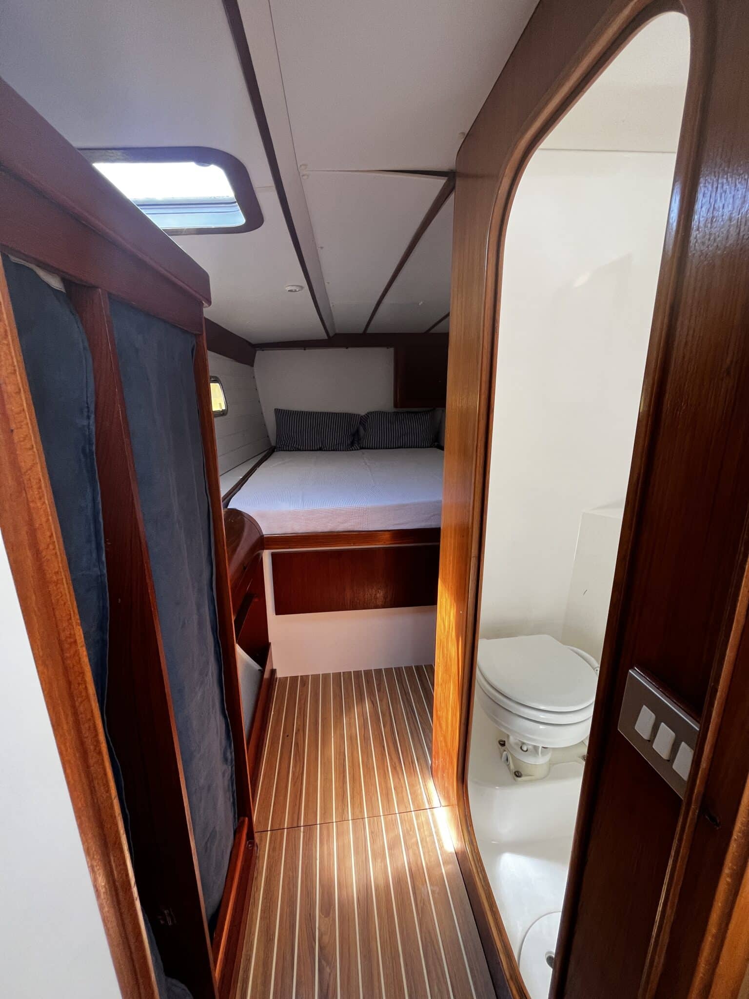 The center passageway has compartmentalized shelves at the headboard, with two heavy-duty ocean-going fishing rods and reels (Shimano and Penn) on racks below. Inside is a large toilet (Jabsco manual toilet) and a walk-in shower. There is a large molded shower stall with a hot/cold pressure shower, teak grate and sump pump.