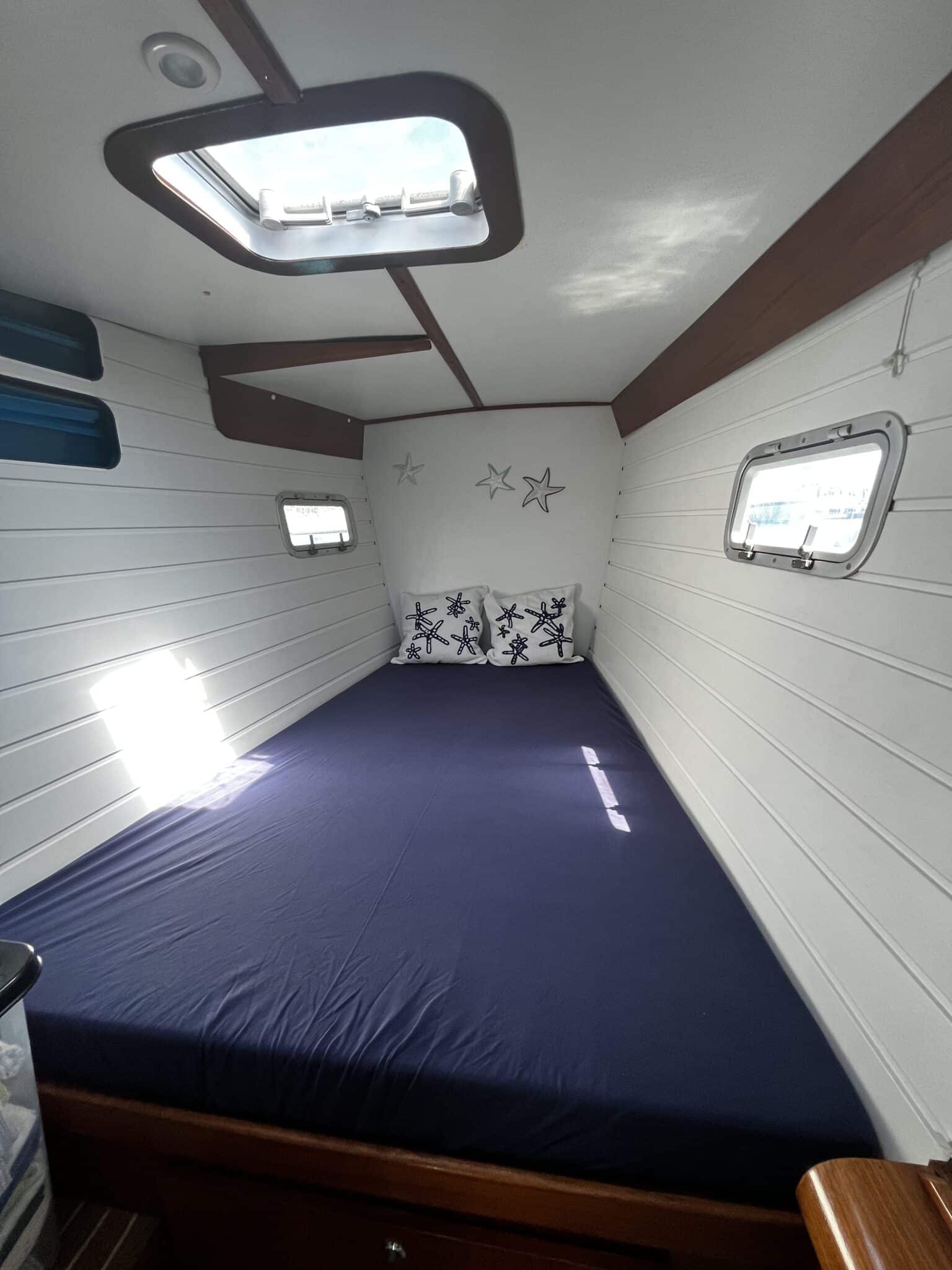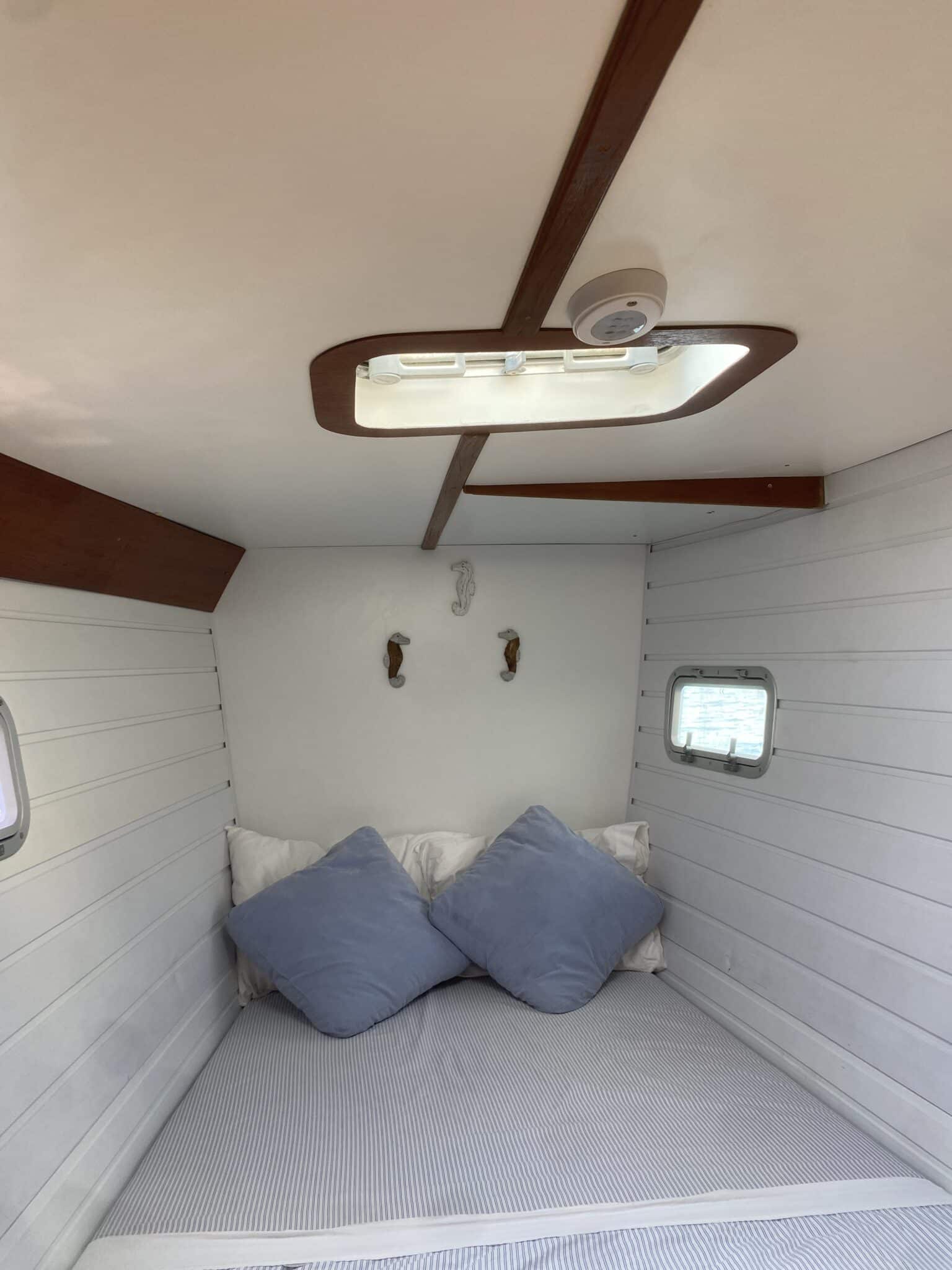 Two portholes and a large deck hatch provide light and ventilation. They are equipped with mosquito nets.