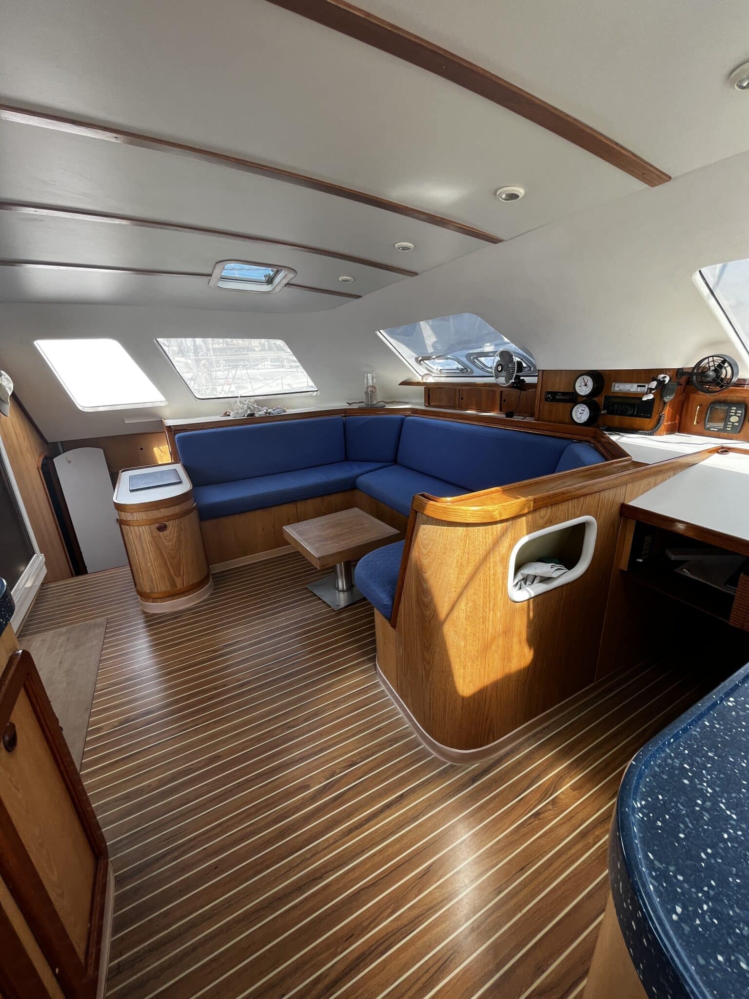Kassoumay was designed by its first owner who wanted to maintain maximum performance in a comfortable family layout. The cockpit is separated by two large sliding doors that open the salon to the cockpit, forming a large walk-in space.