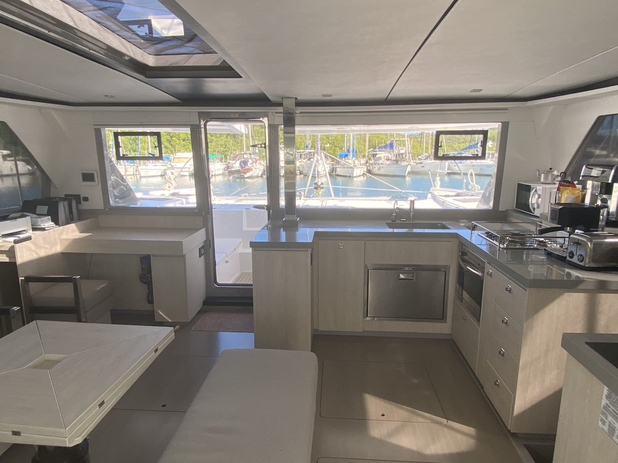 Large main cabin open to front and rear cockpits, galley to starboard, chart table/desk to port
