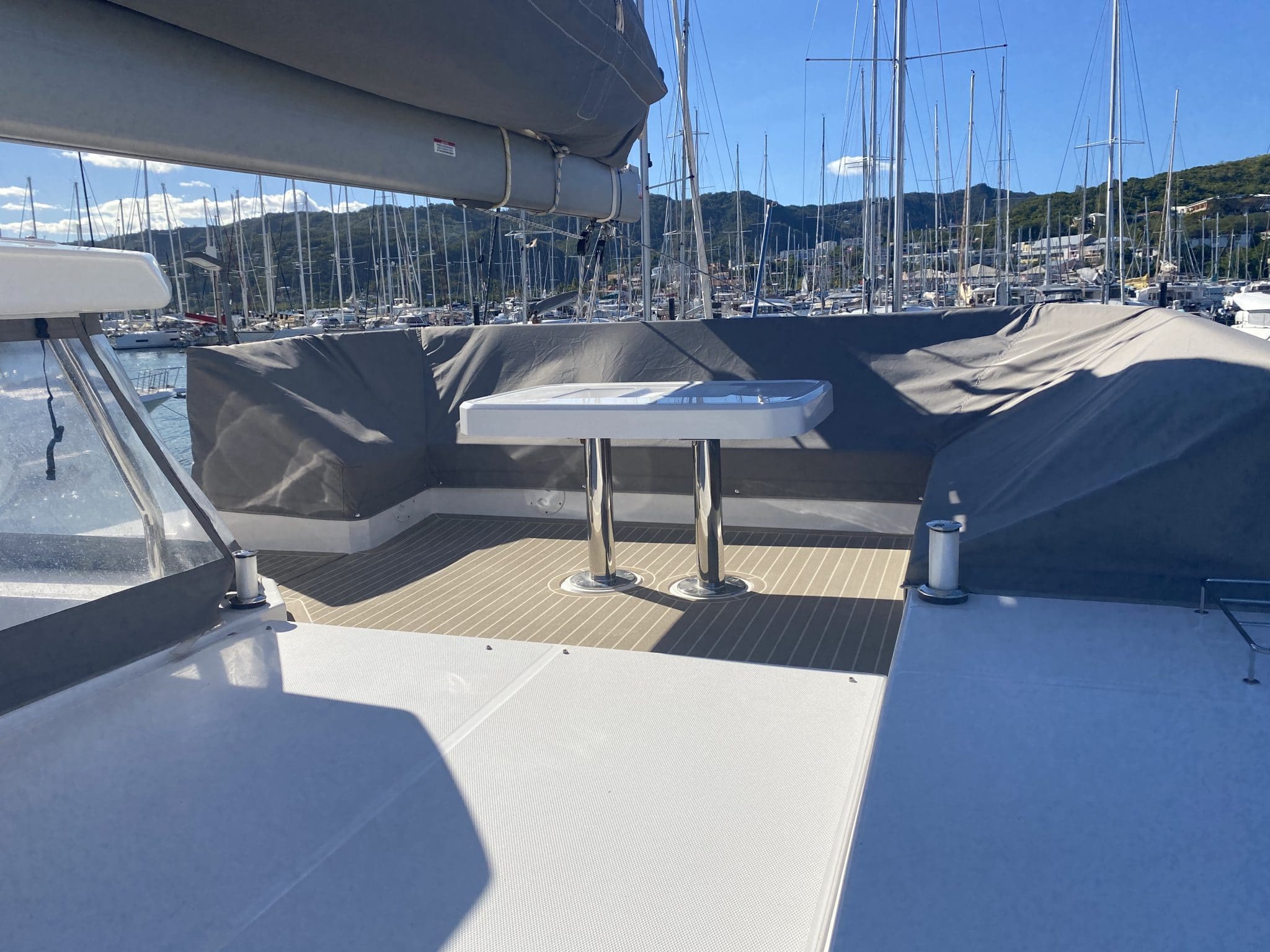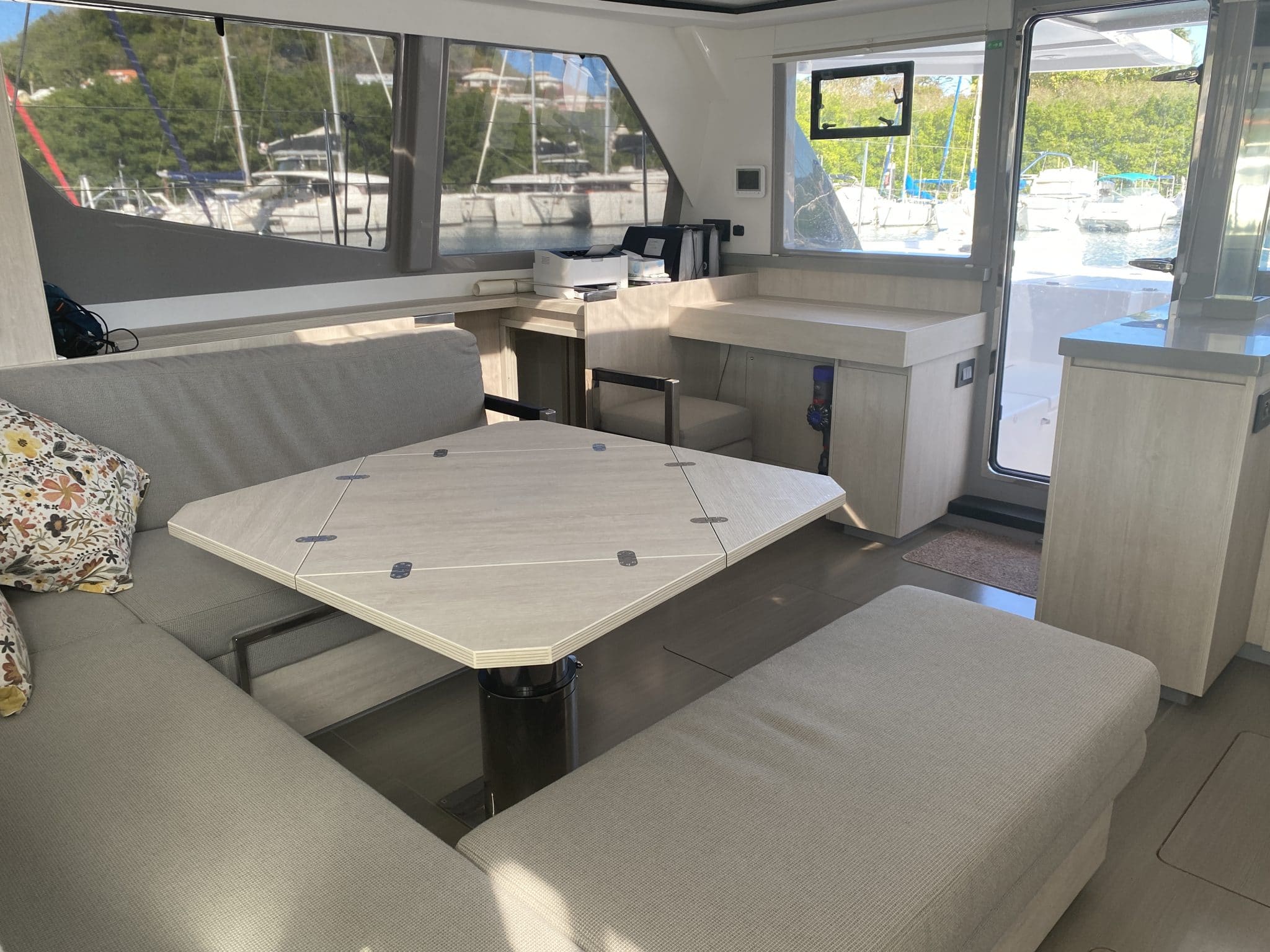 Coachroof lounge : L shaped settee, cushions, sunbed mattress, table, pop-up lights