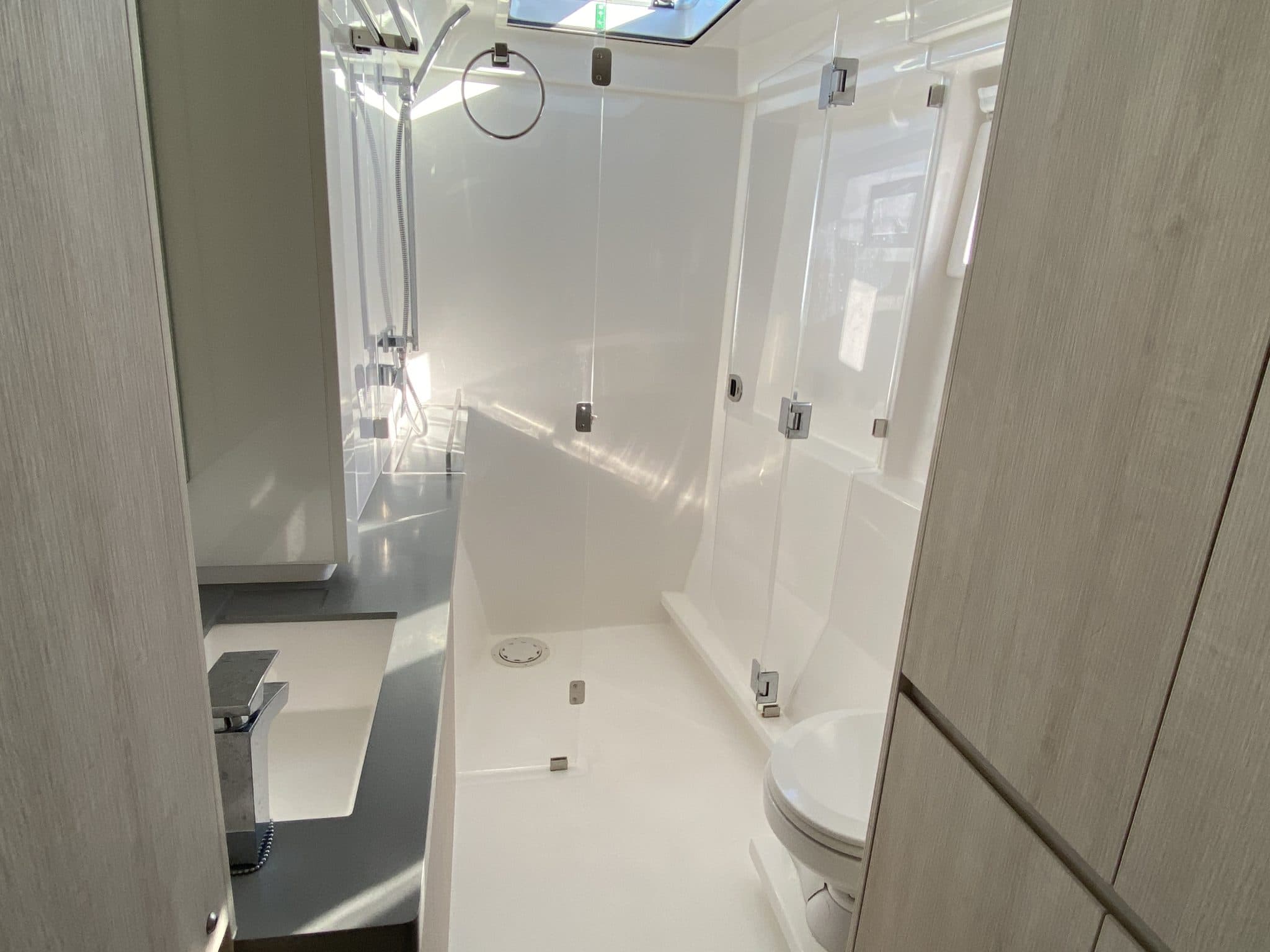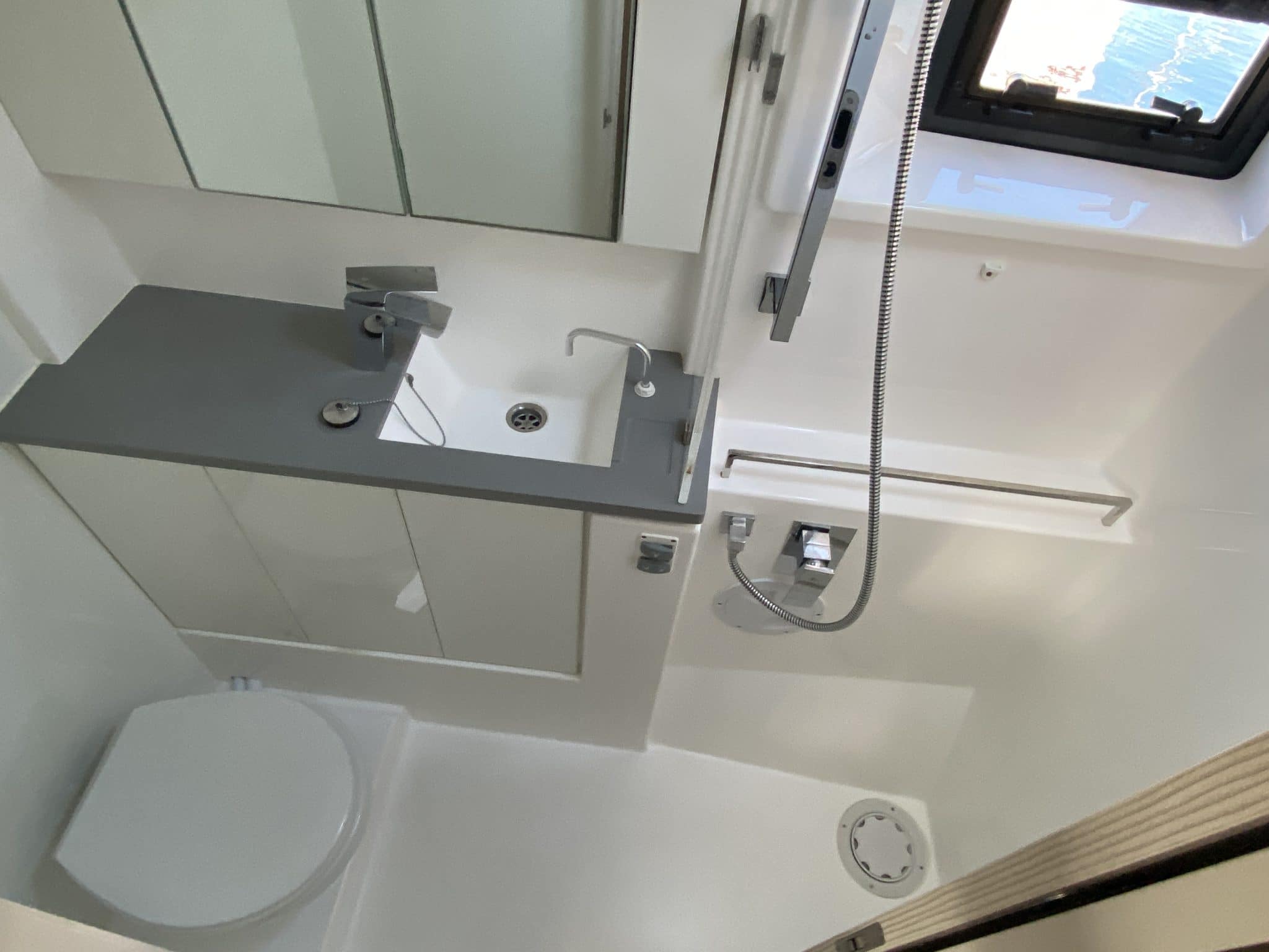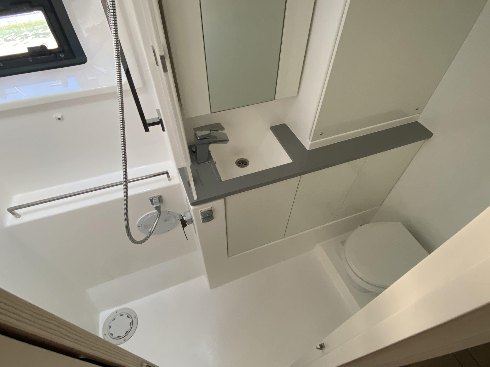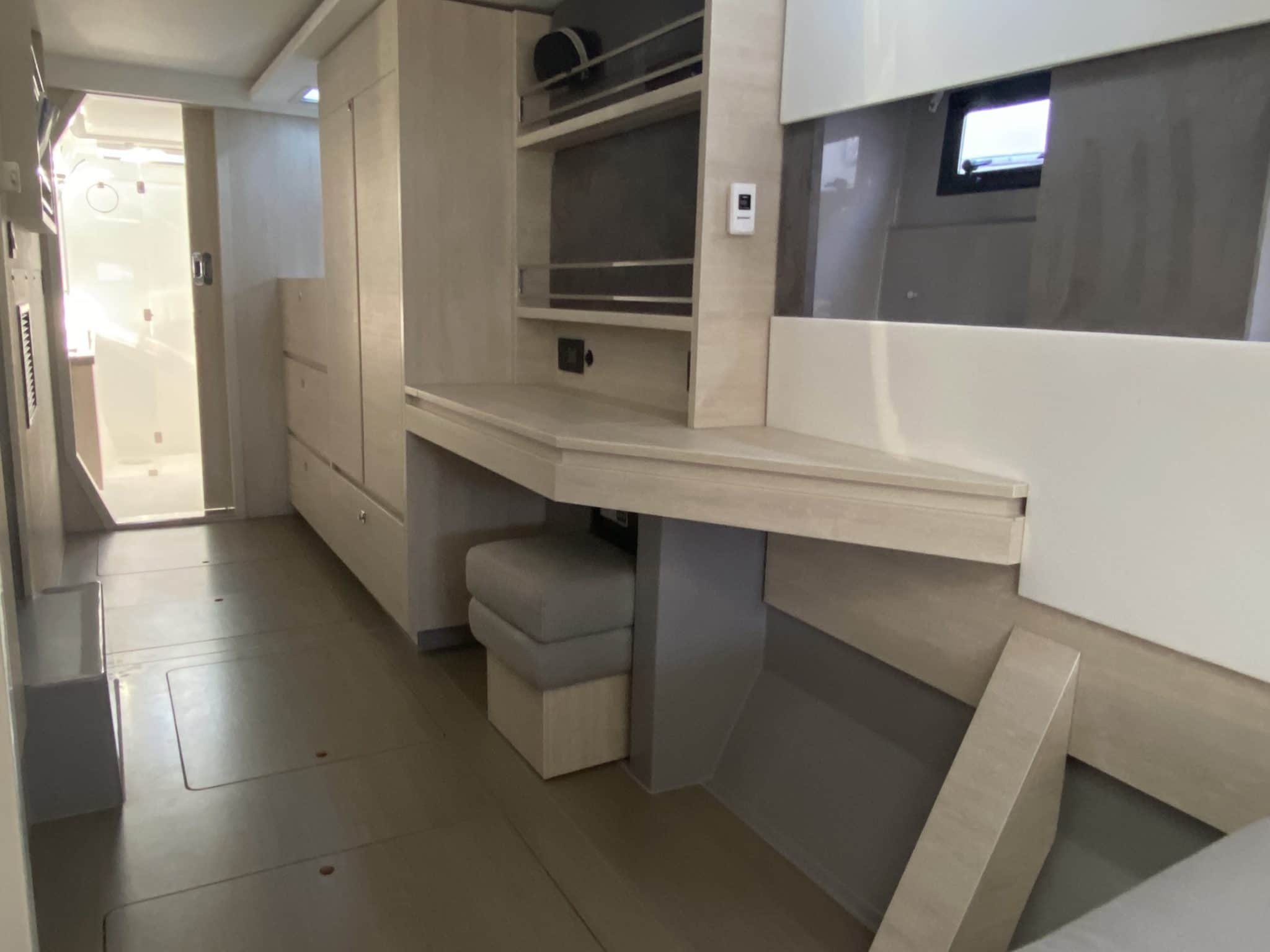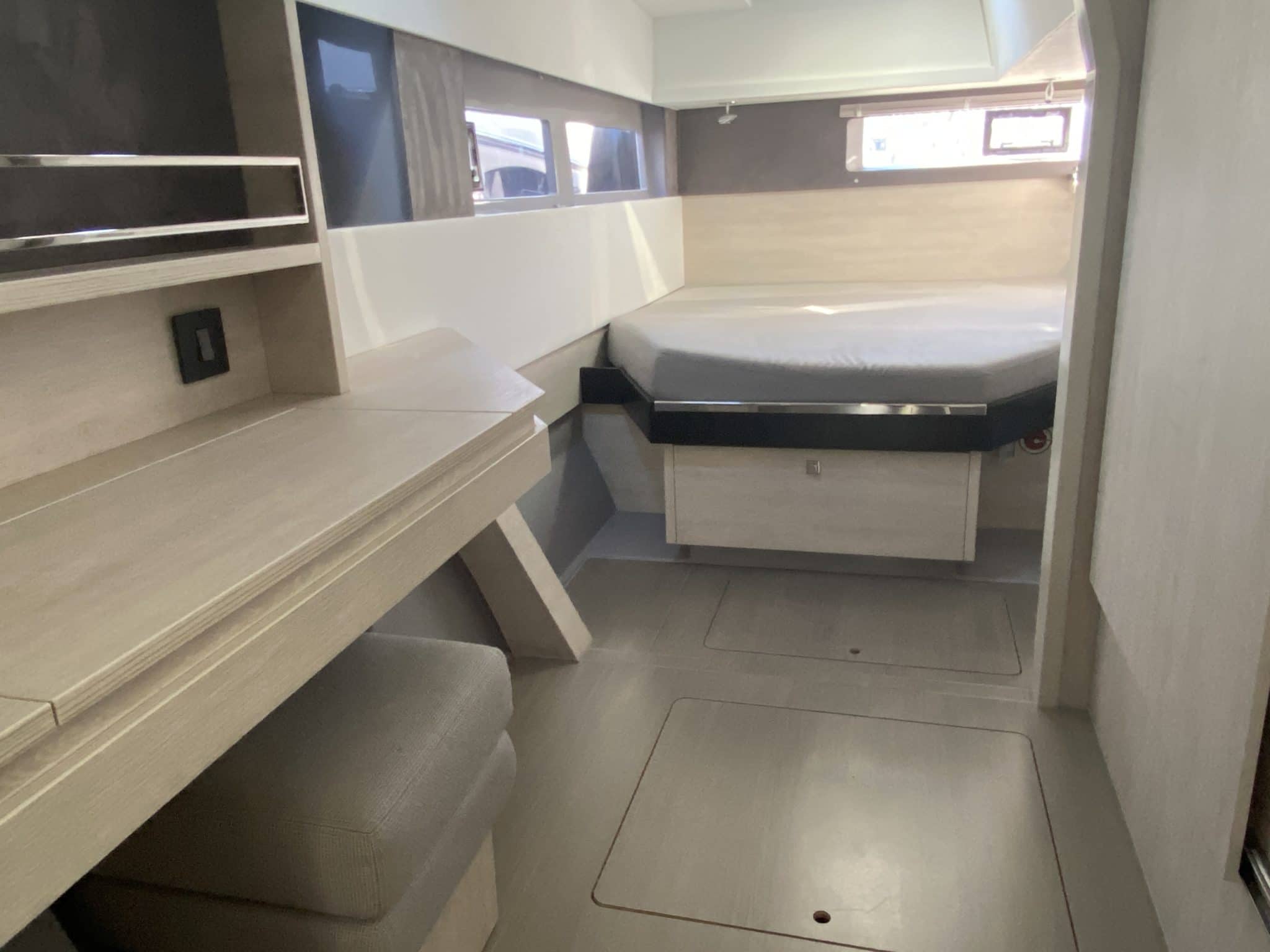 Spacious owner’s suite on starboard : master cabin with double berth (1,50×2,05 m), desk, many storages, head with large shower, electric toilet with hygienic shower,…