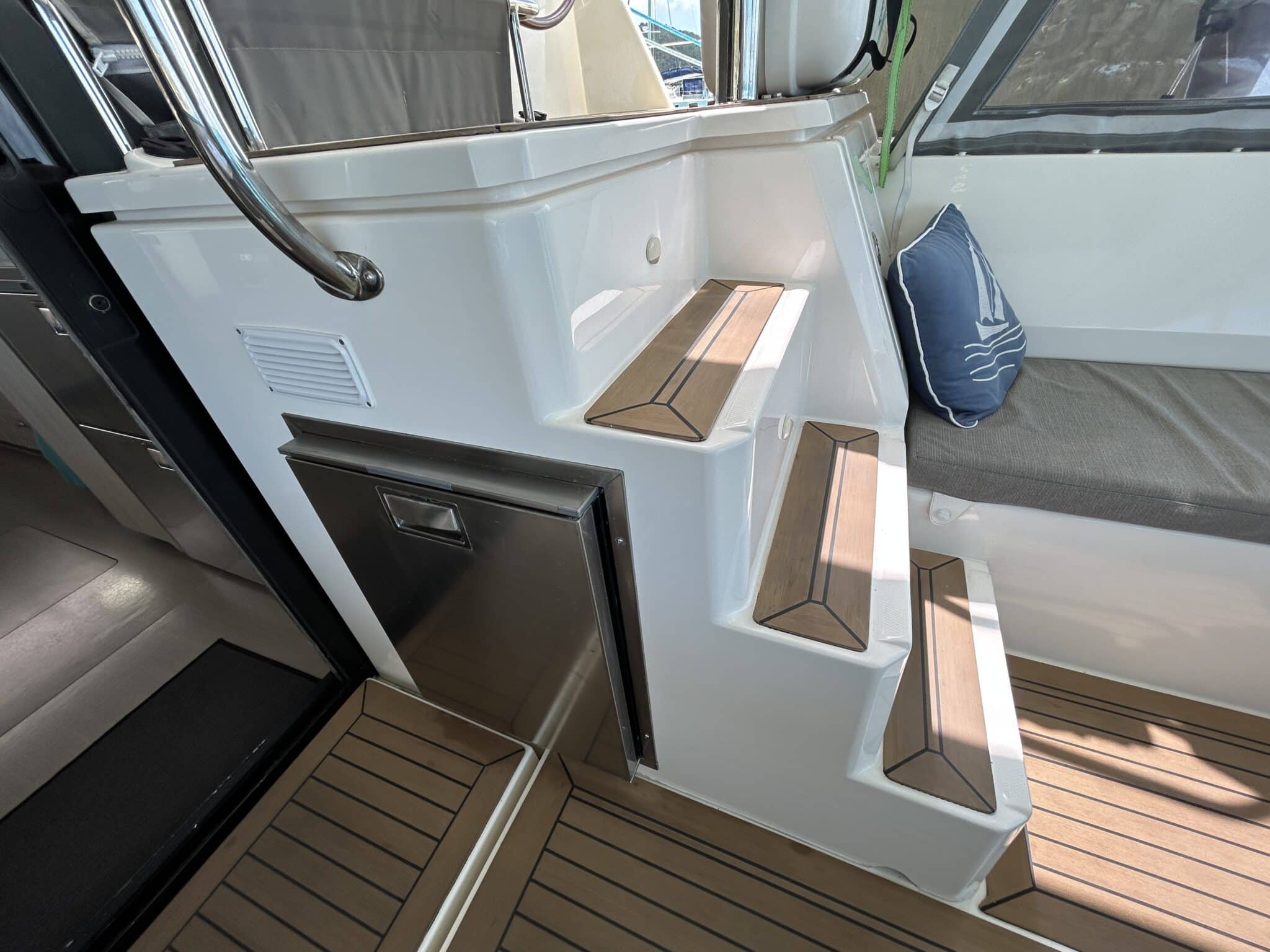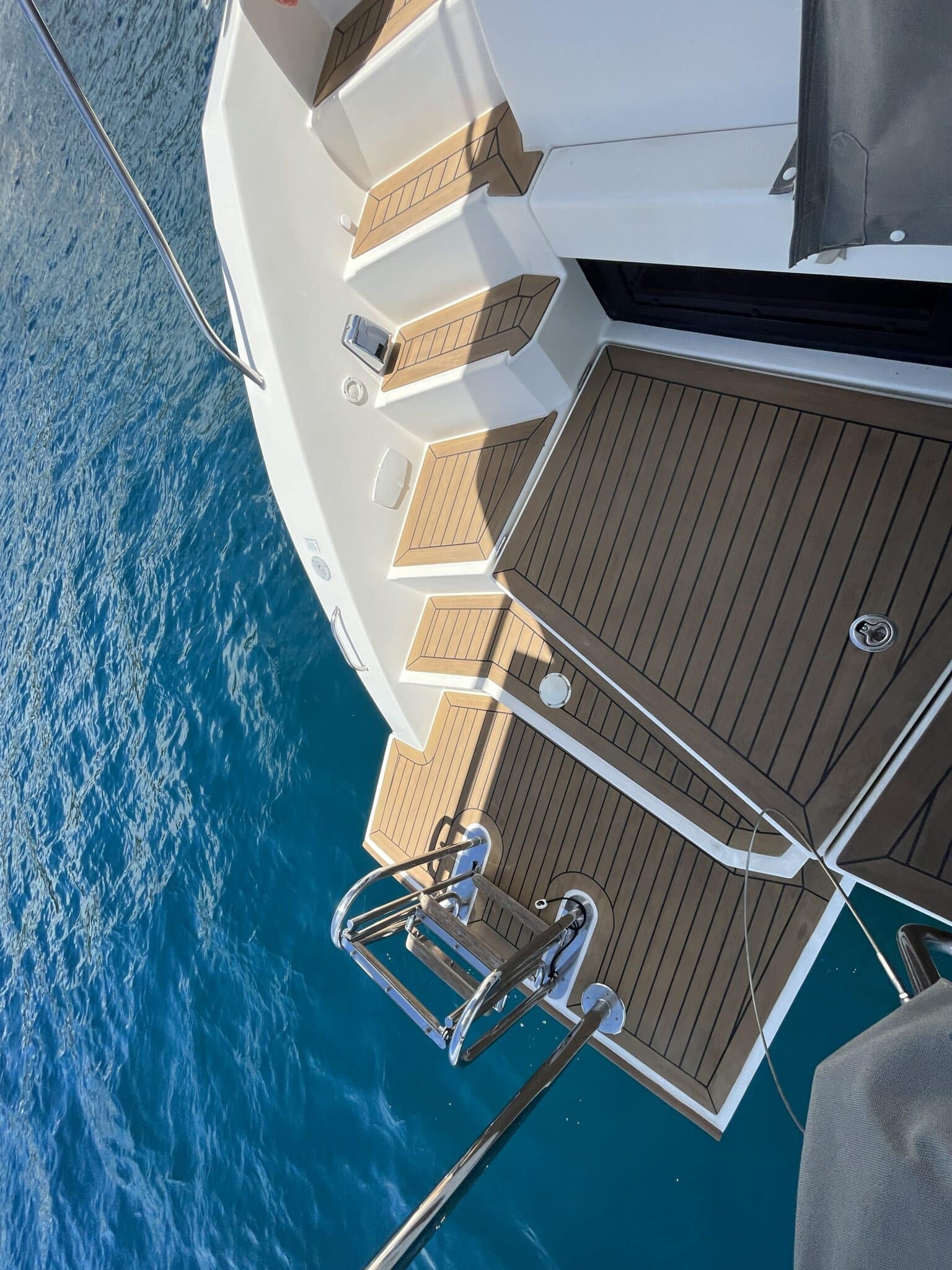 Composite teak deck: aft cockpit, forward cockpit, steering platform, steps on transom and roof lounge.