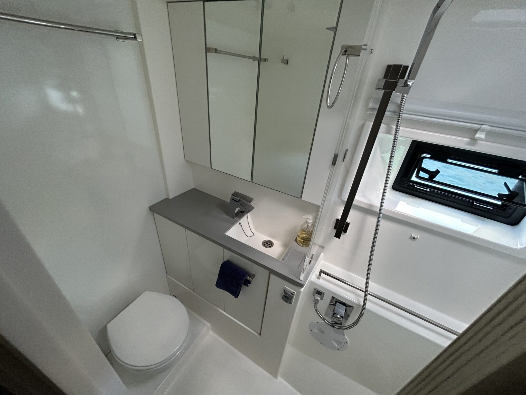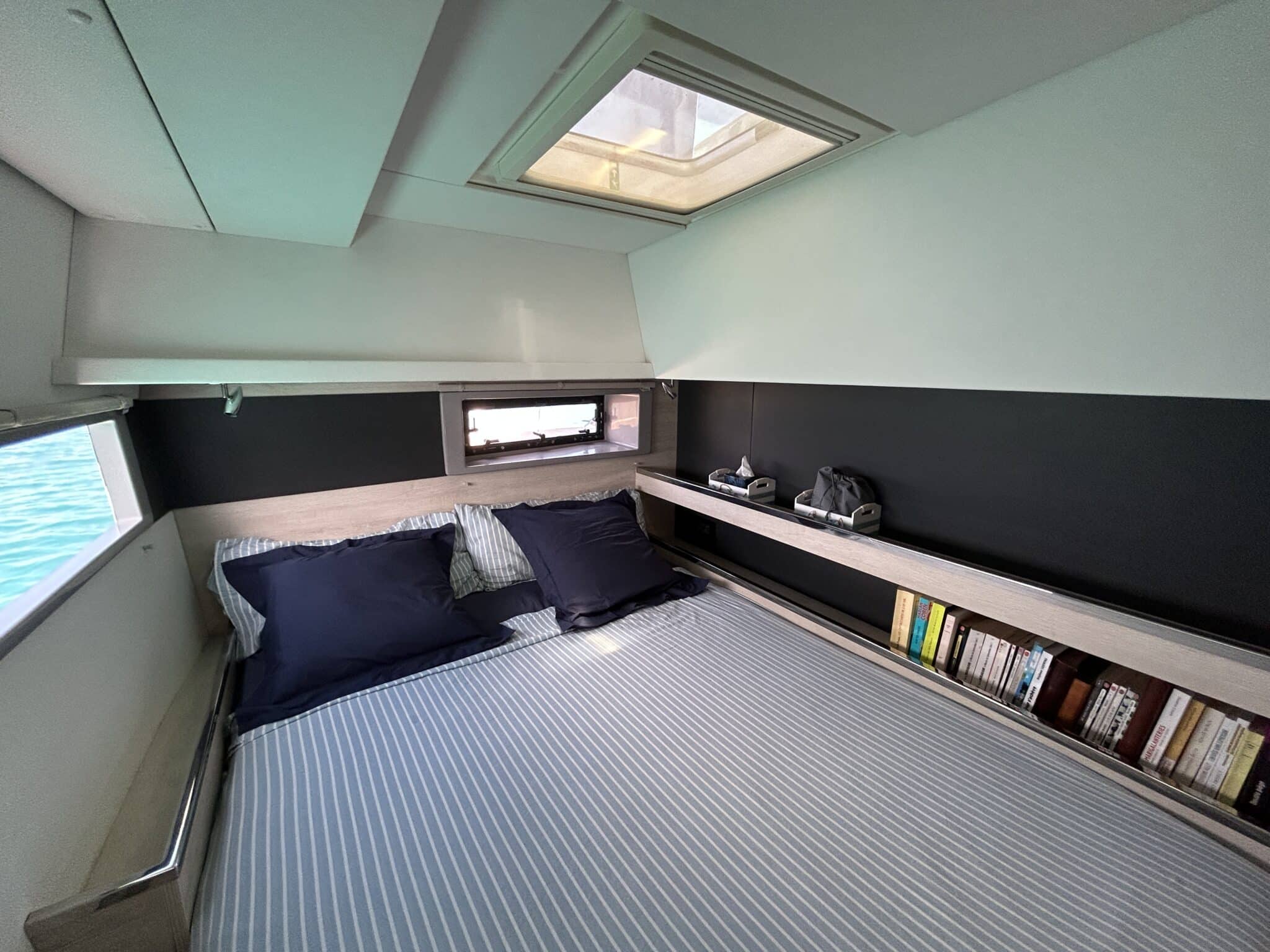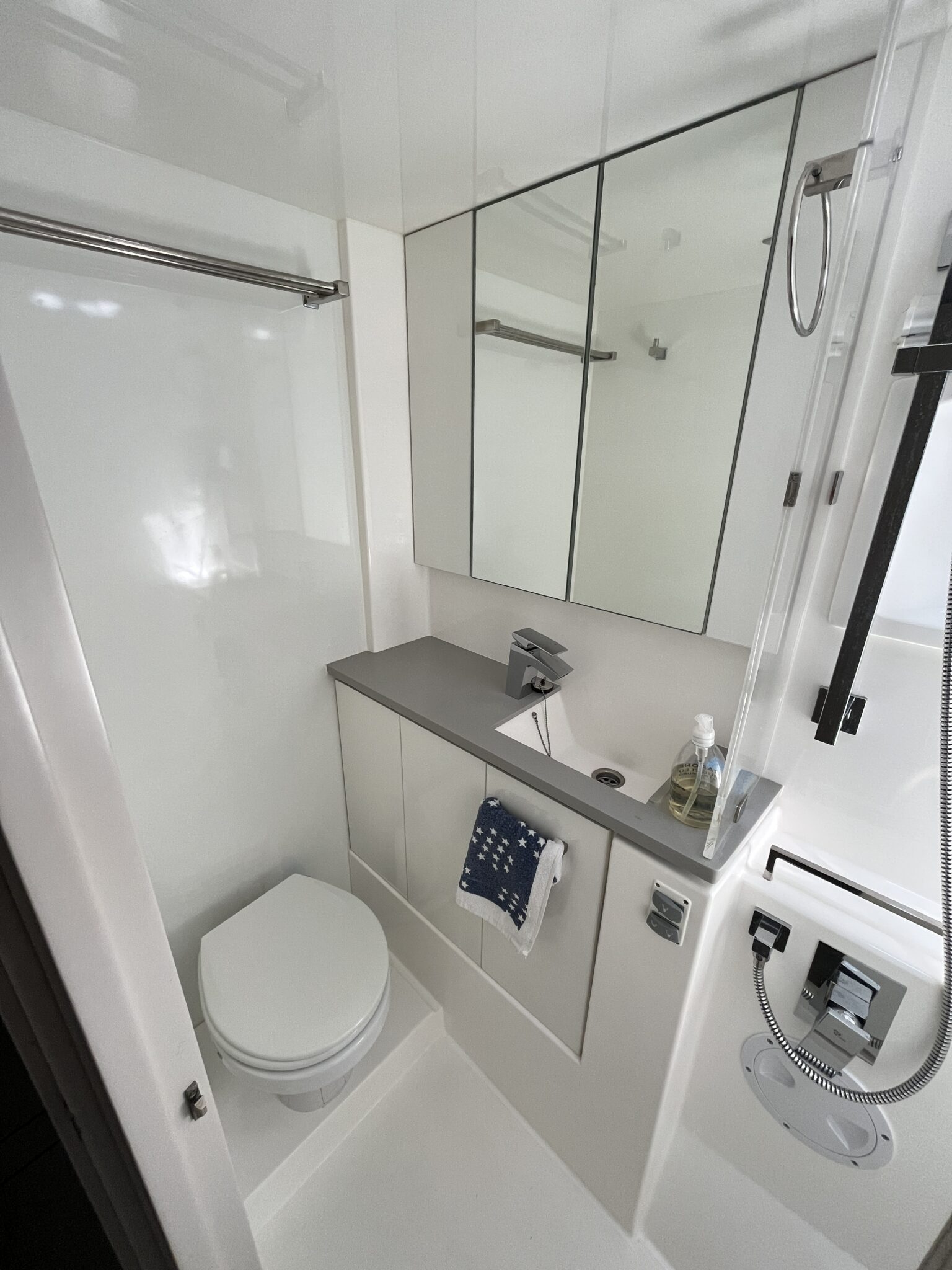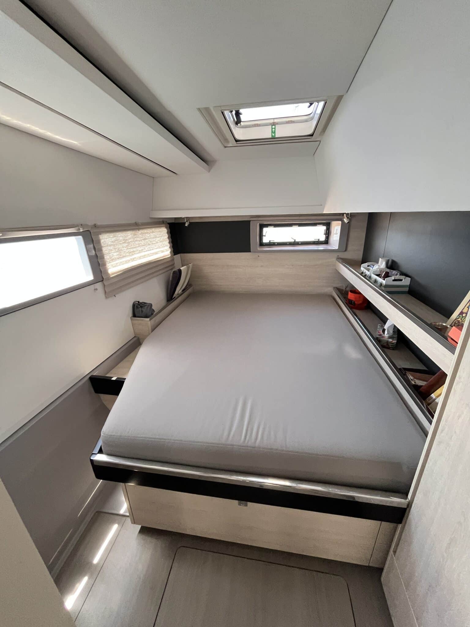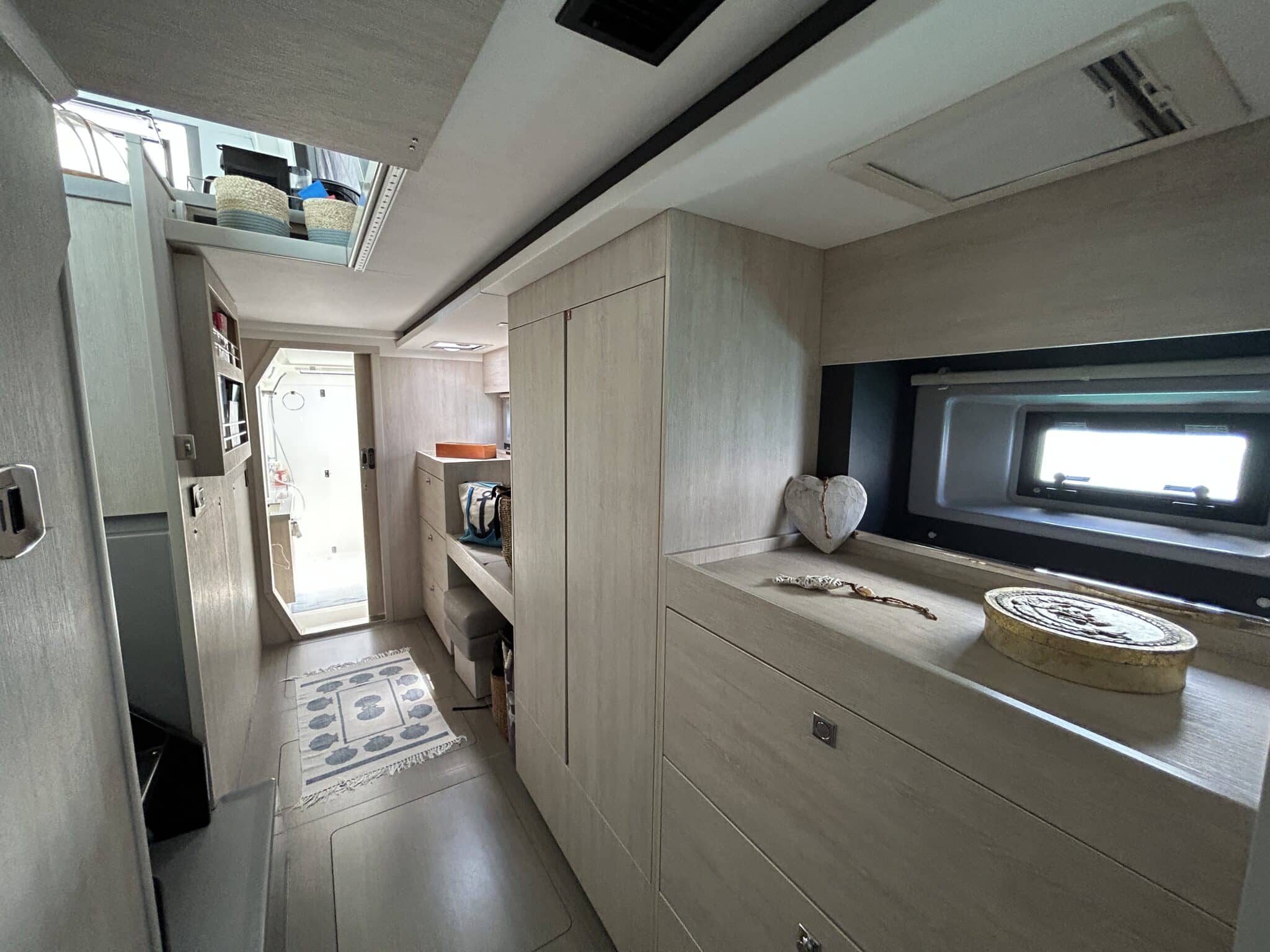 Spacious owner’s suite on starboard: cabin with double berth (1.50×2.05 m), desk, numerous storage spaces, bathroom with large shower and electric toilet