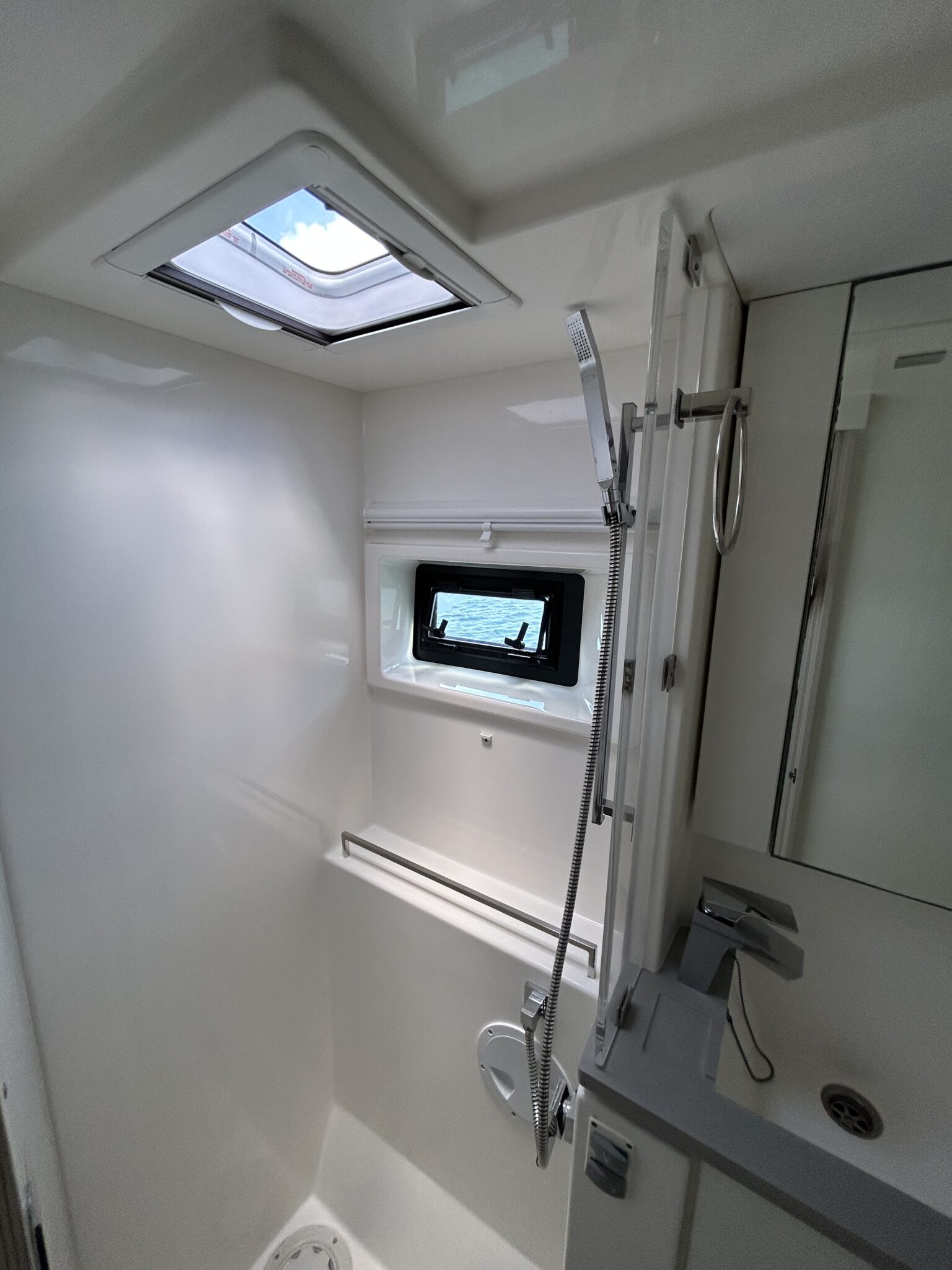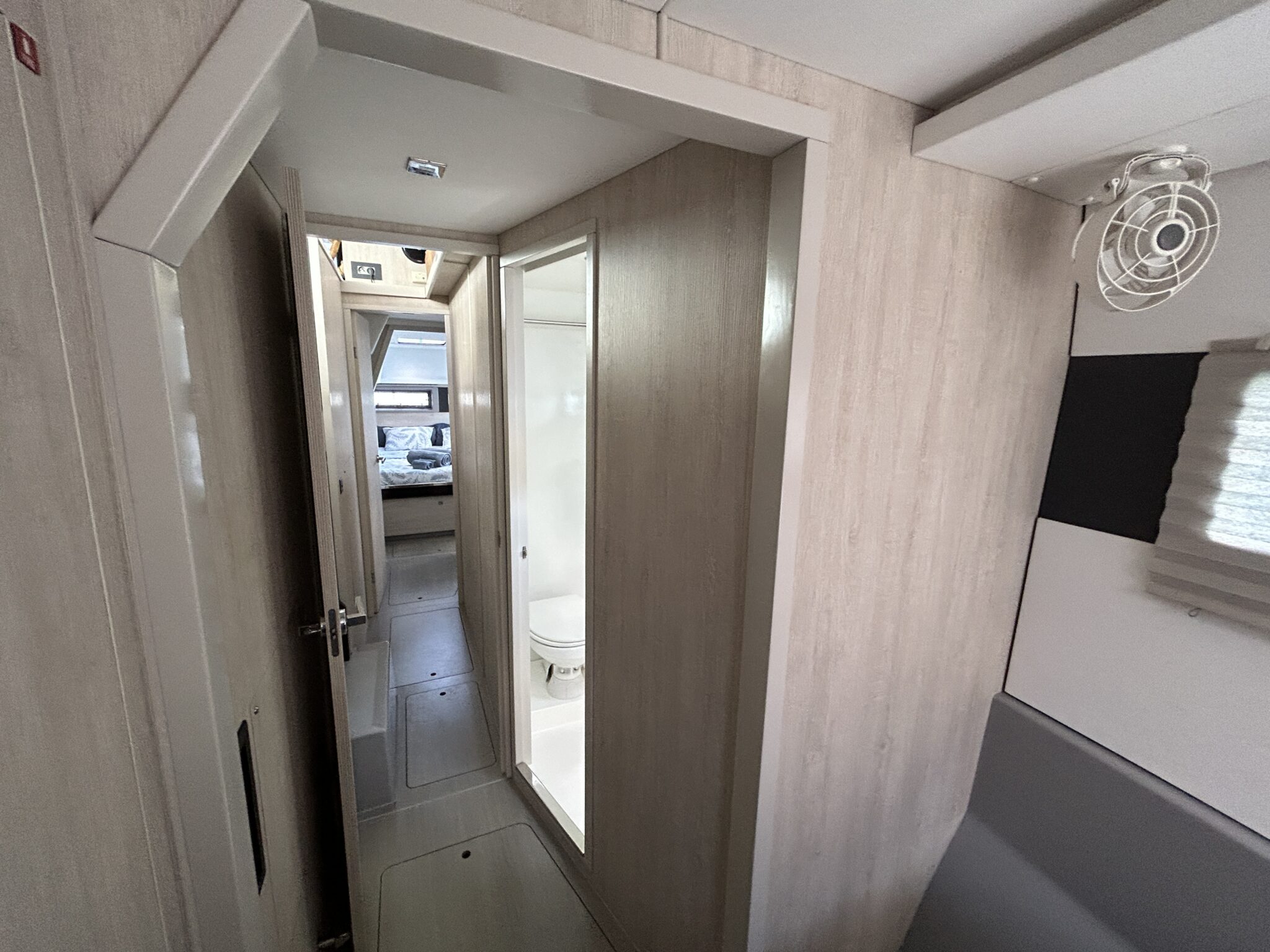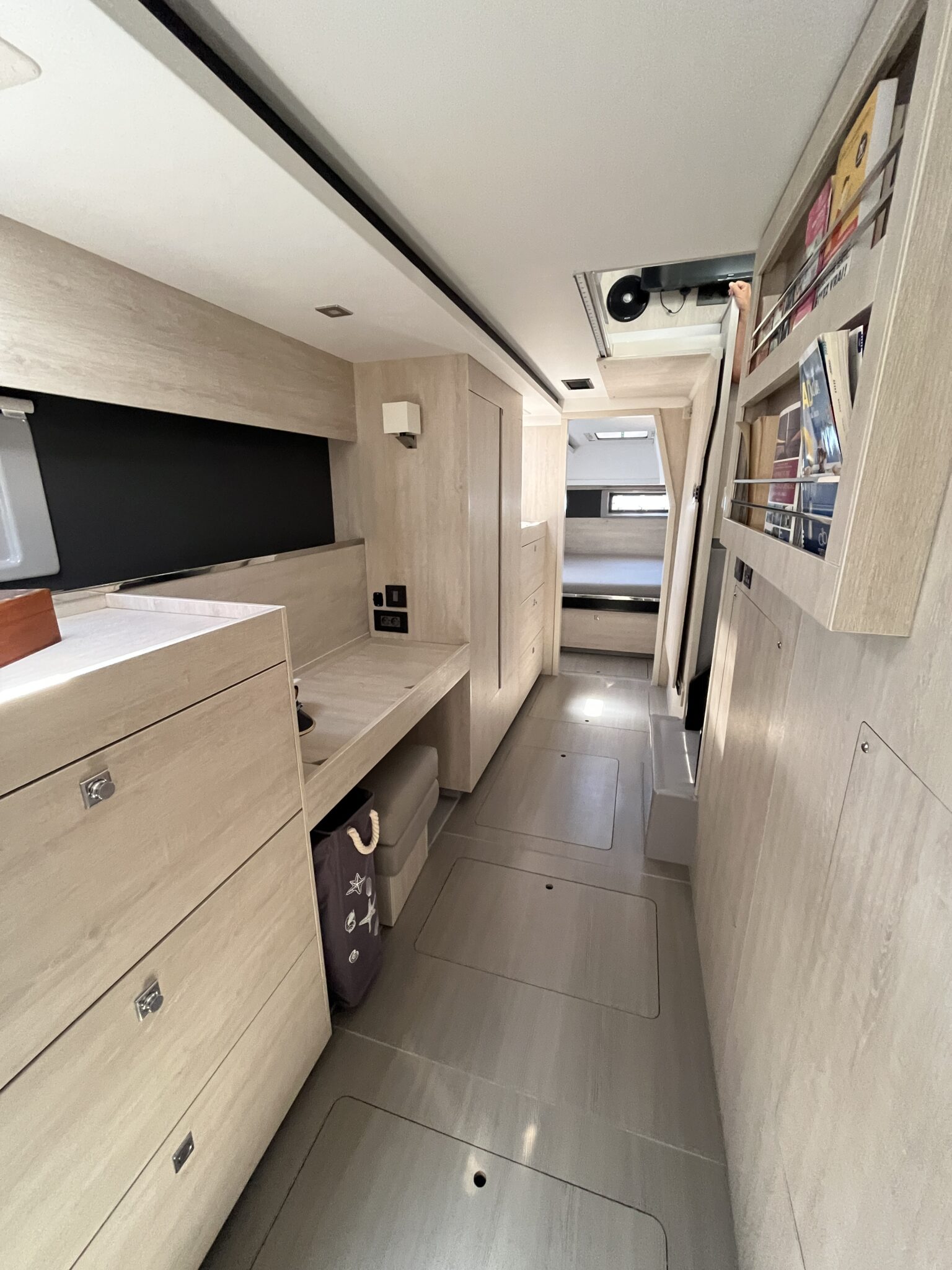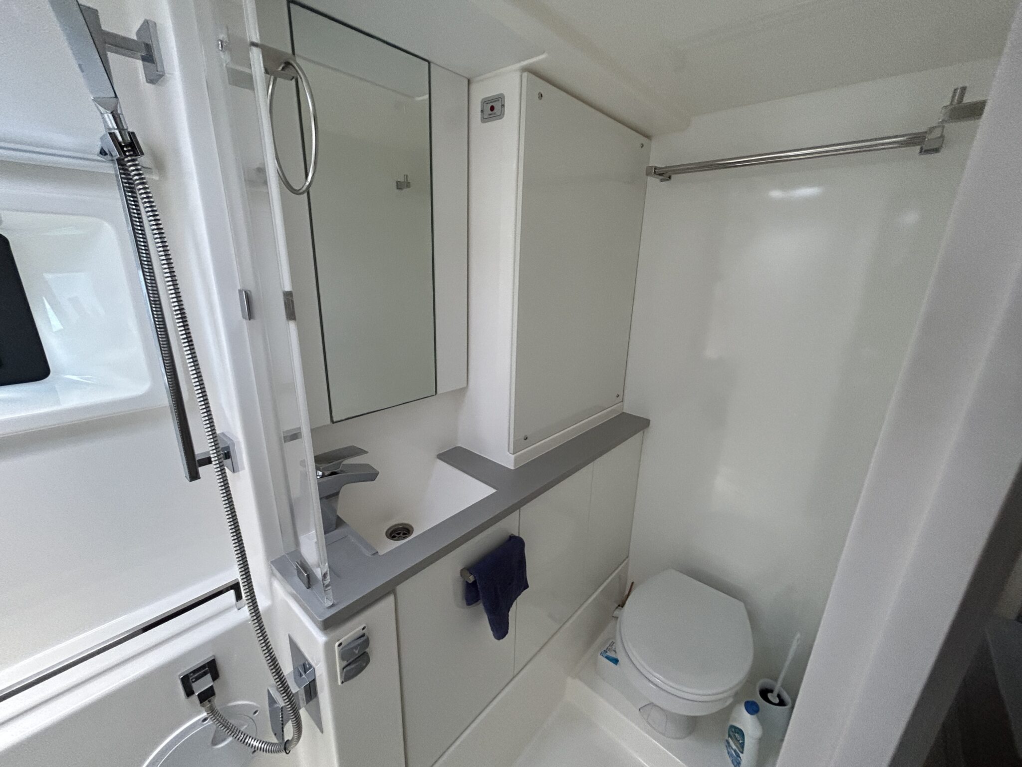 Spacious owner’s suite on starboard: cabin with double berth (1.50×2.05 m), desk, numerous storage spaces, bathroom with large shower and electric toilet