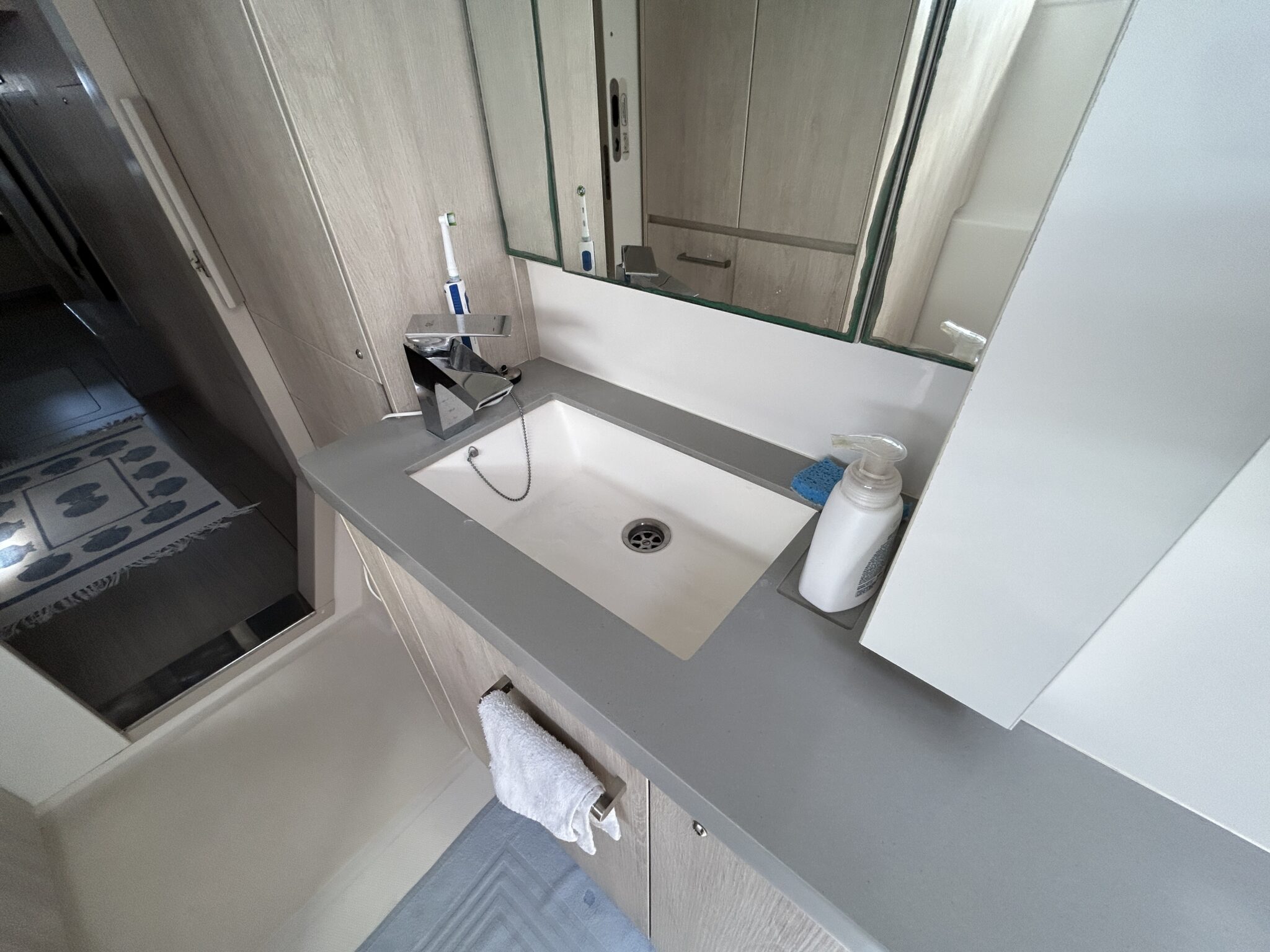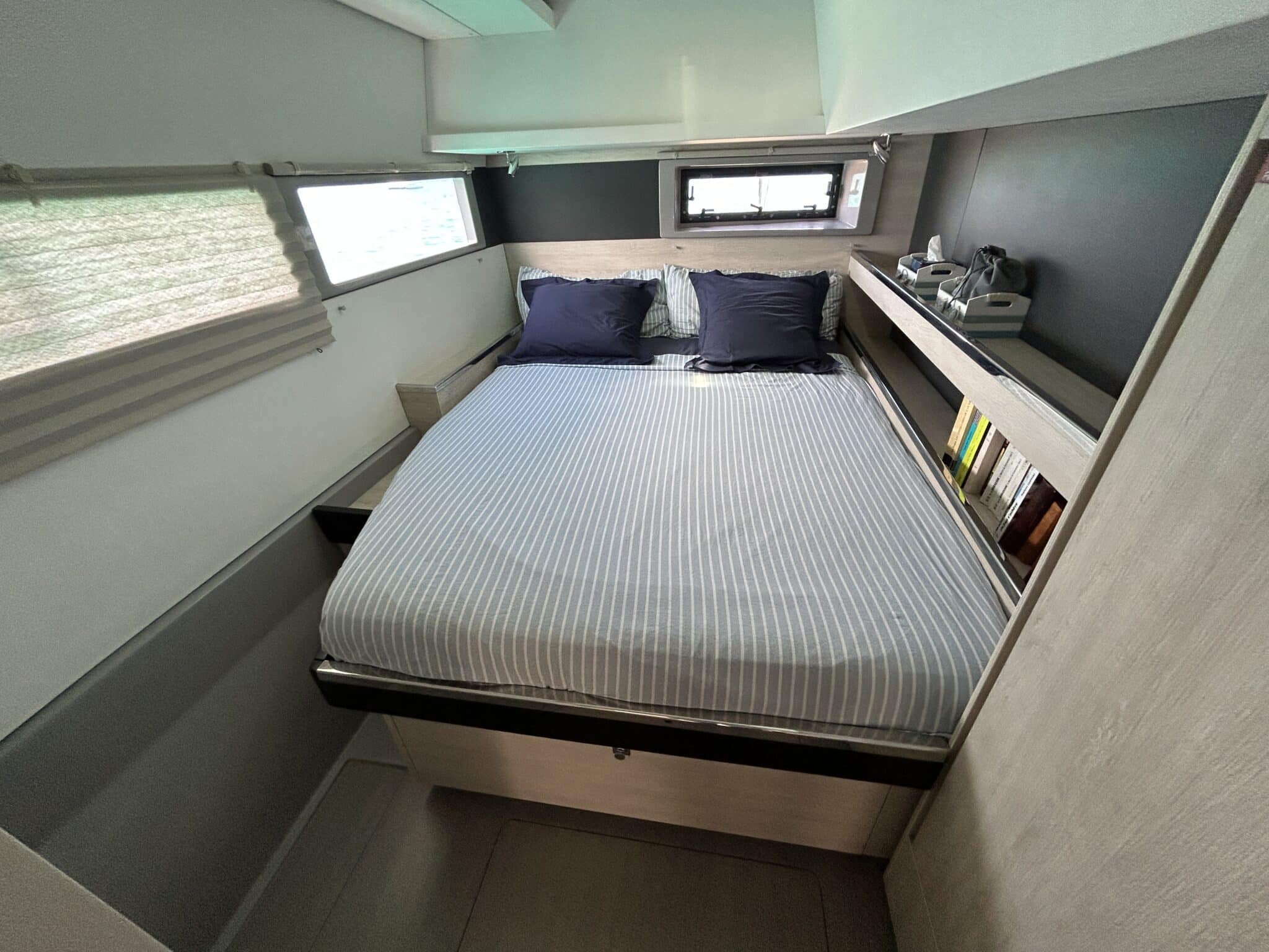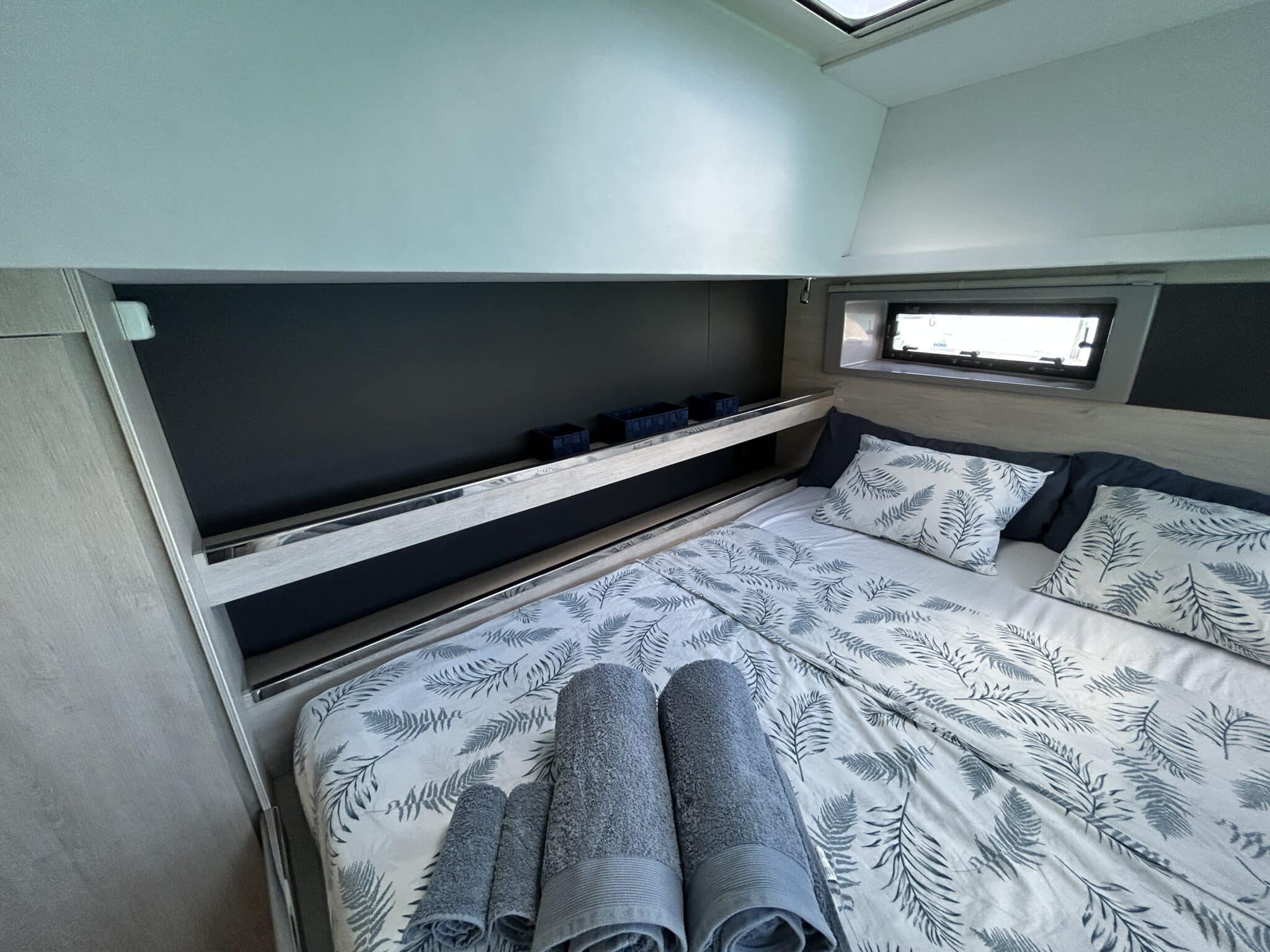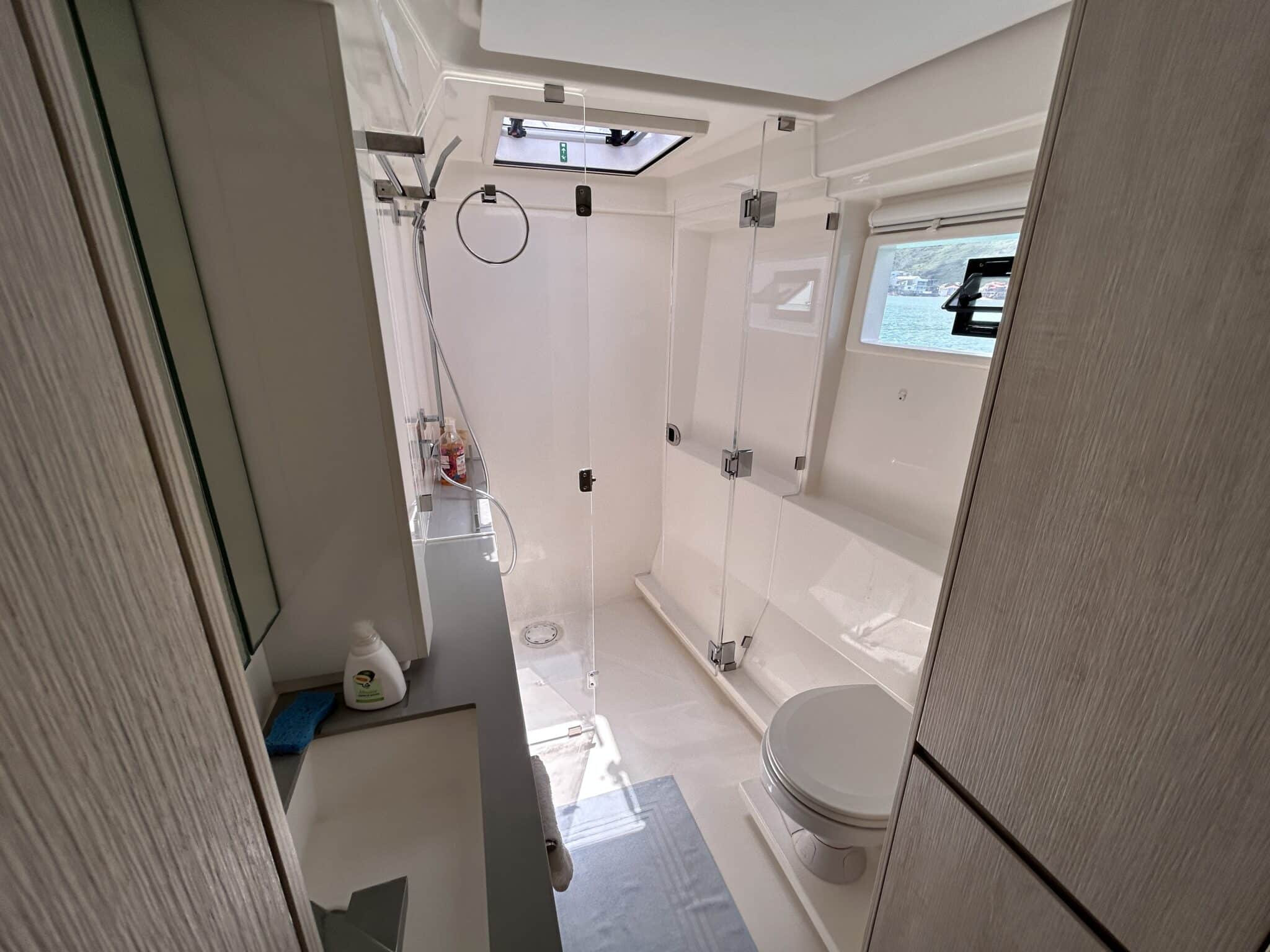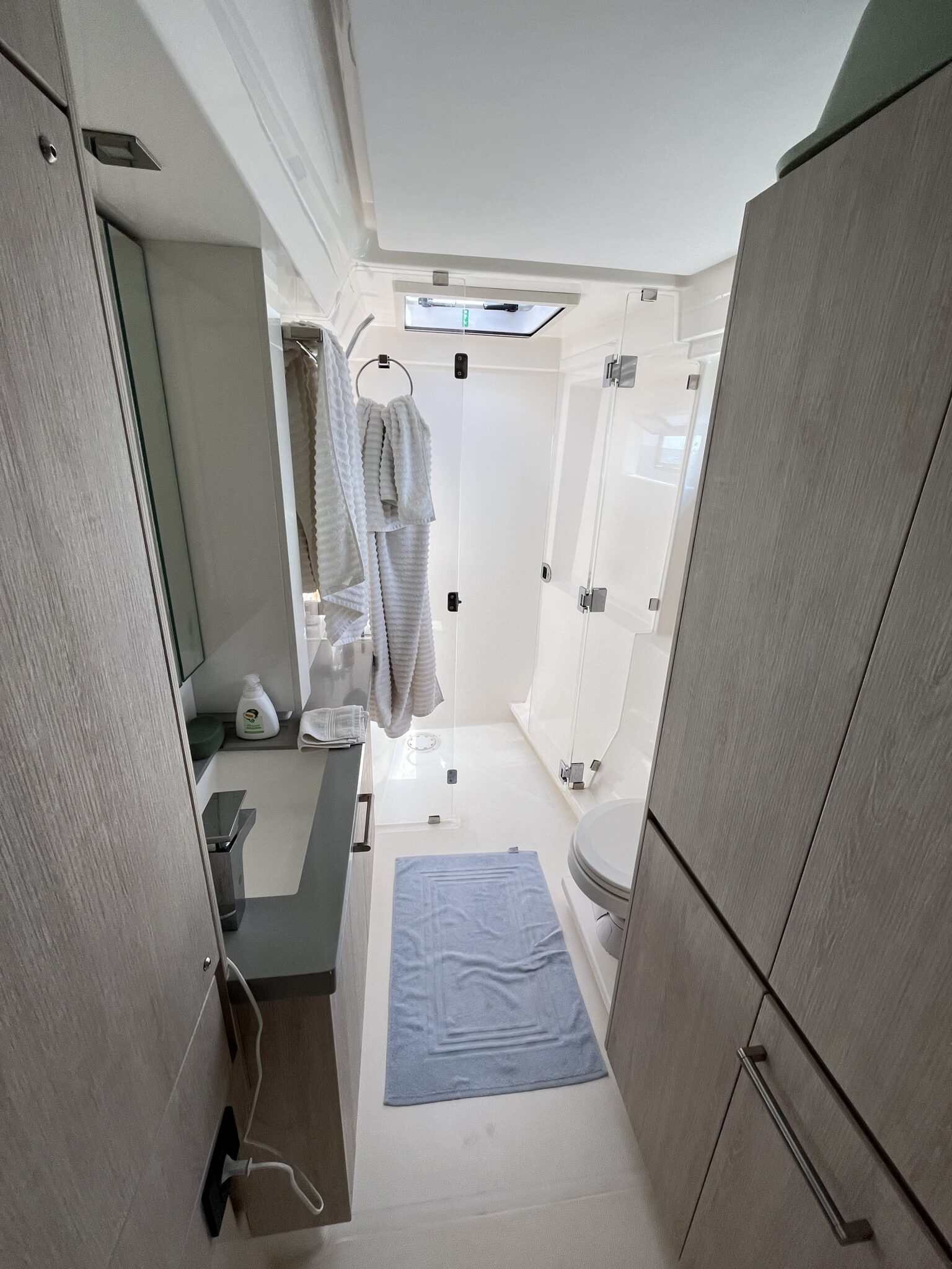 Spacious owner’s suite on starboard: cabin with double berth (1.50×2.05 m), desk, numerous storage spaces, bathroom with large shower and electric toilet