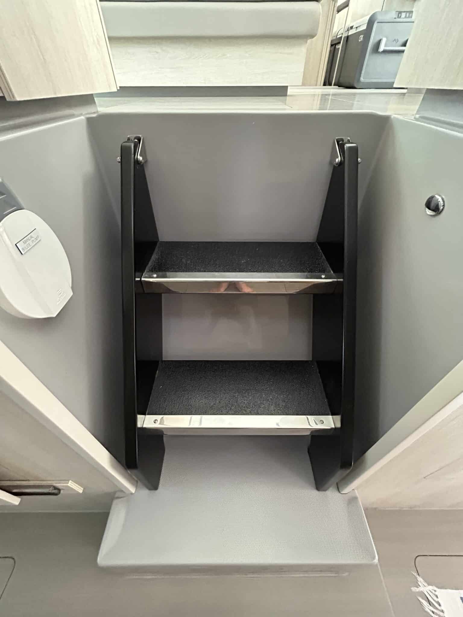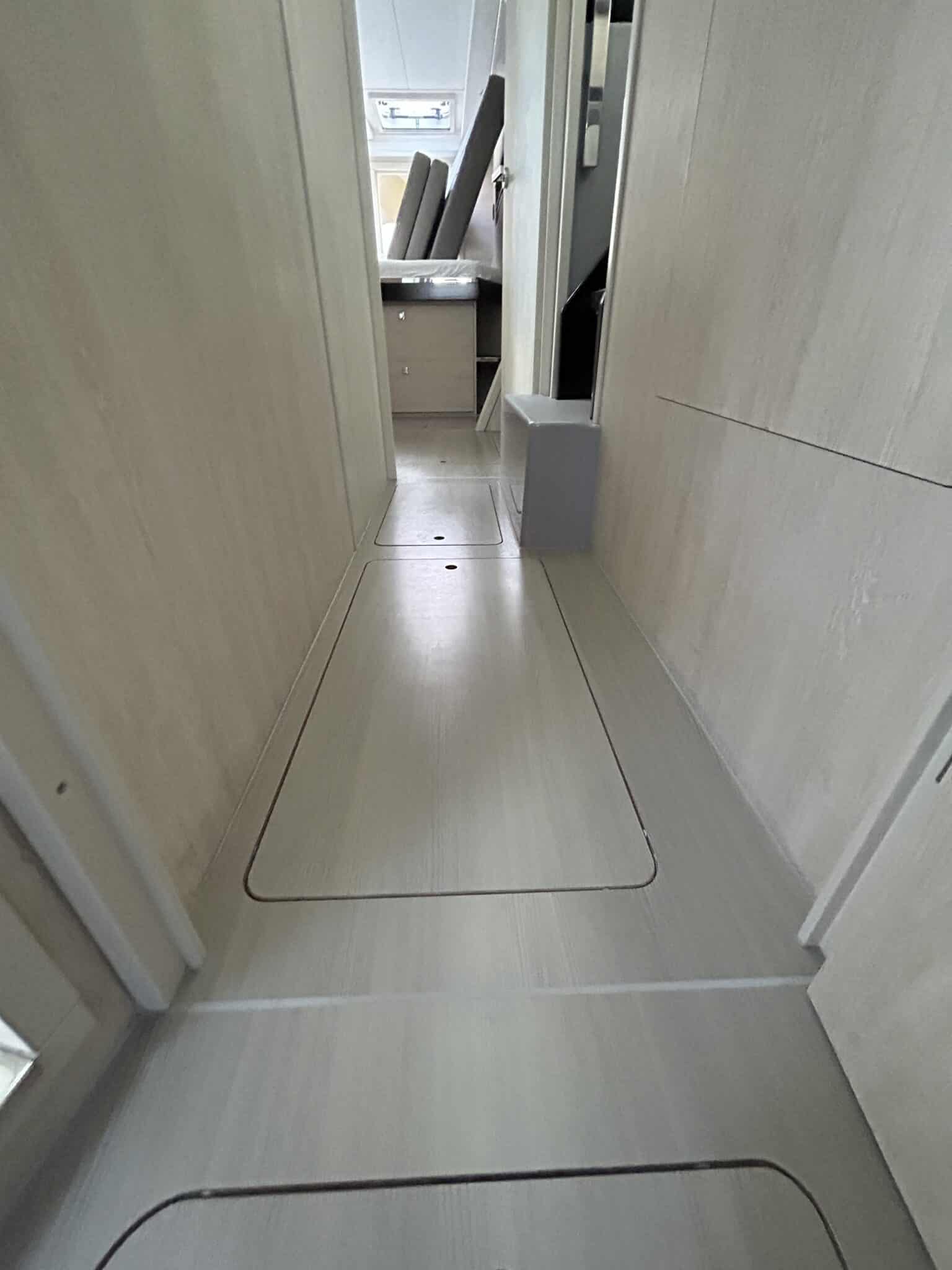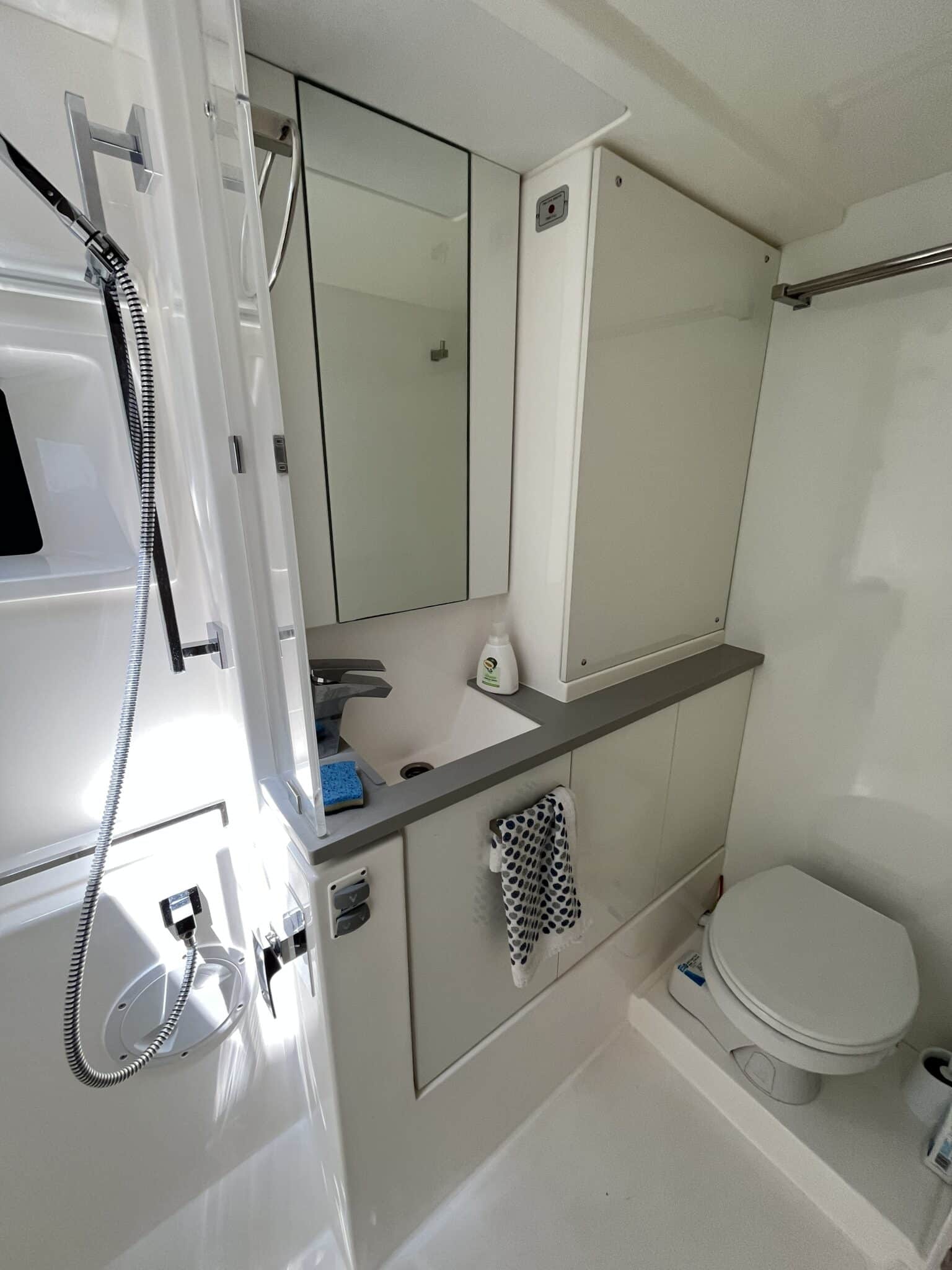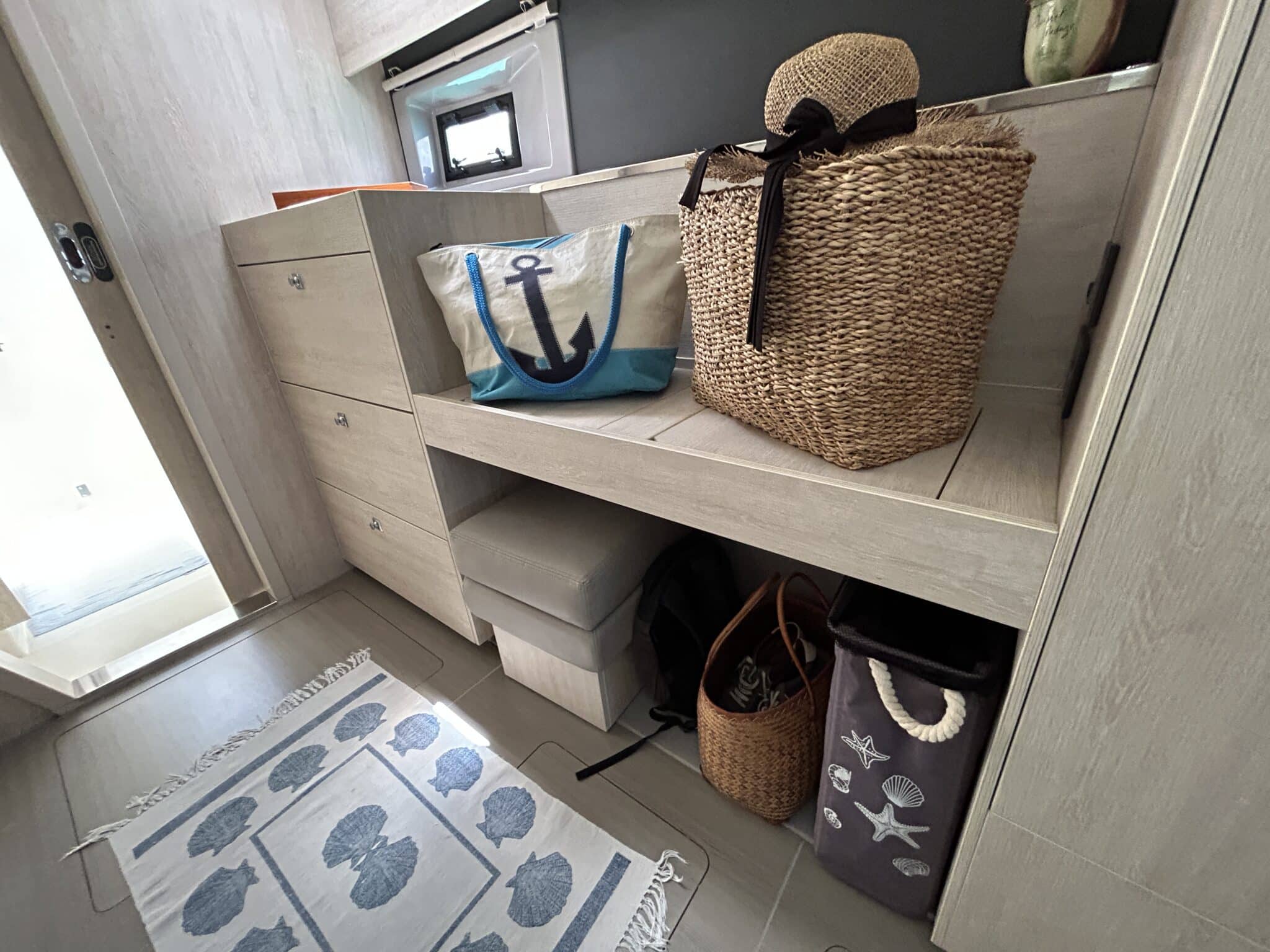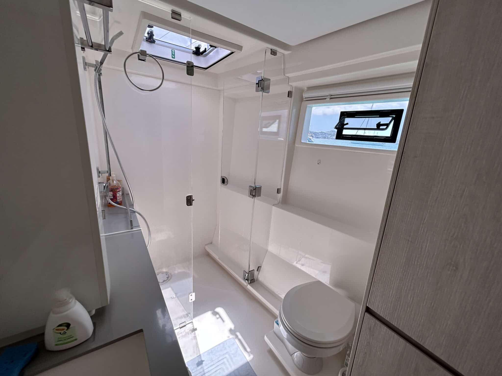 Spacious owner’s suite on starboard: cabin with double berth (1.50×2.05 m), desk, numerous storage spaces, bathroom with large shower and electric toilet