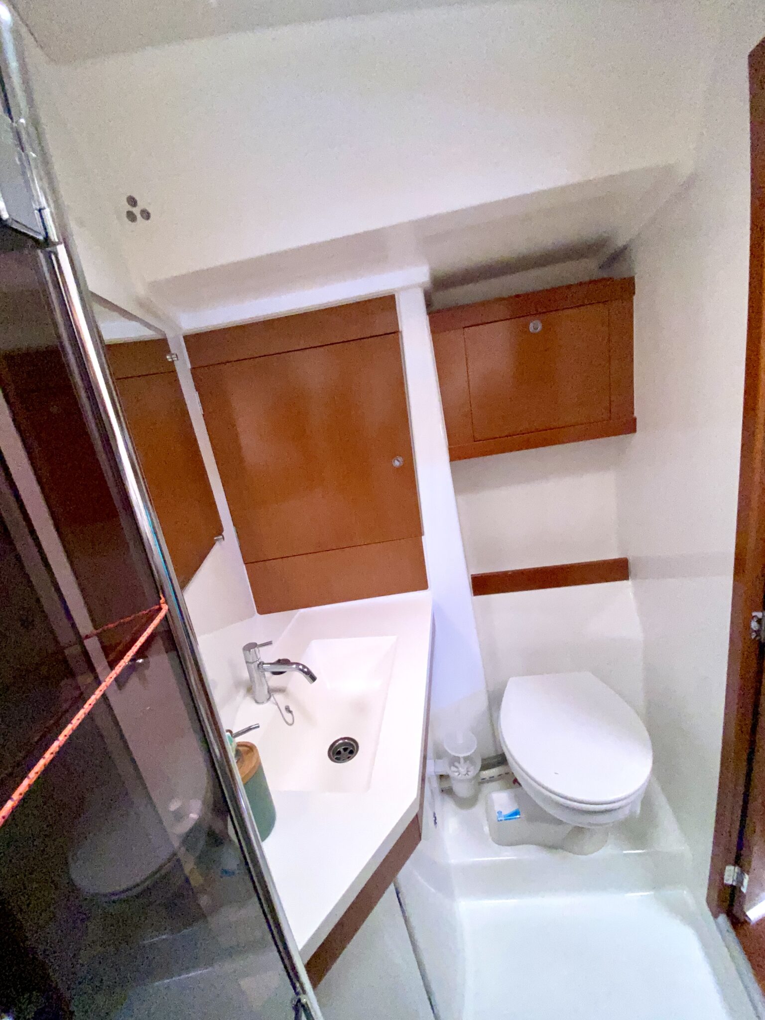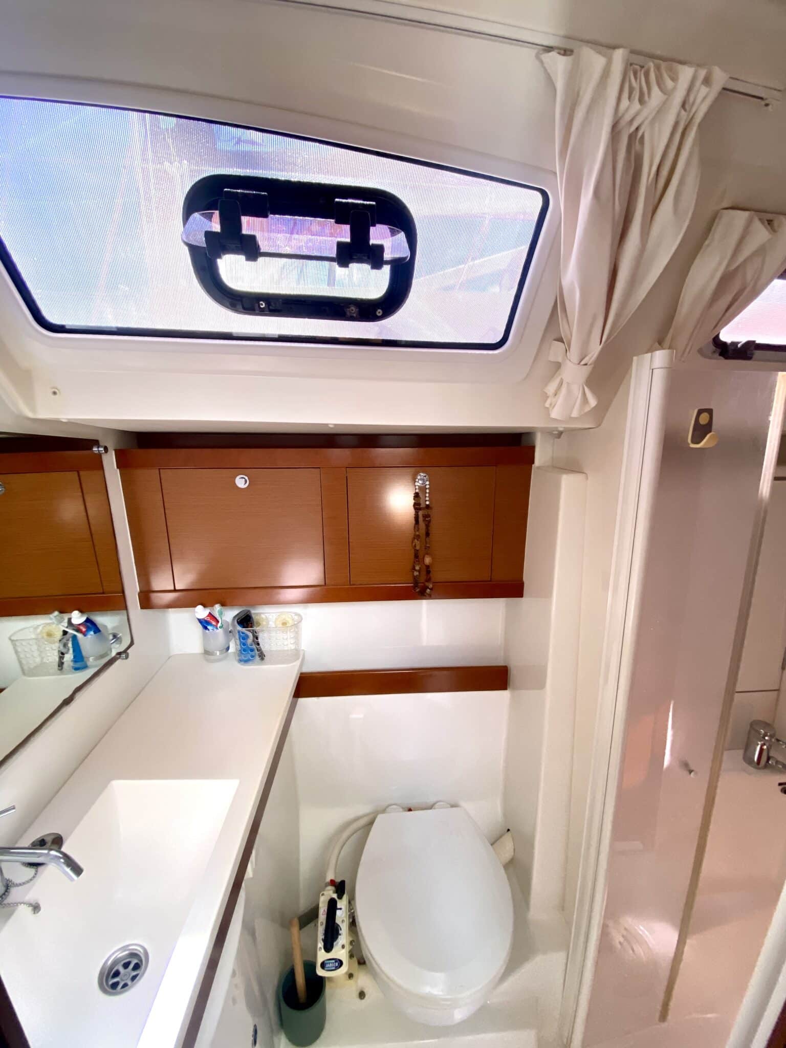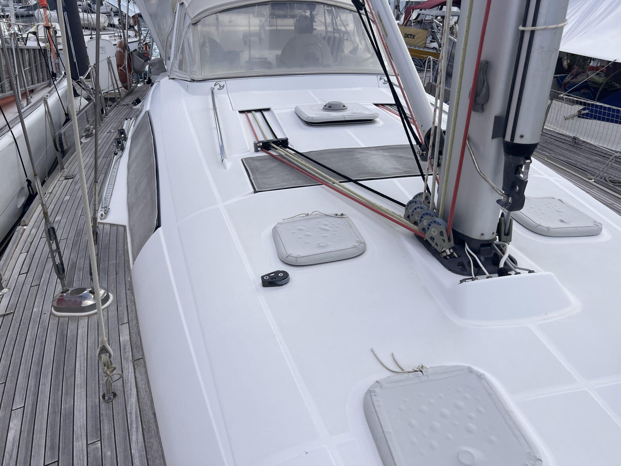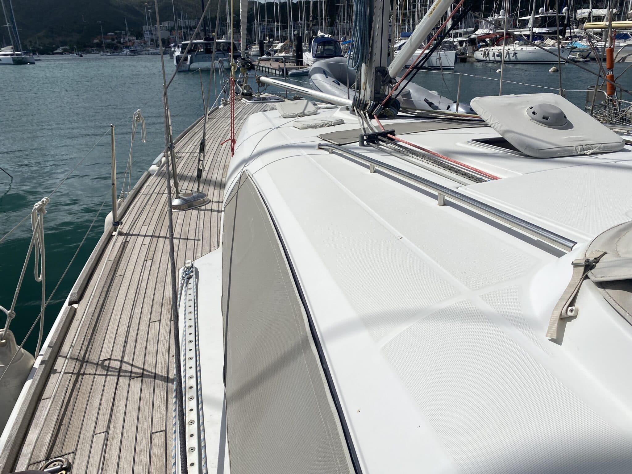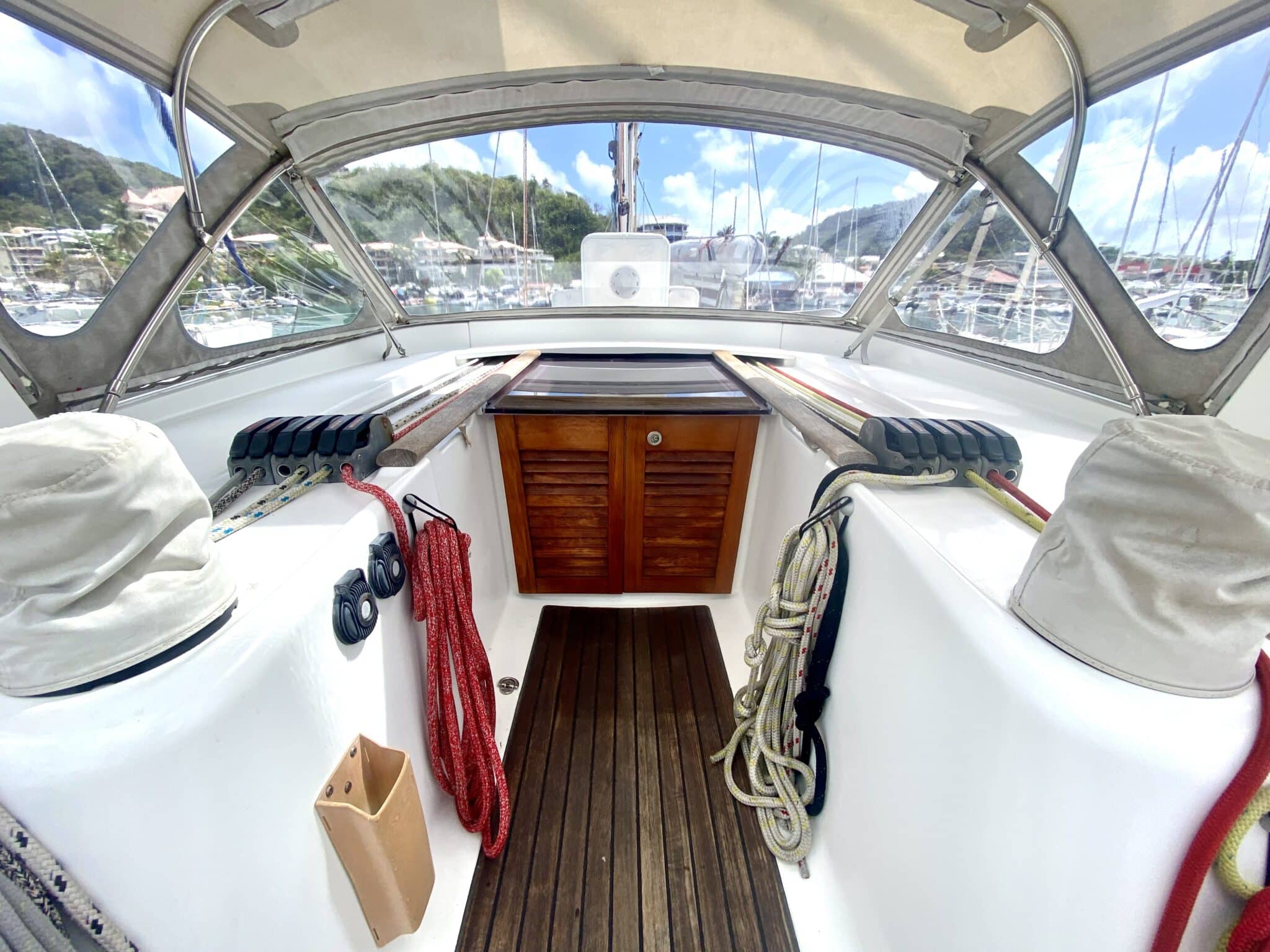 Big sail locker on deck. Salt water pump inside. Access to the chain. 2 Sails on it. 2 chairs.