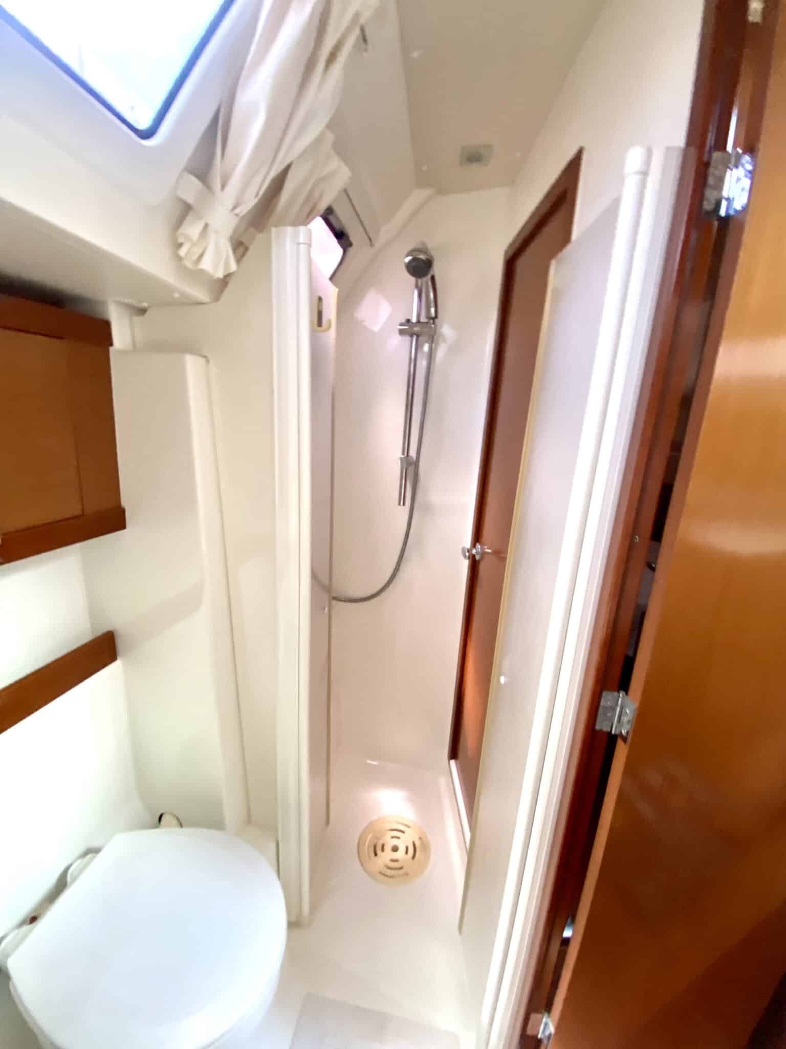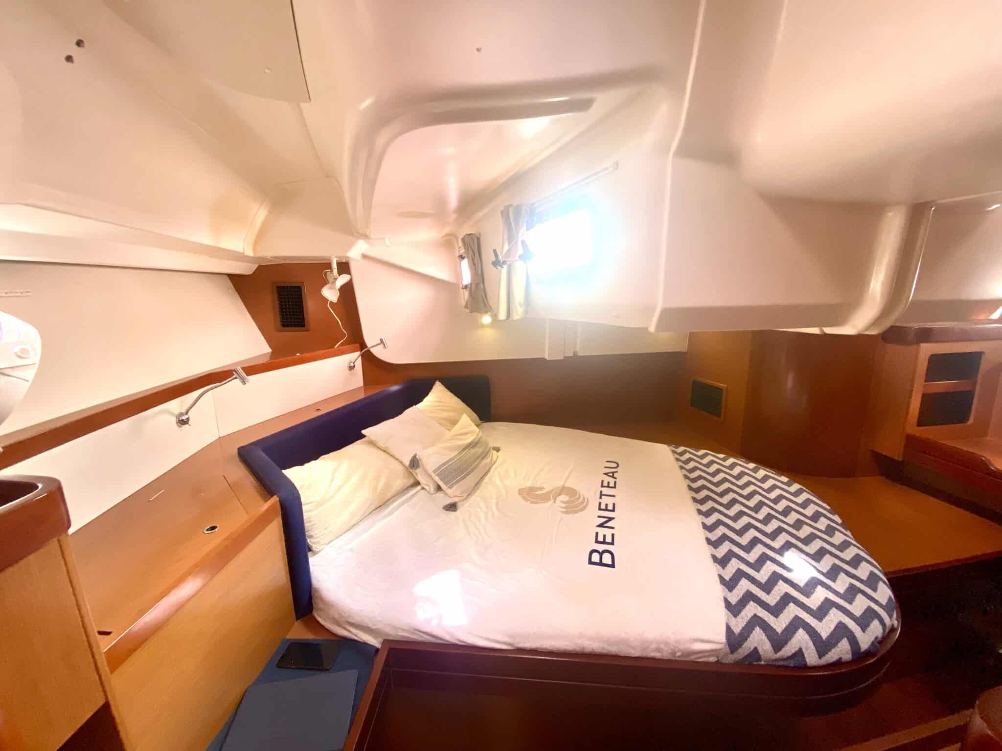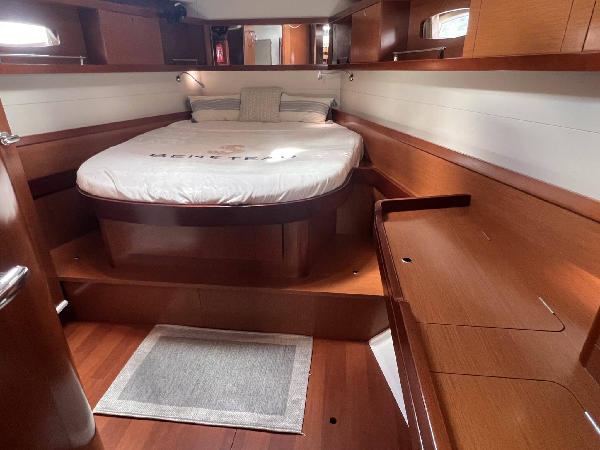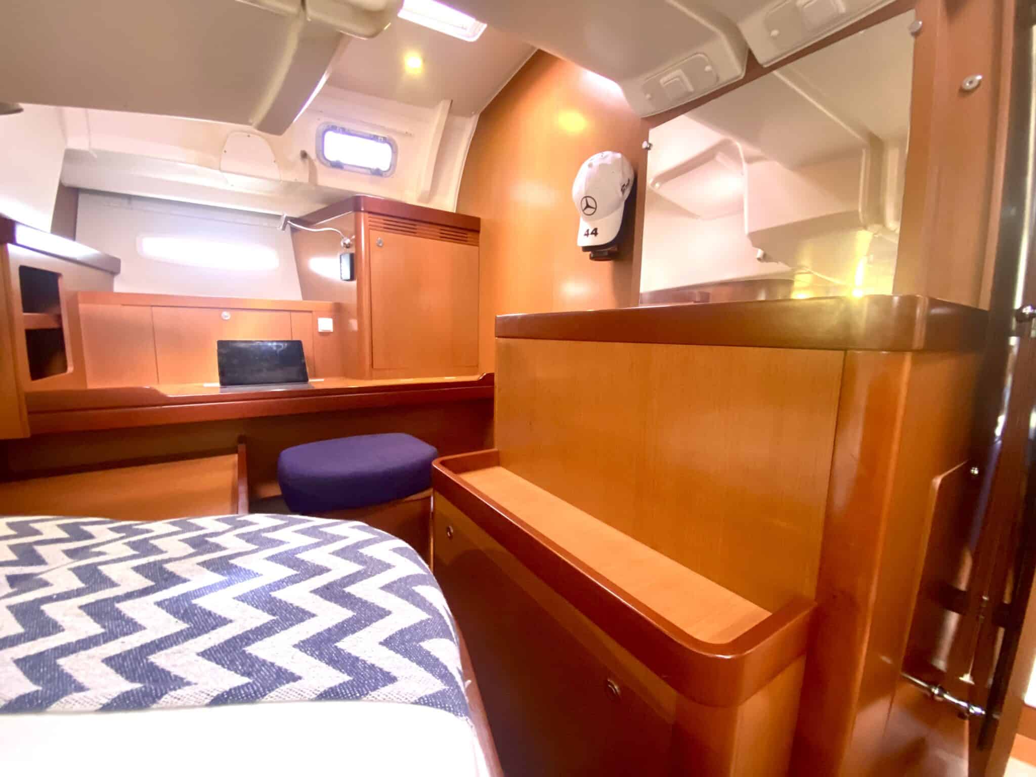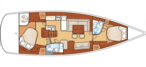 Sail locker at the front accessible from the deck. Large cockpit with double helm station.