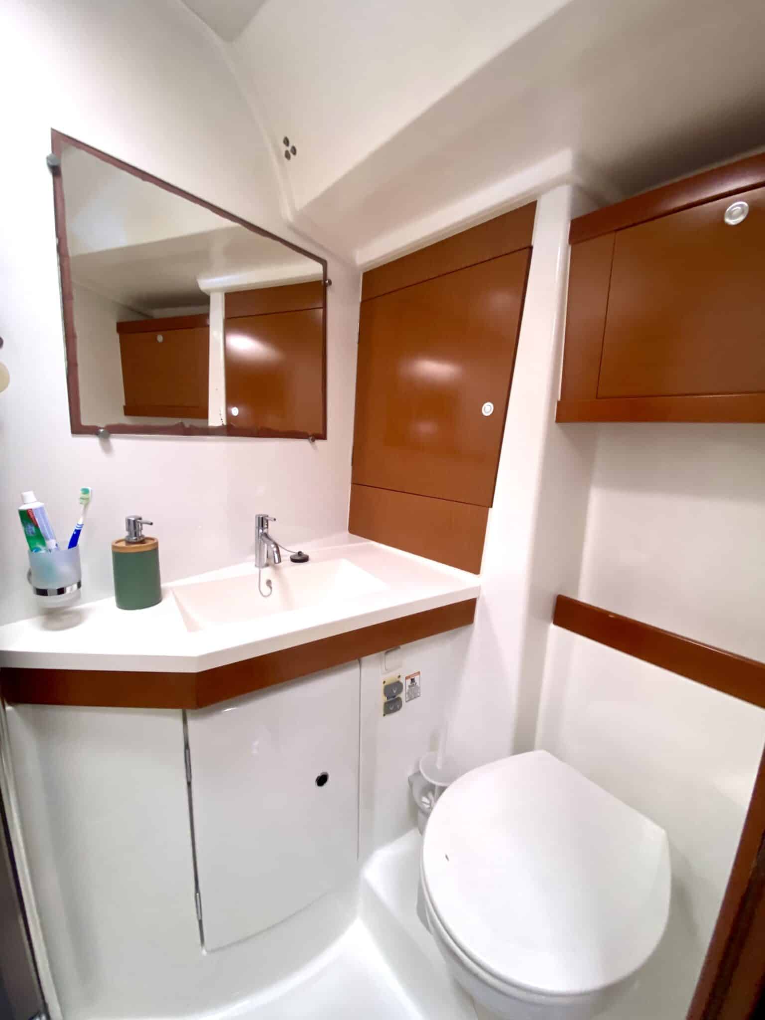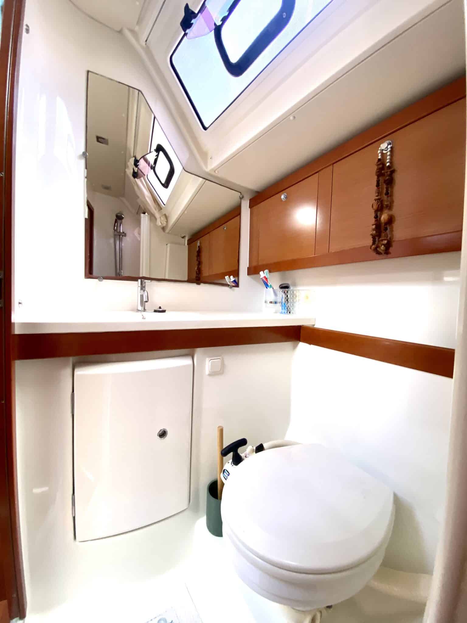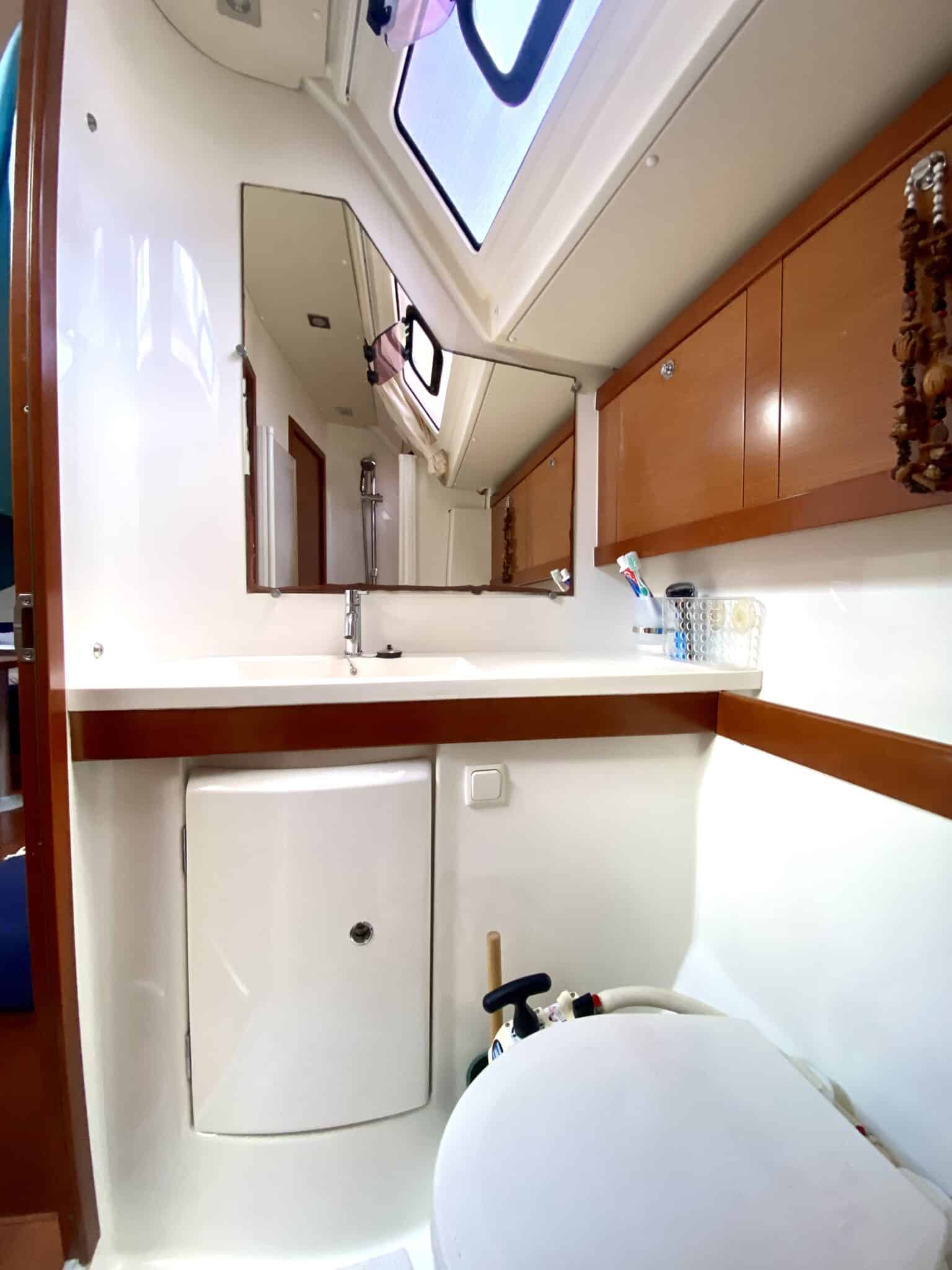 Sail locker at the front accessible from the deck. Large cockpit with double helm station.
