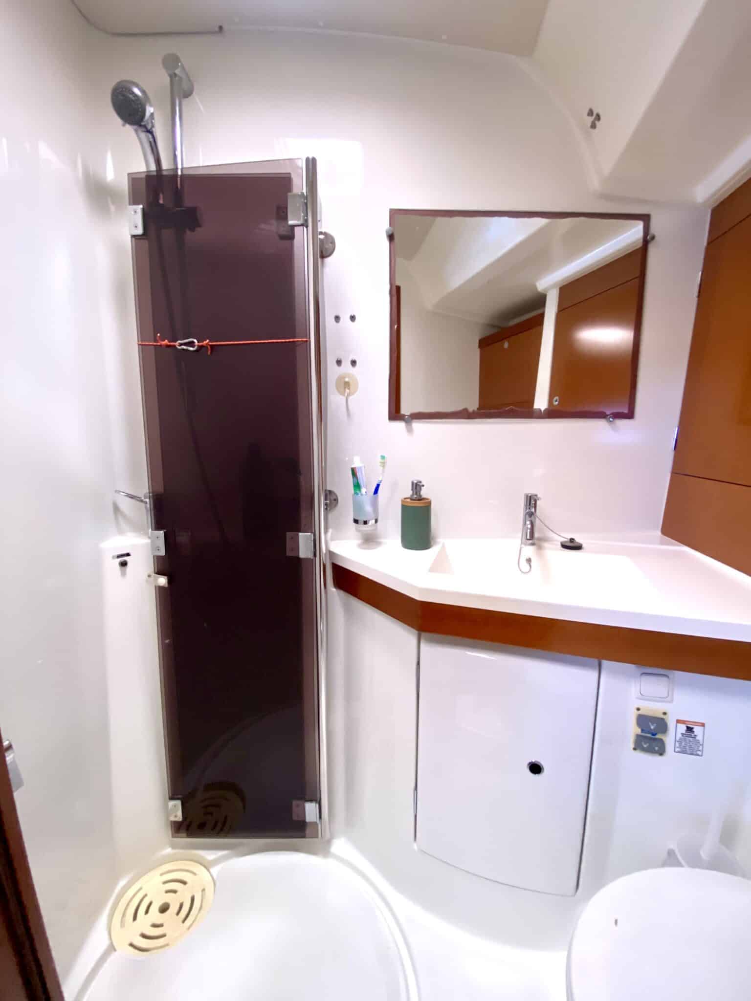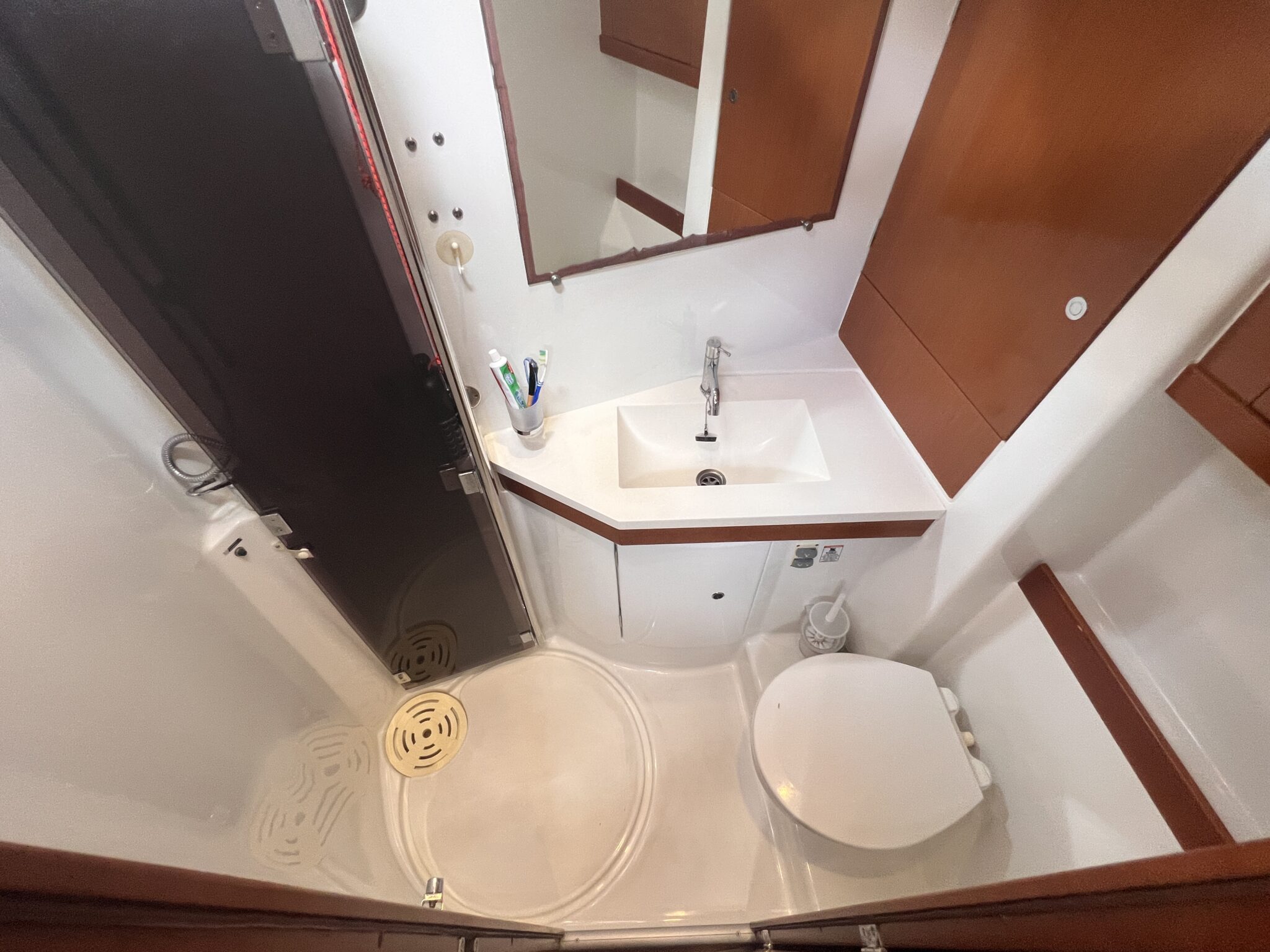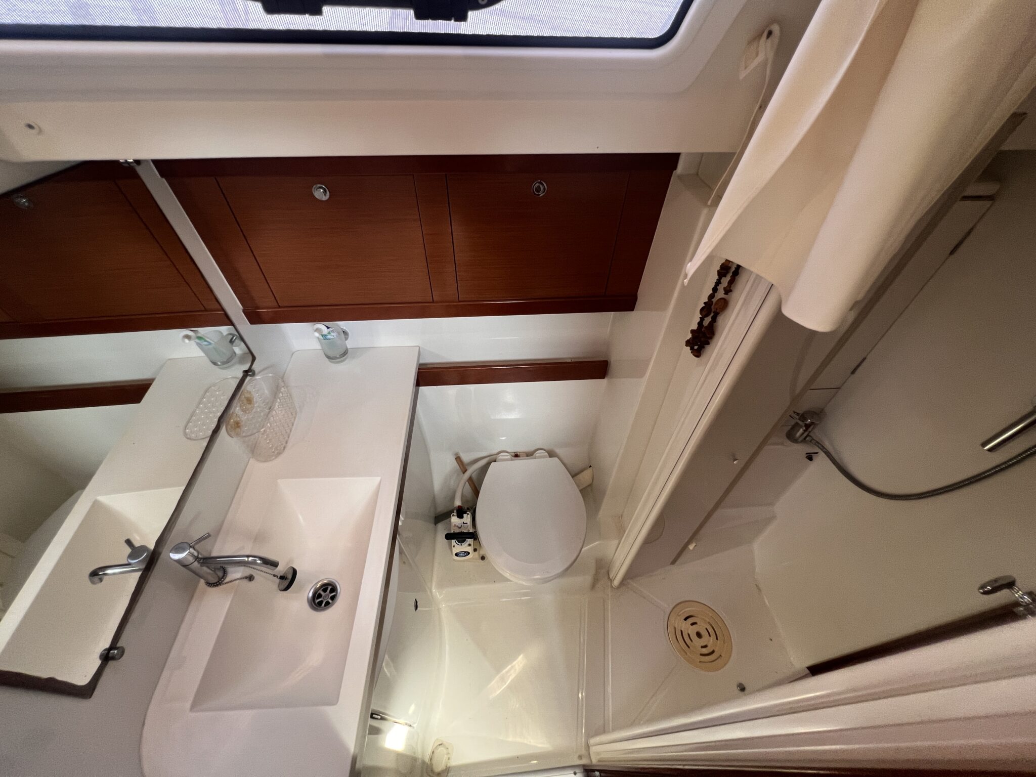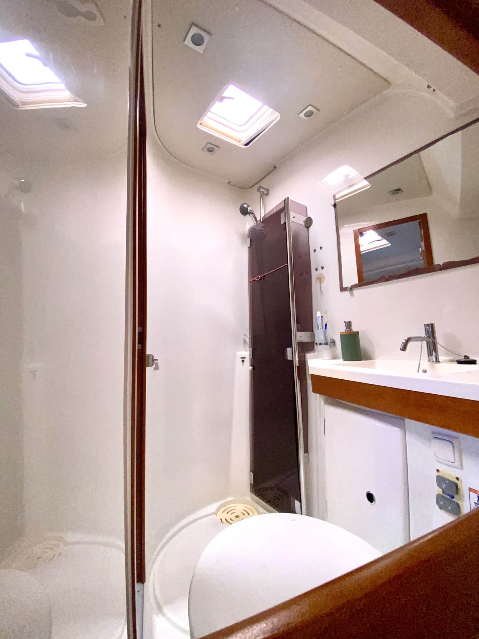Sail locker at the front accessible from the deck. Large cockpit with double helm station.