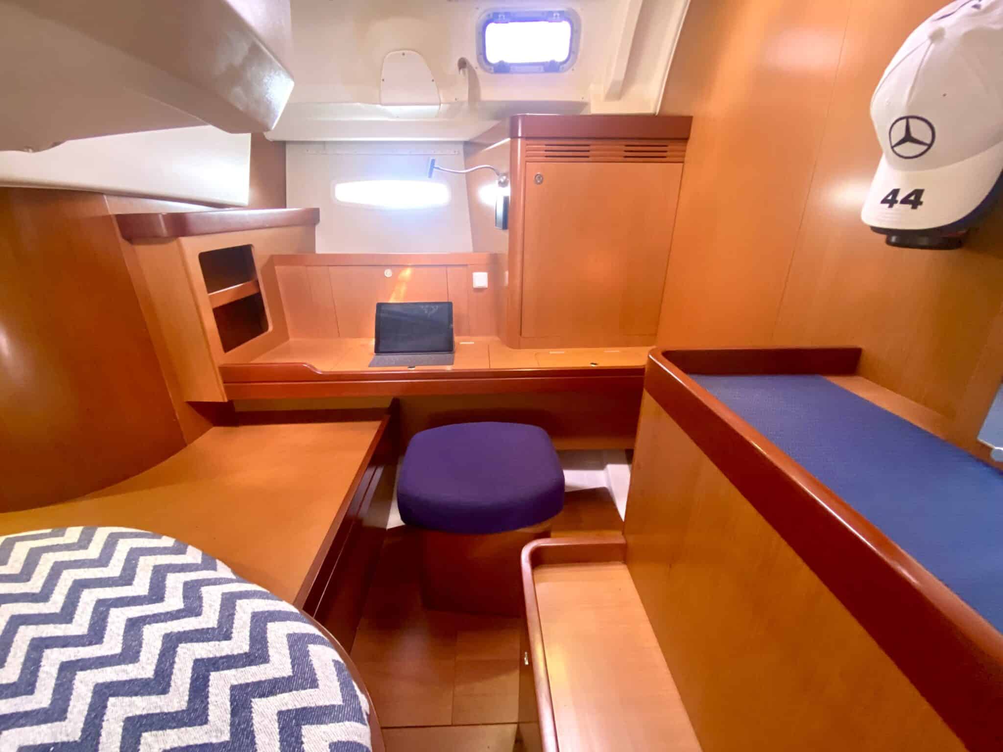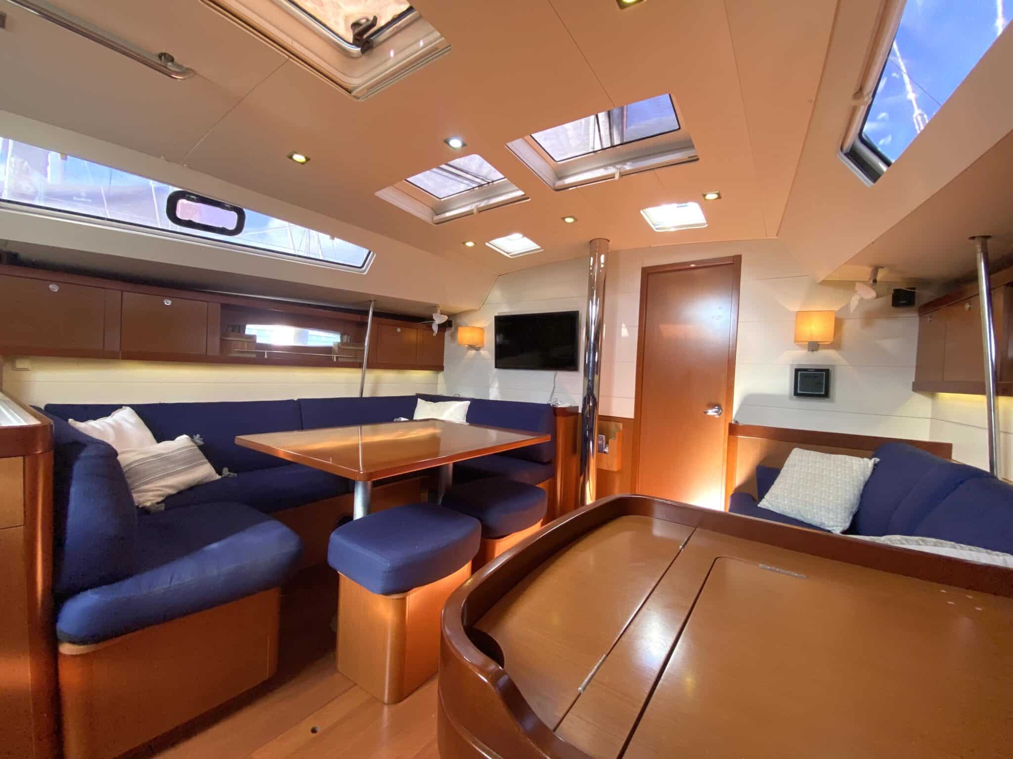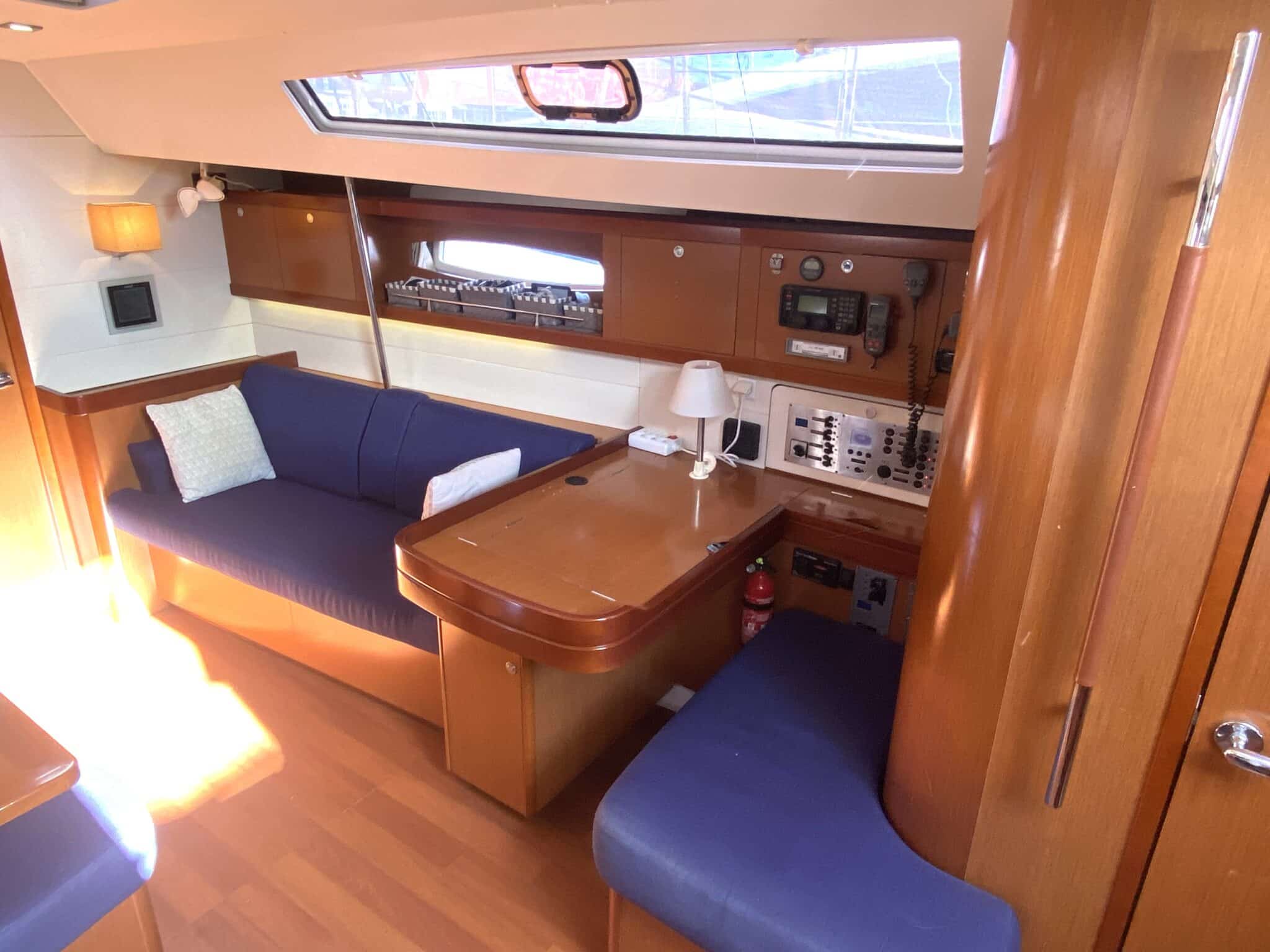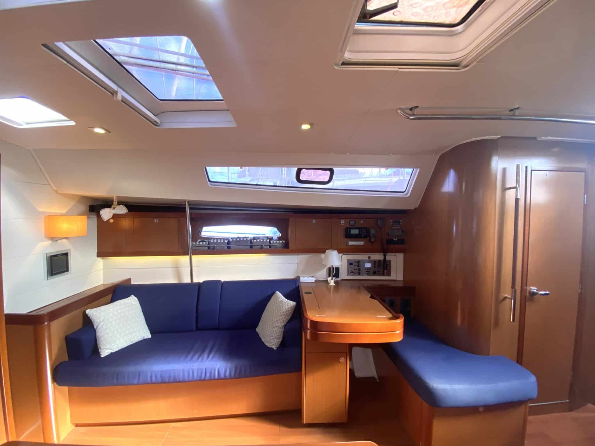 Spacious saloon with chart table.