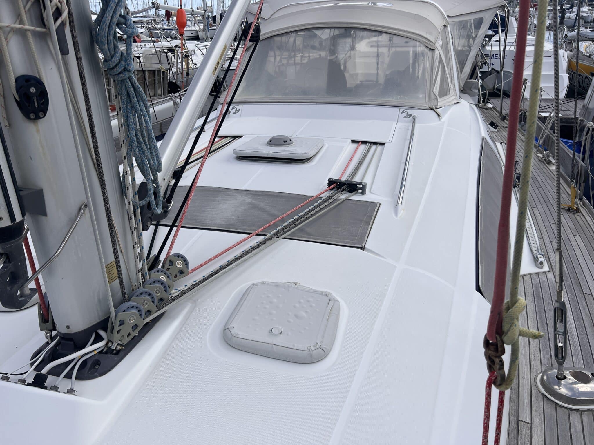 Numerous protective covers: saloon plexis, winches, helm, table, outboard engine, …
