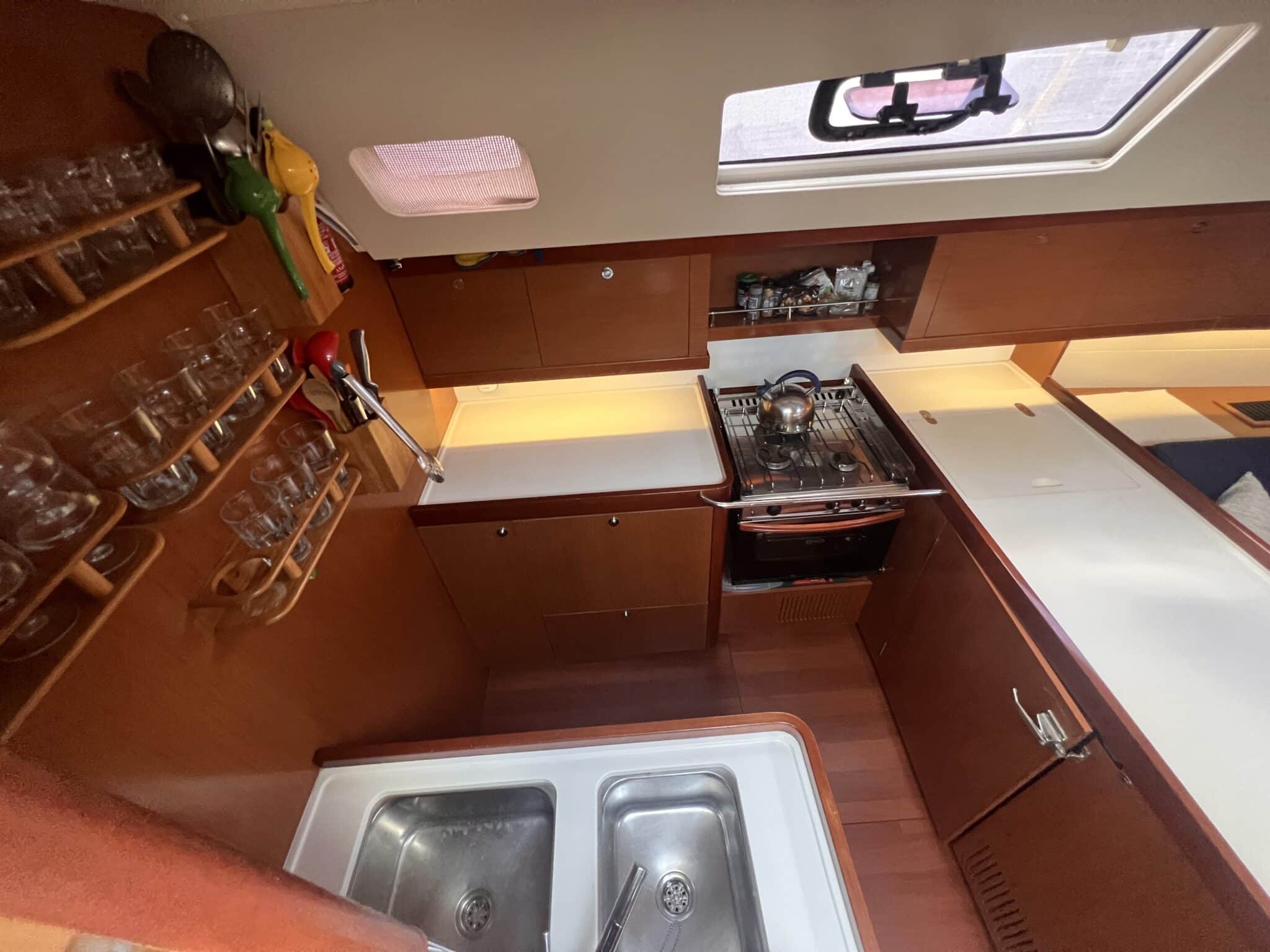 Custom designed wall storage for glasses and galley utensils.