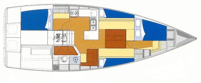 It is a typical “Blue Water” boat, seaworthy and simple in design, offering good water and fuel autonomy, with modern lines and great habitability. The compromise between comfort, speed and safety is ideal. The boat is efficient under sail and easy to handle with a reduced crew.